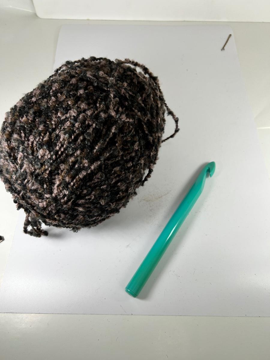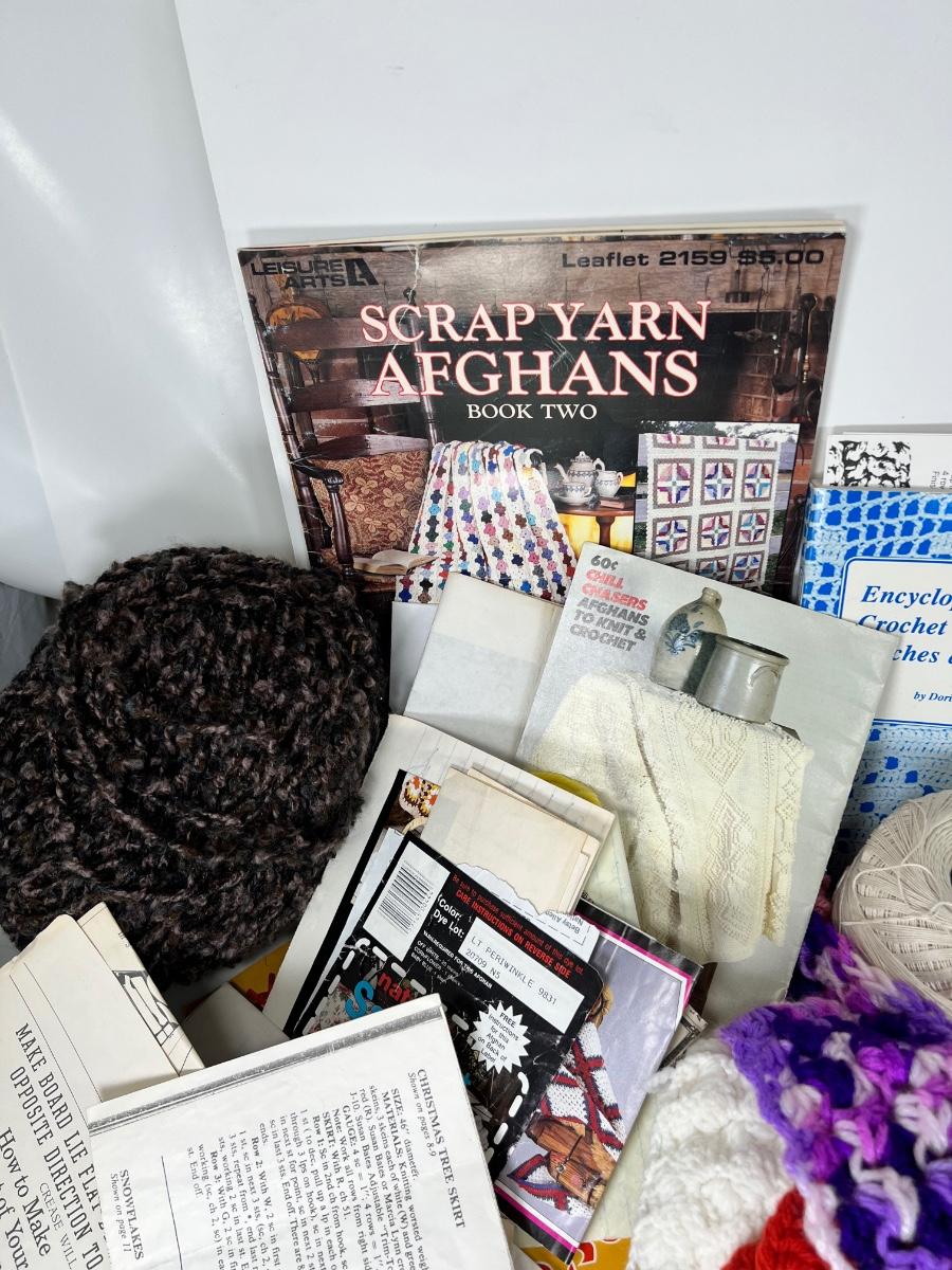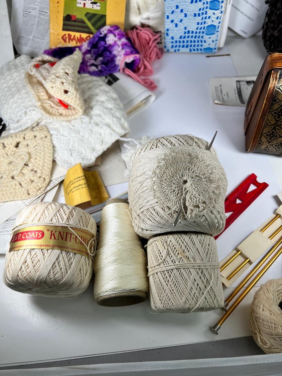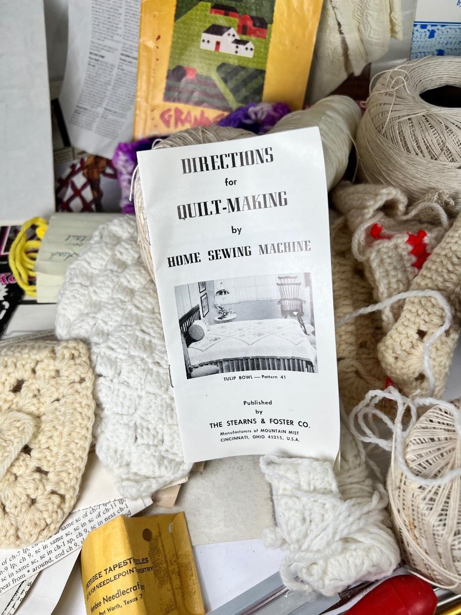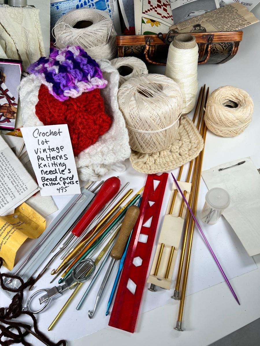 Vintage patterns, crochet hooks, needles, cord, tarn, leisure arts vintage quilt pattern book. Lots of hand written instructions. Rattan case with latch.