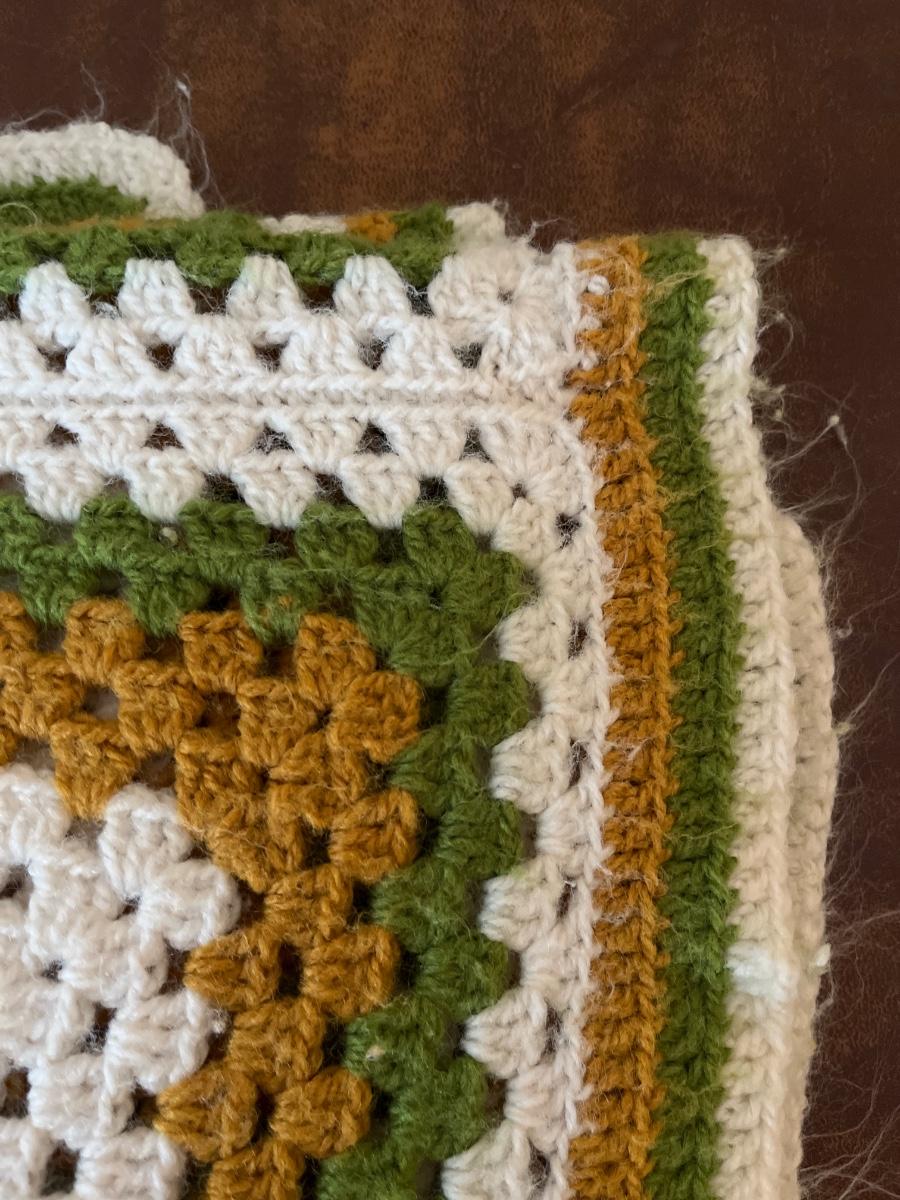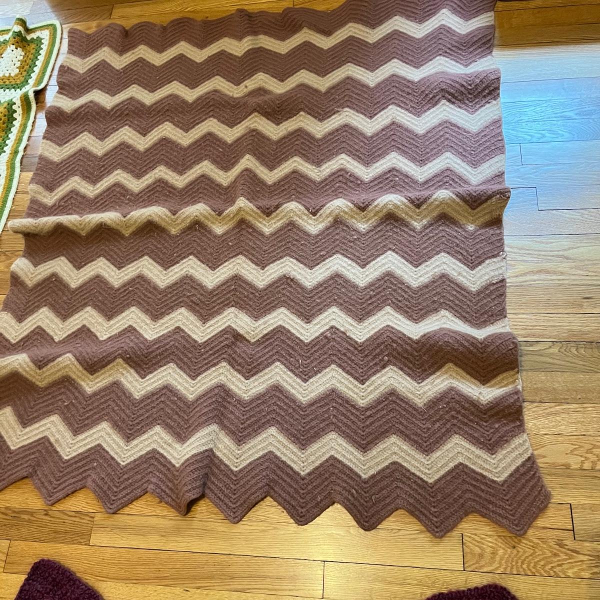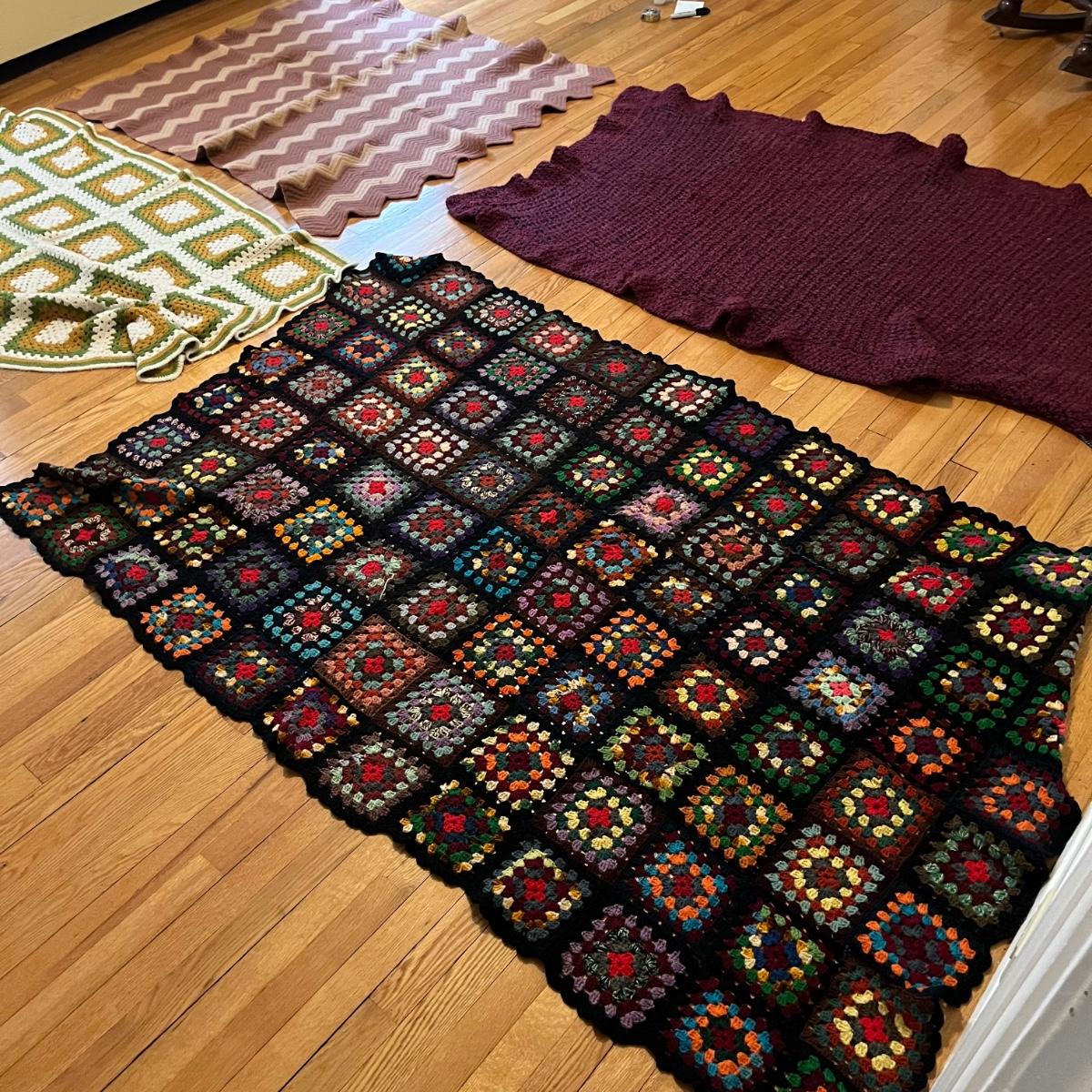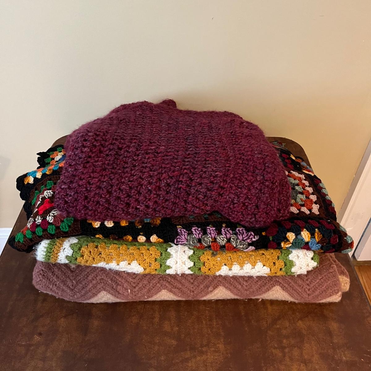 Lot includes four colorful hand crocheted in a variety of styles and colors. The tan afghan feels as if it is made of wool and it is heavier than the other blankets/afghans. Largest blanket measures 48” x 72”.