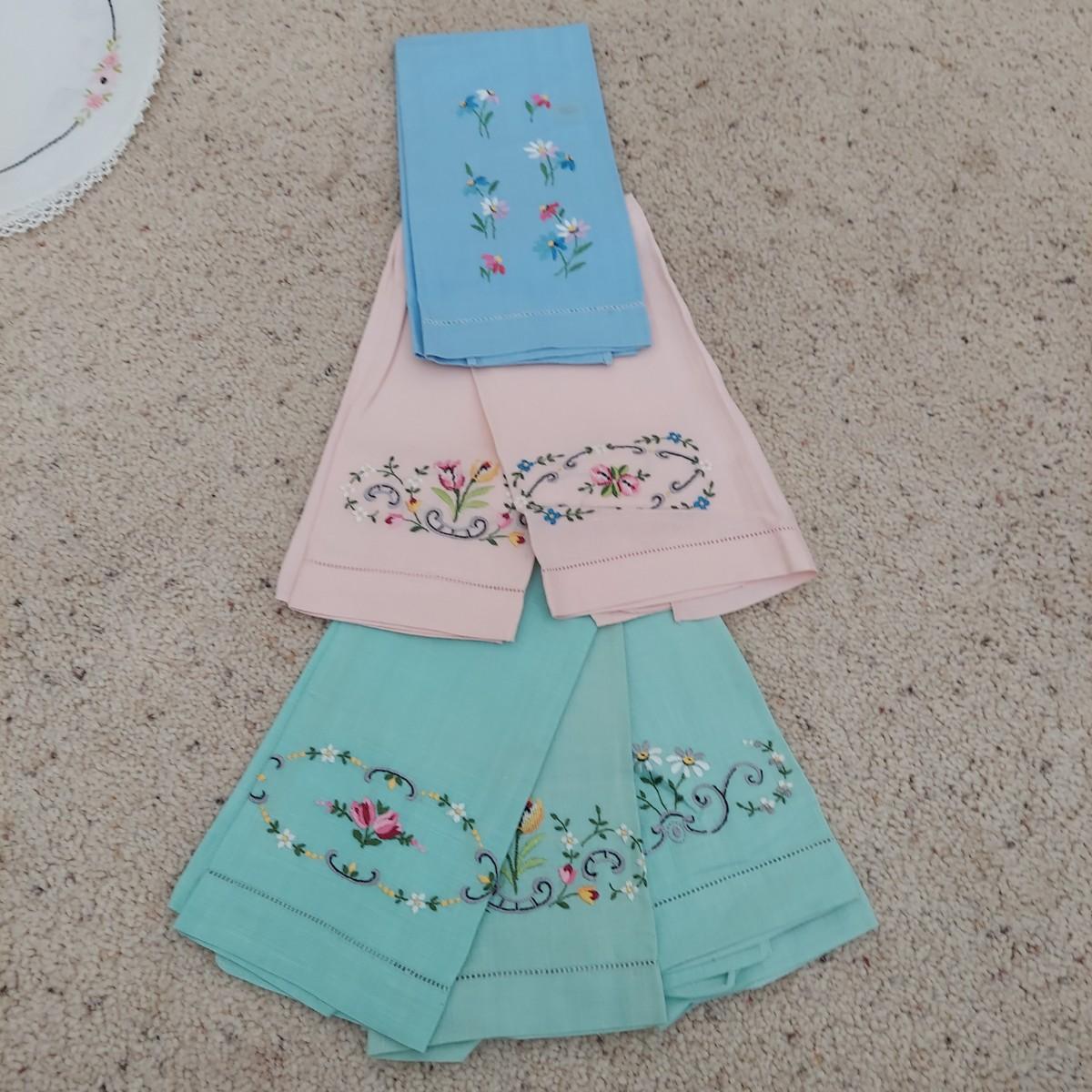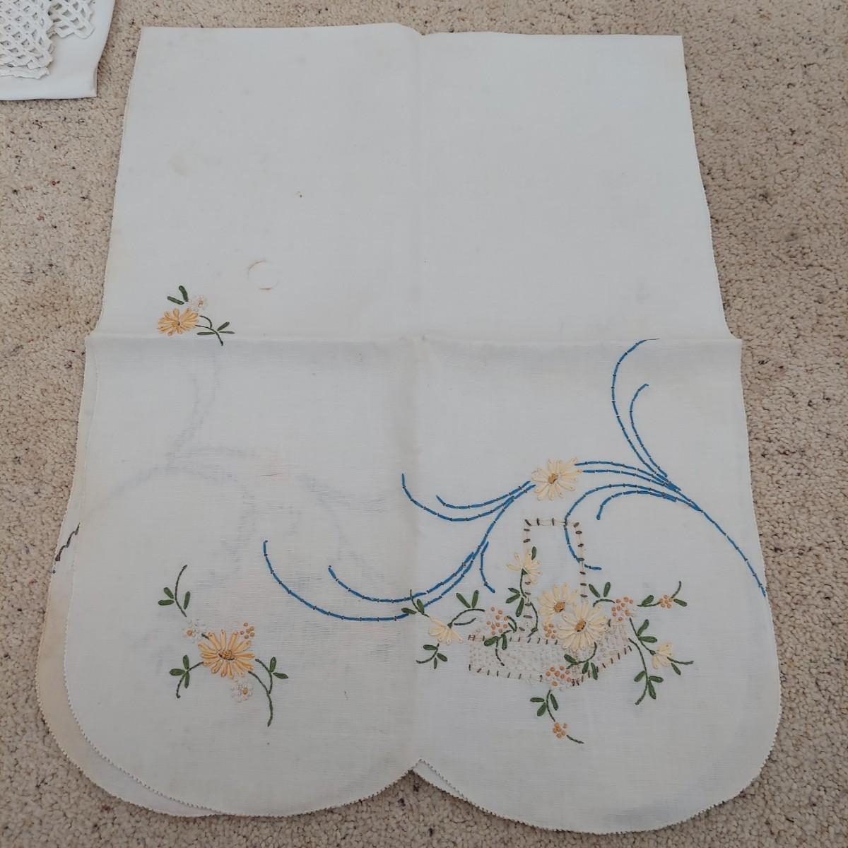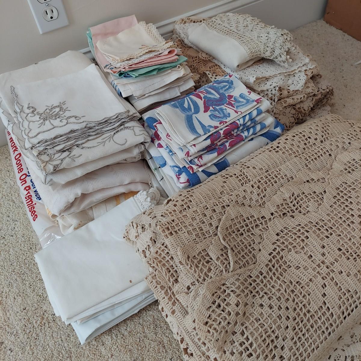 Several vintage linens including crochet tablecloths and embroidered table runners and placemats. Some stains and overall wear due to age. Please see photos for details. Shipping available