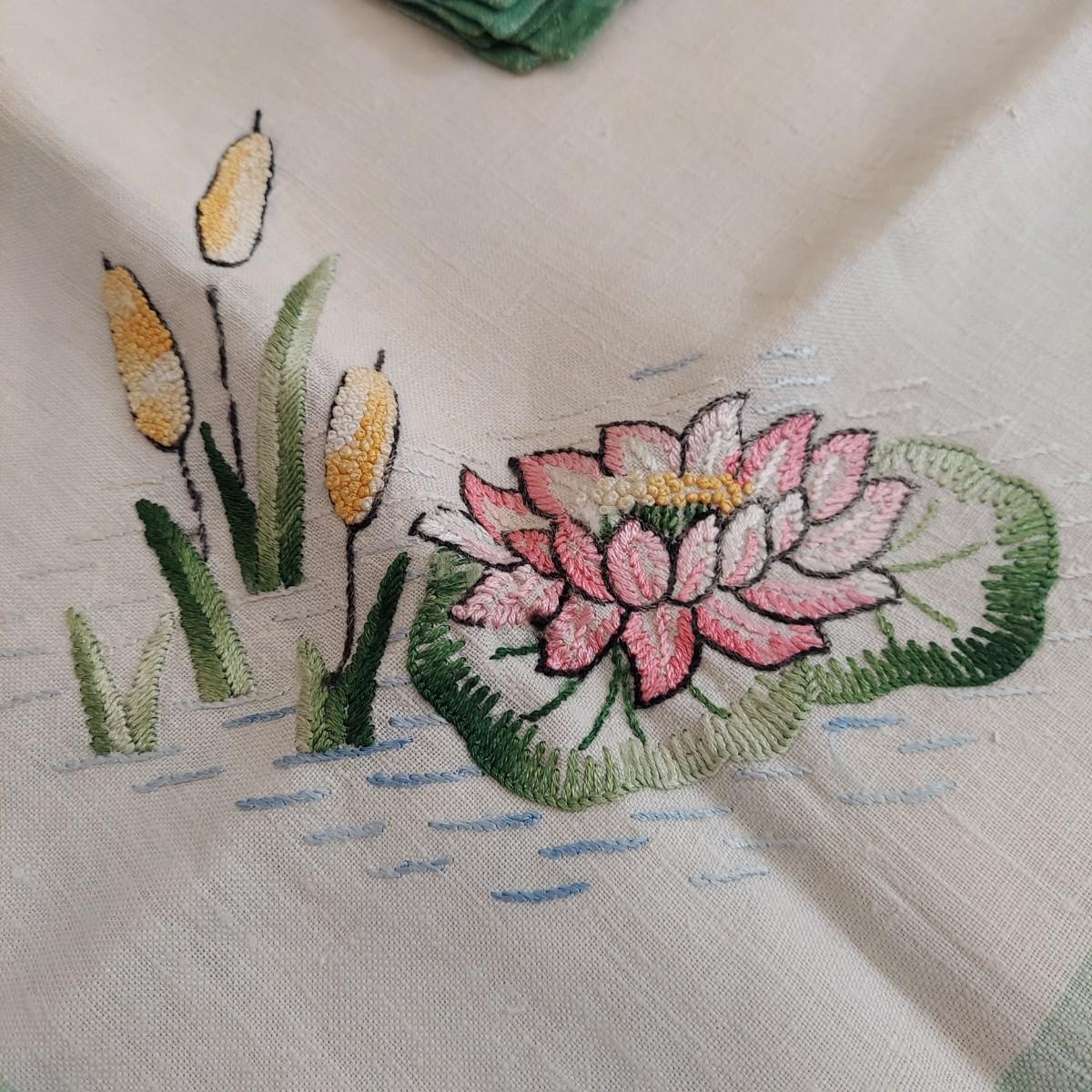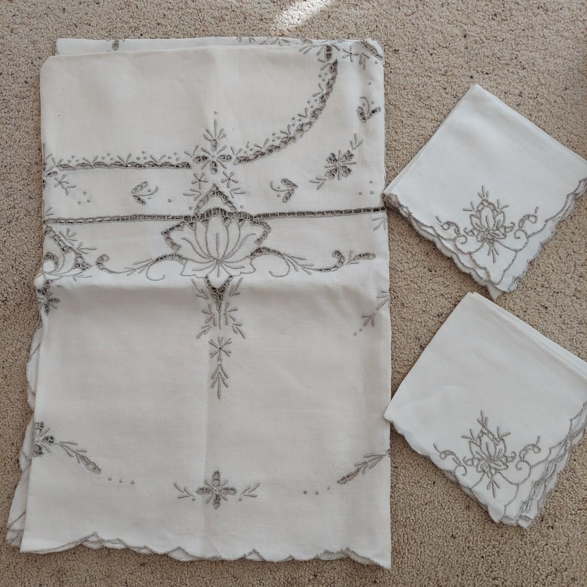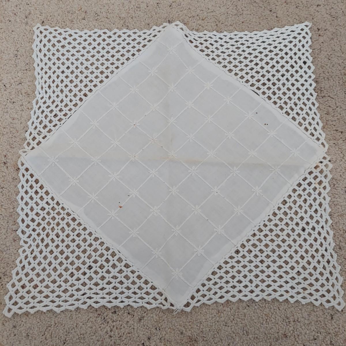 Several vintage linens including crochet tablecloths and embroidered table runners and placemats. Some stains and overall wear due to age. Please see photos for details. Shipping available