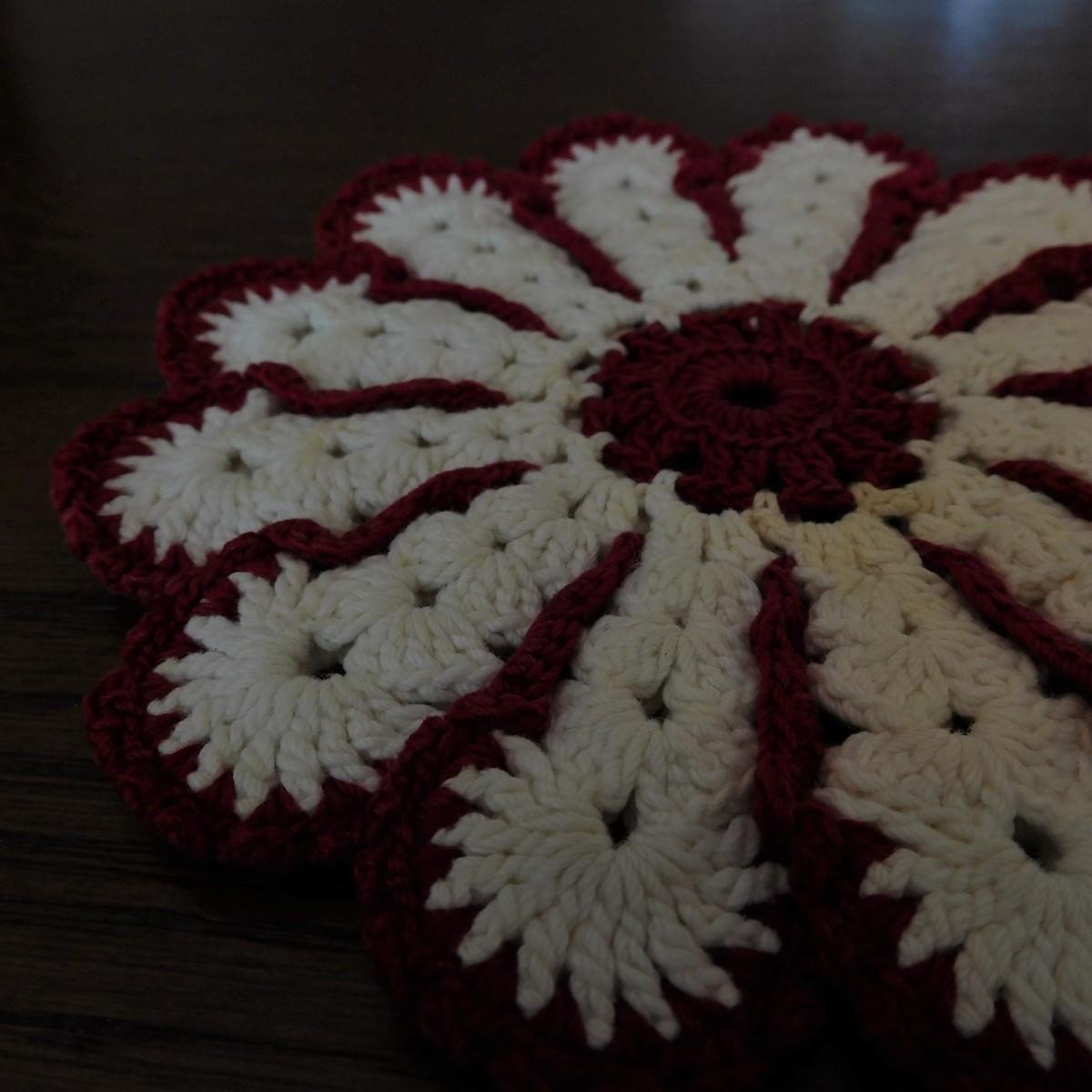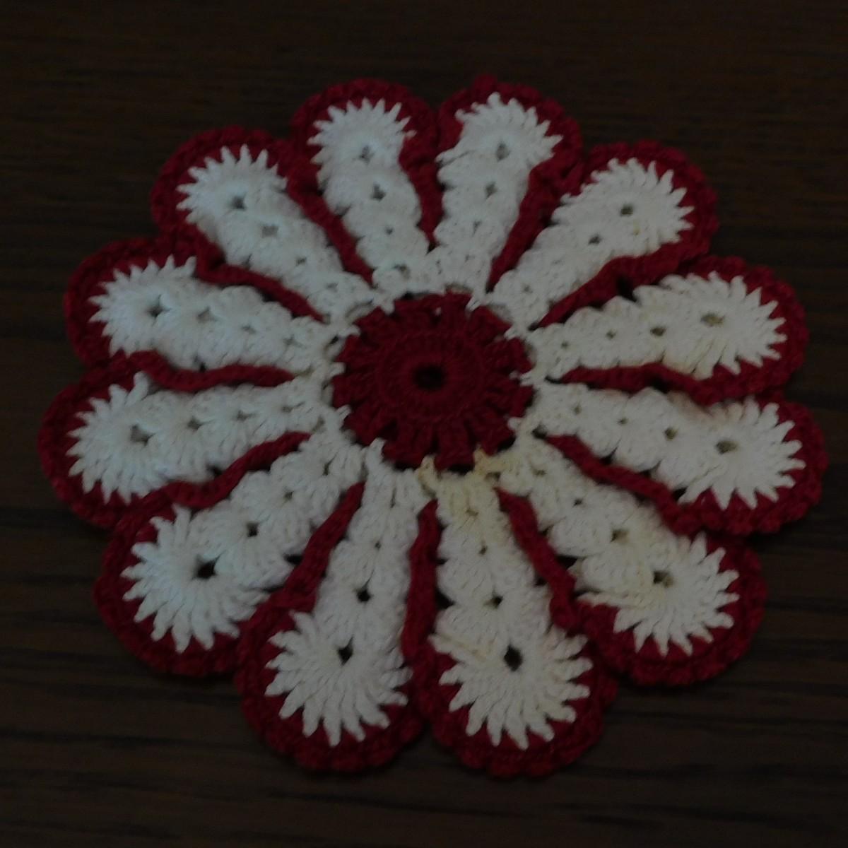 This is a vintage hot pad for under a warm dish. It is crocheted with a flower design that is red and white. It is about 5 1/2".
