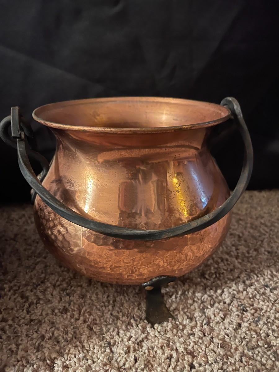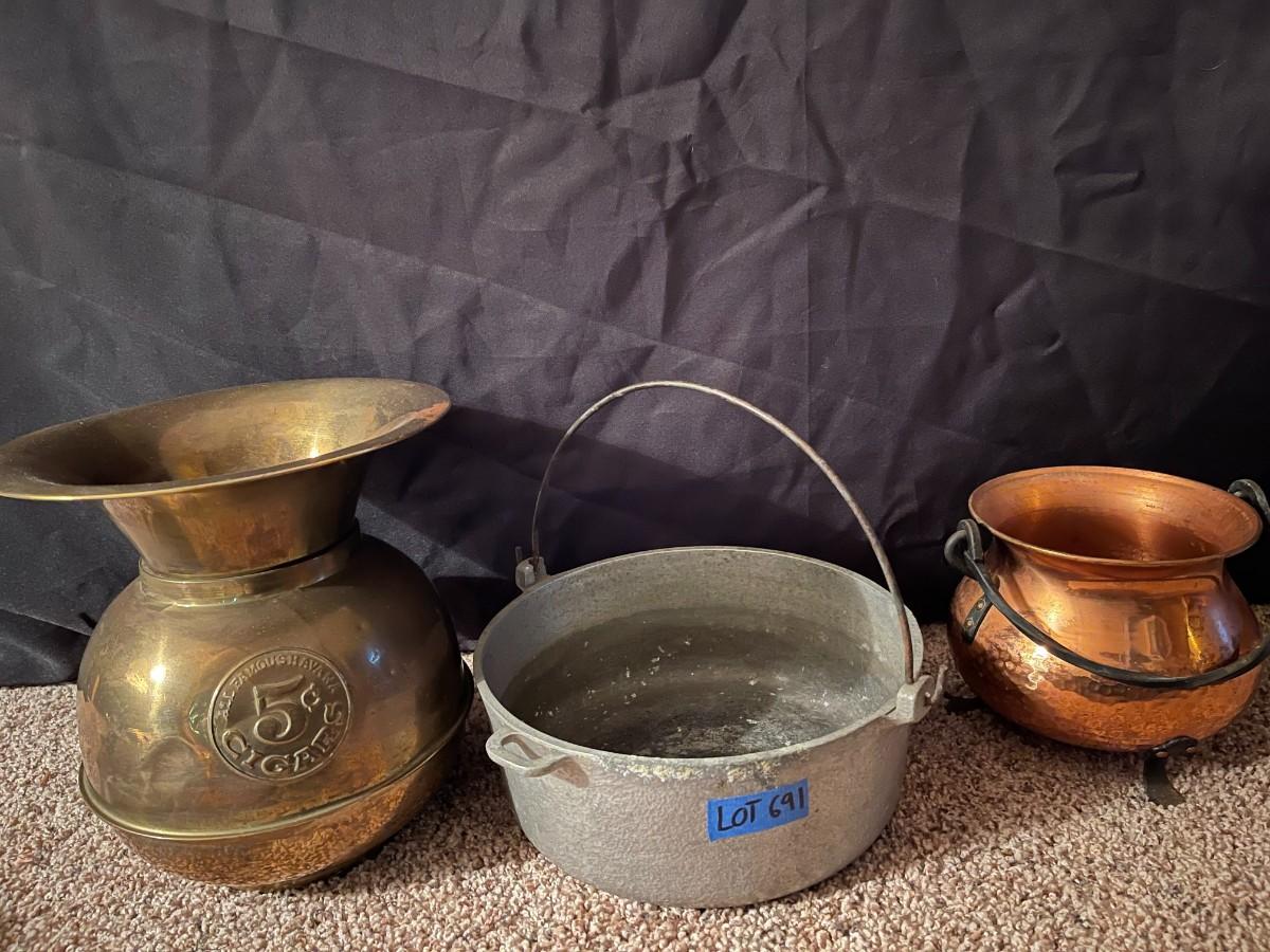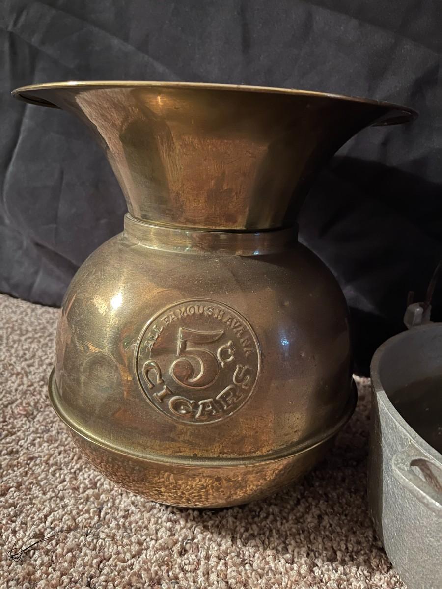 (3) Large vintage crocks - brass all famous Havana 5 cents cigars, copper pot, vintage stamped pot.