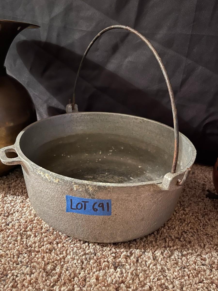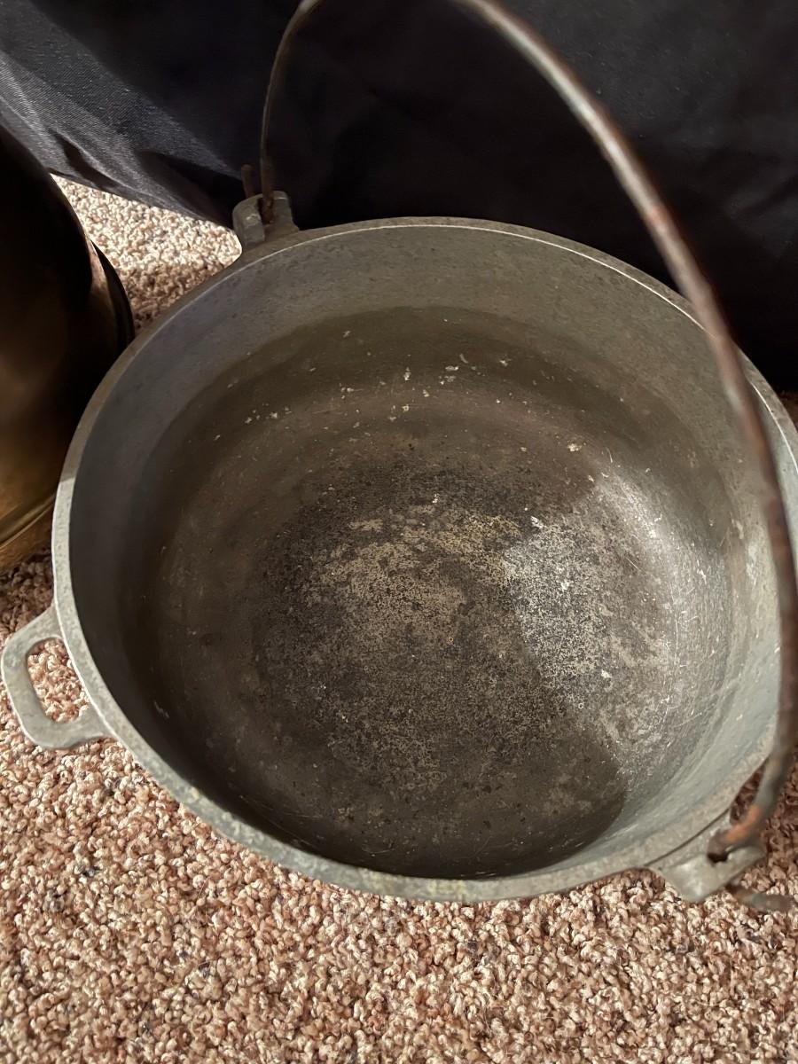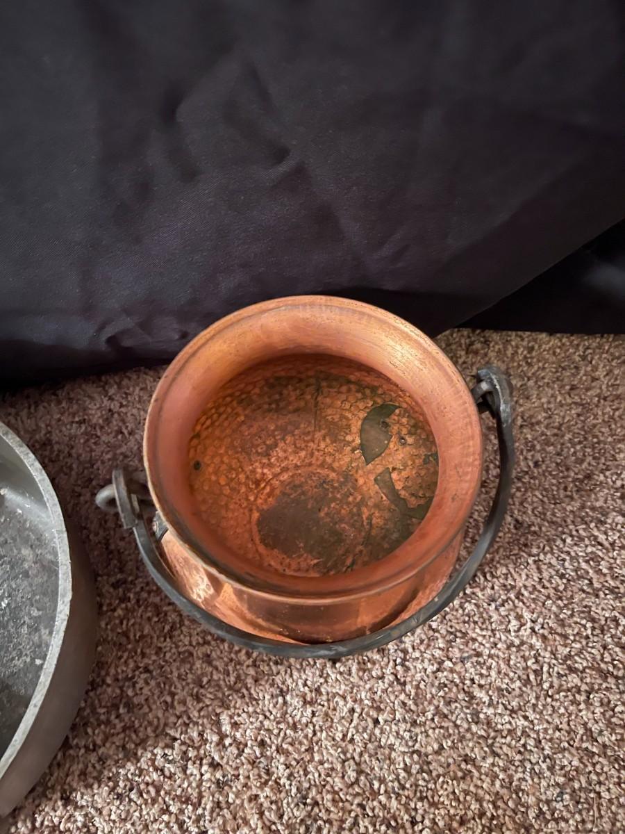 (3) Large vintage crocks - brass all famous Havana 5 cents cigars, copper pot, vintage stamped pot.