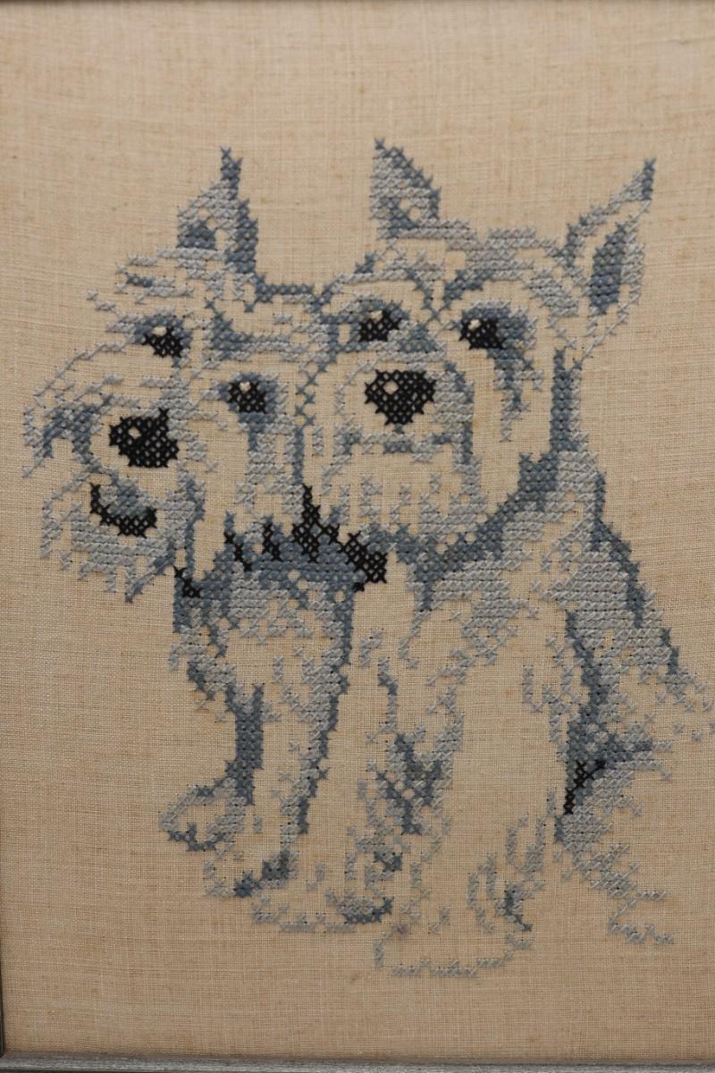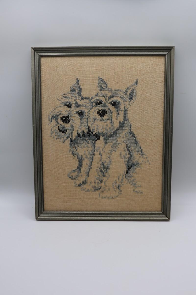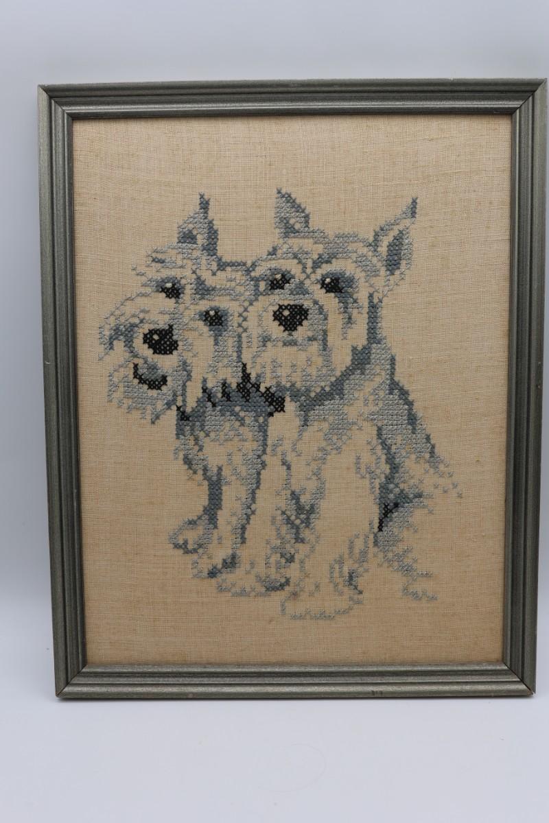 Vintage Cross Stitch Needlepoint Art Schnauzer Dogs