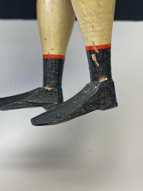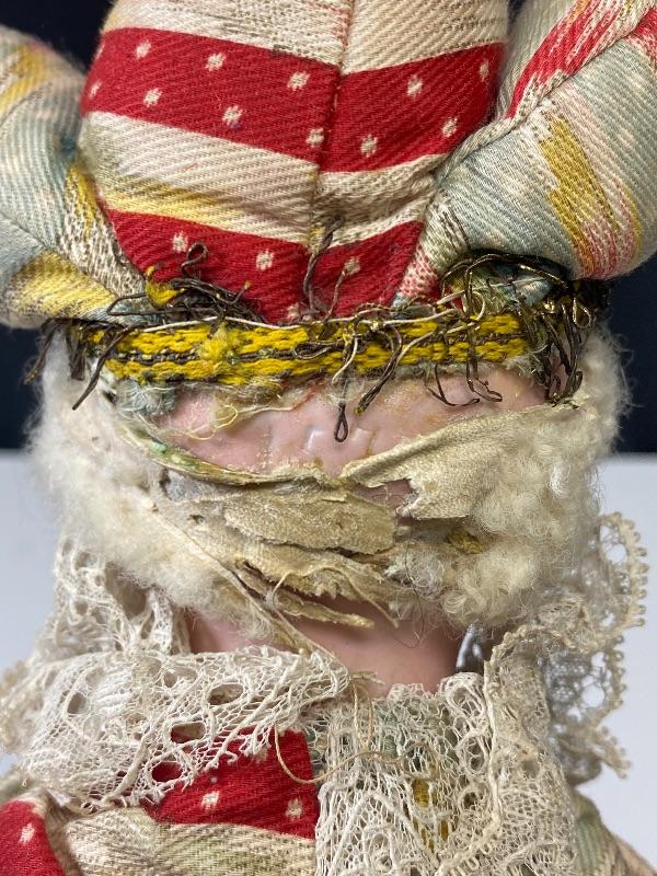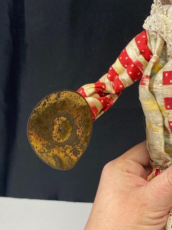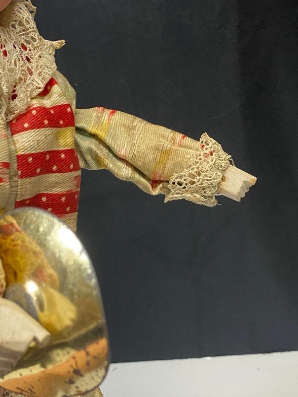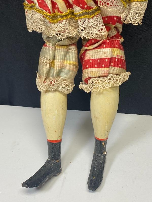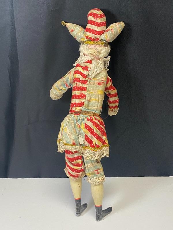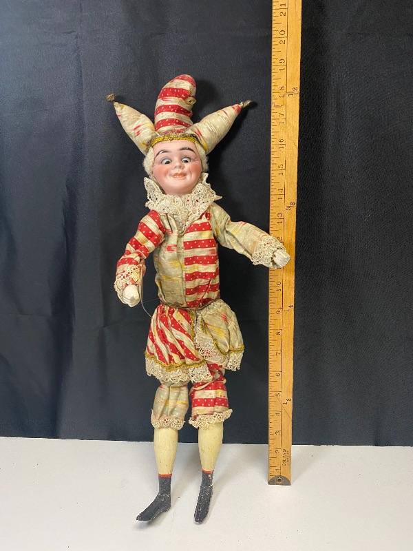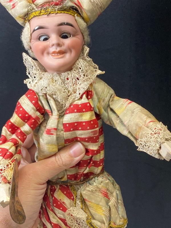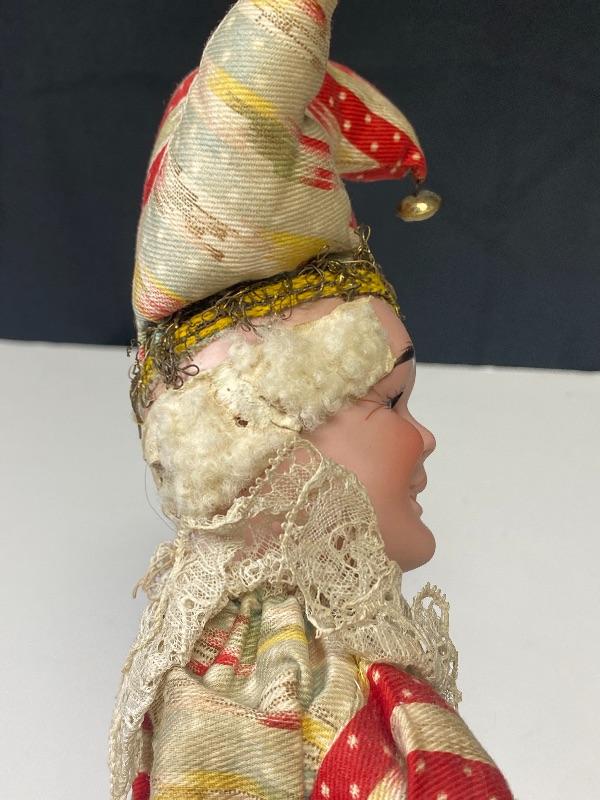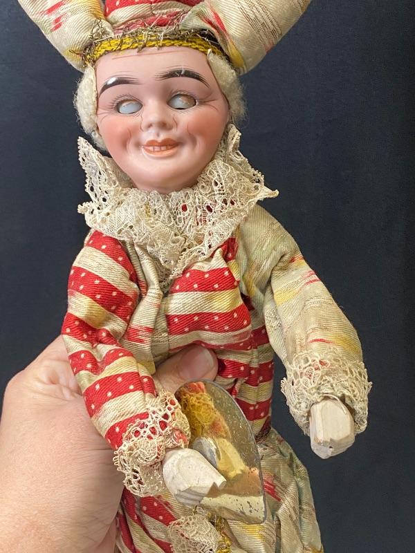 Vintage jester squeeze toy doll. Cross eyed doll playing cymbals (missing one). When you squeeze his body his arms move and eyes close. Smirky smile. Red and pale blue outfit, discolored. Wood legs and hands. Porcelain head has a mark that looks like #157 but hard to see because of glued hair/hat. Stands about 19".