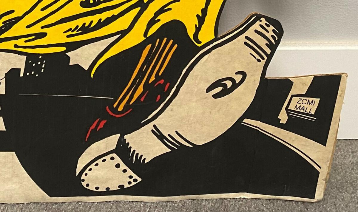 With some light normal use here is a vintage free-standing cardboard sign with a Clown who is dispensing balloons...from the now gone CROSSROADS PLAZA and the Z.C.M.I. CENTER in downtown Salt Lake City, Utah...opened in 1975 and closed in 2007. At the time it opened, it was the largest downtown mall in the entire country...Measures approx. 32 x 24"...Offered with no reserve...