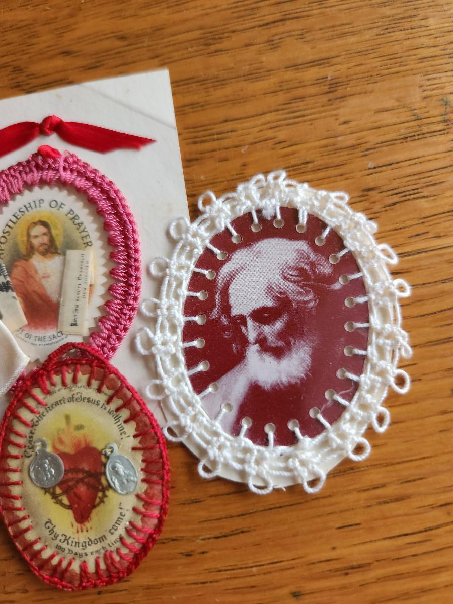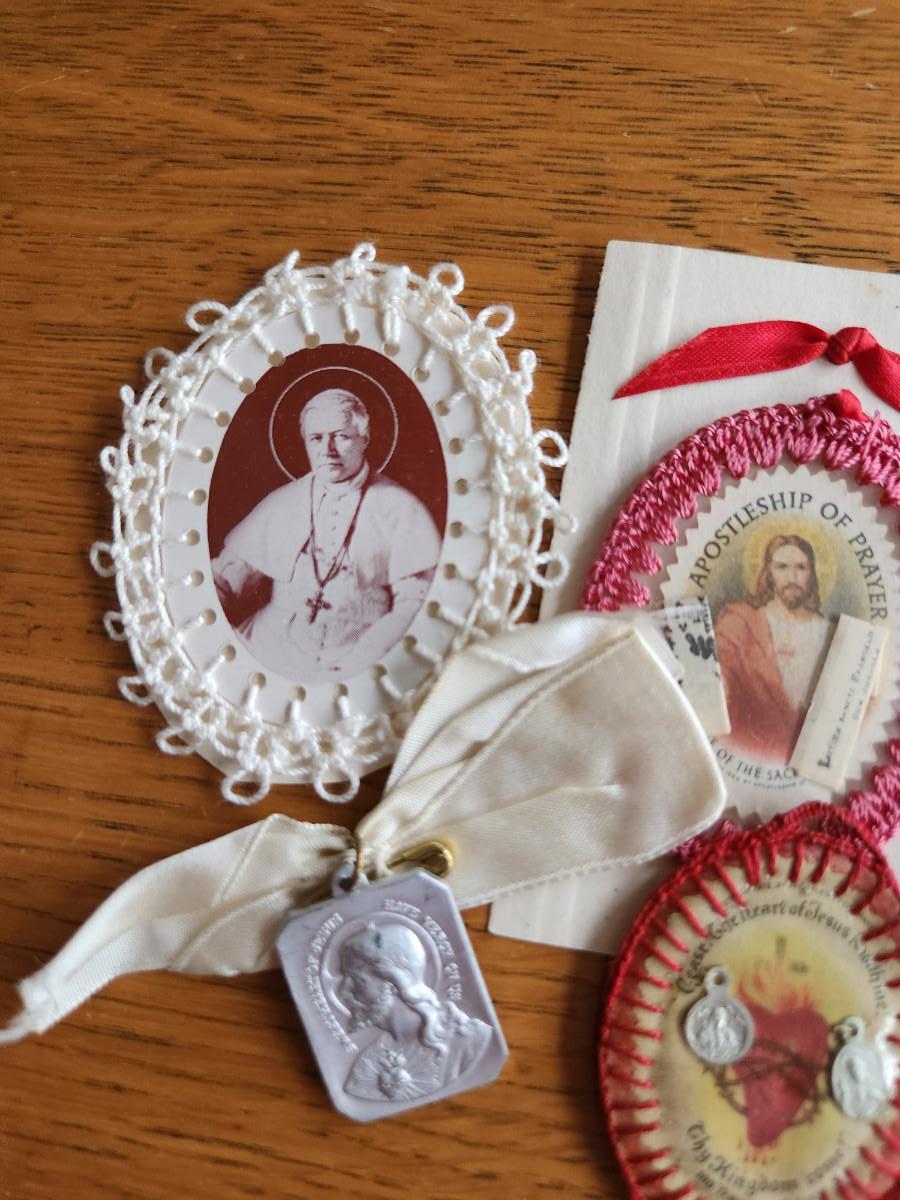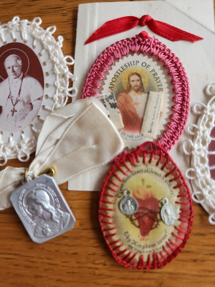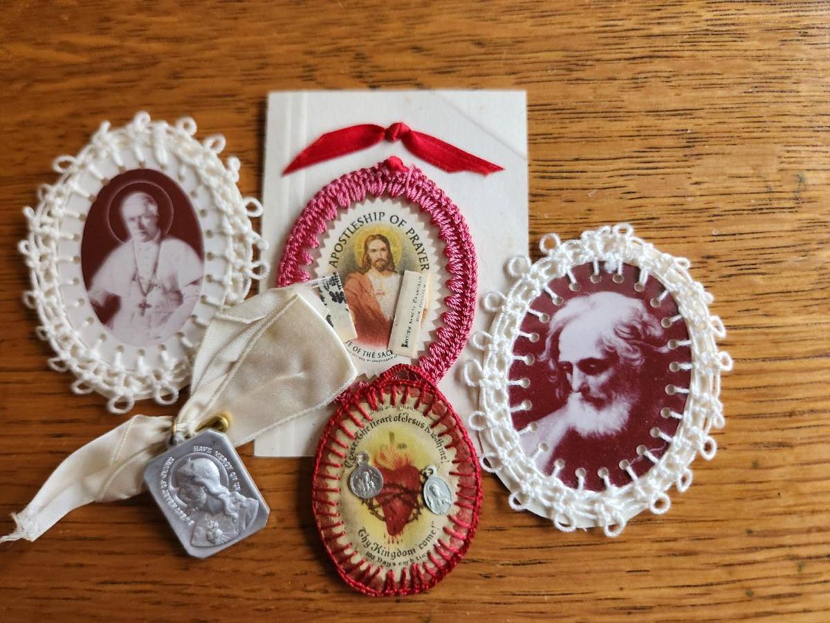 This auction lot is for a grouping of Vintage Crocheted-Edge Religious Icons, This grouping shows St. Pope Pius X, St. Joseph, two Sacred Hearts and a Christ Medal with Ribbon.