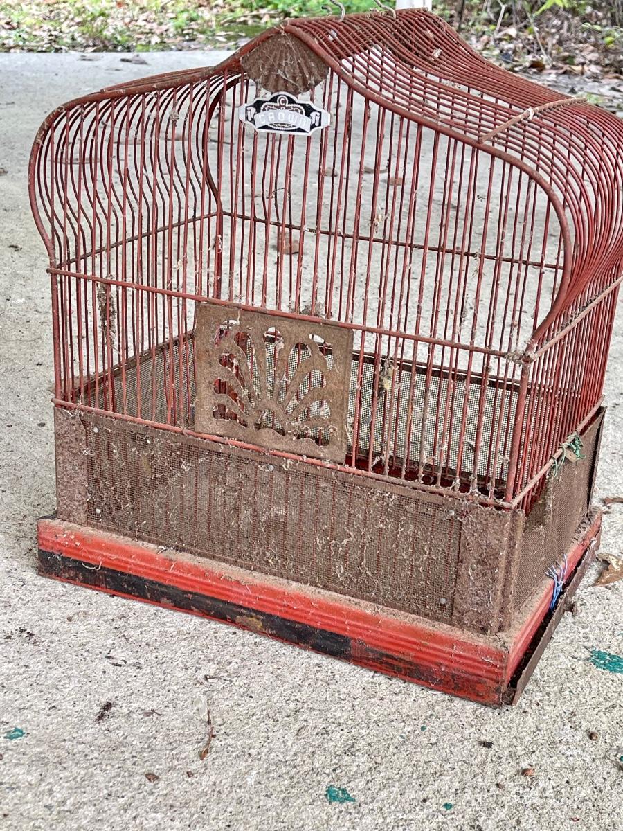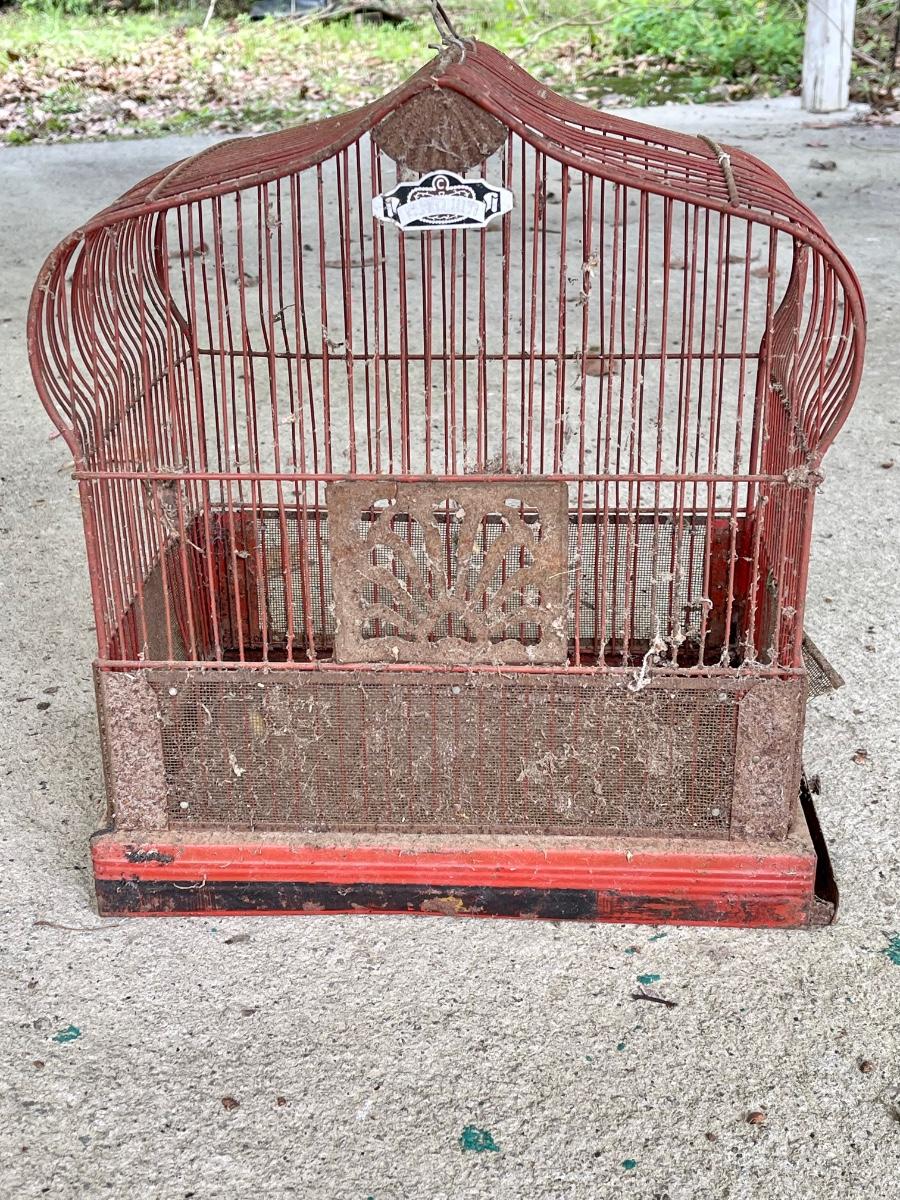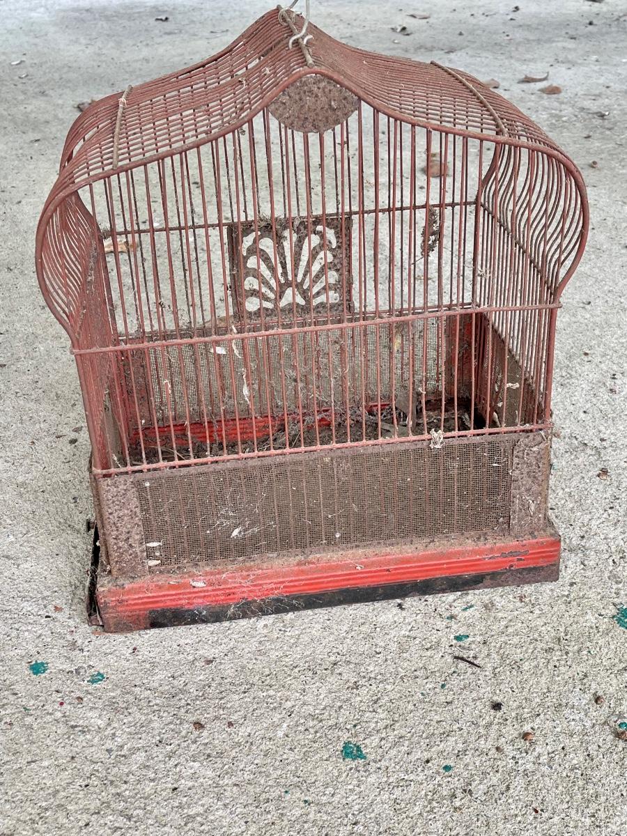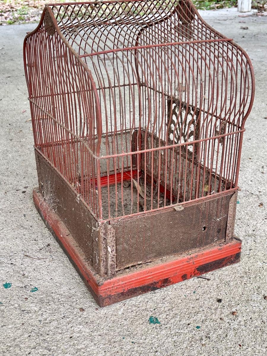 Cool old cage! This has some repairs but clean it up and paint it and it would make a beautiful bird feeder for your outdoor garden area! Or, repurpose as a planter, or anything else your imagination allows. Just a neat piece!