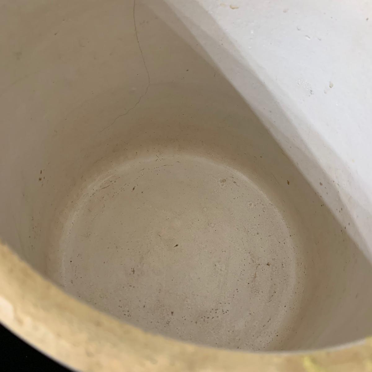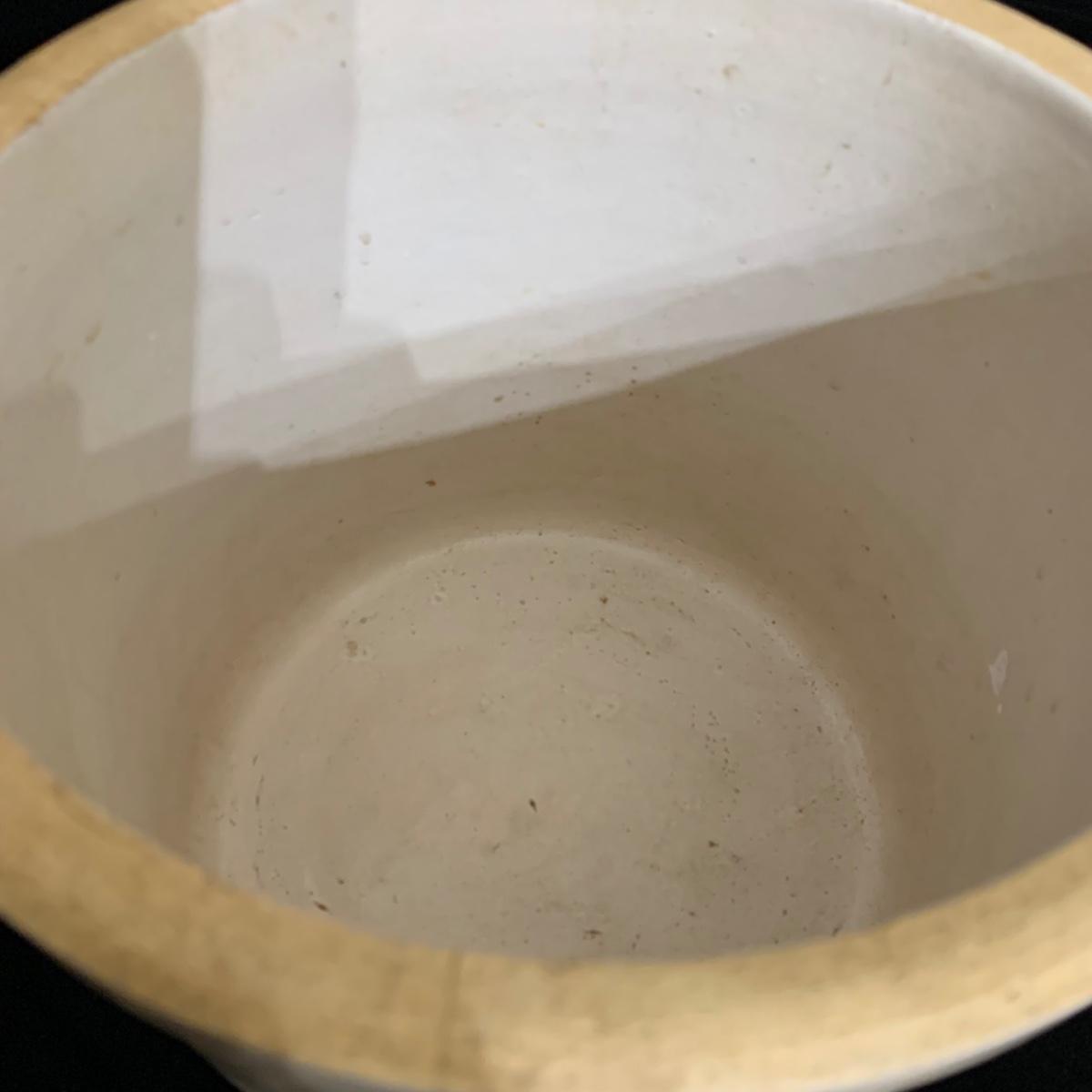 Vintage cream colored stoneware two-gallon crock marked with a blue crown, which indicates it is from Robinson Ransbottom. Crock measures 10”d x 9”h. It has two cracks and some other imperfections which are noted in the pictures.