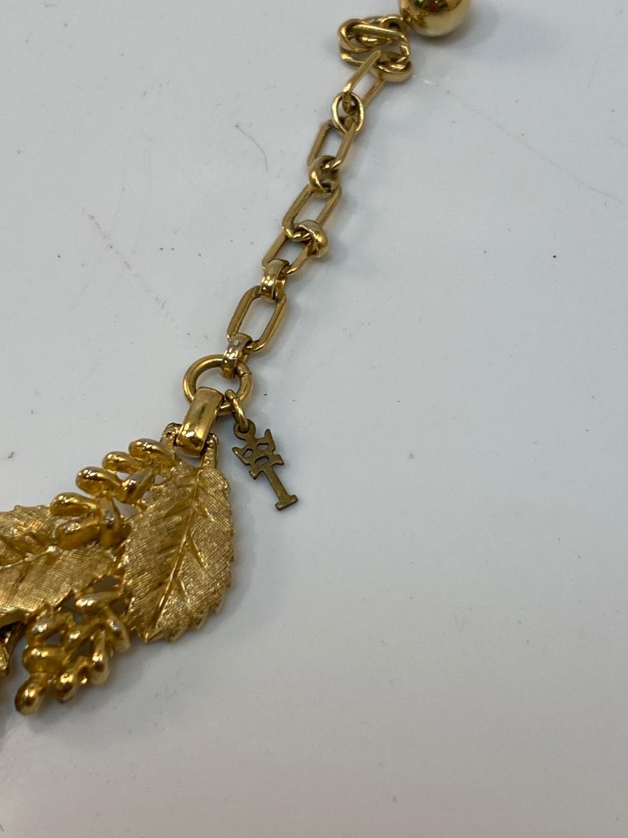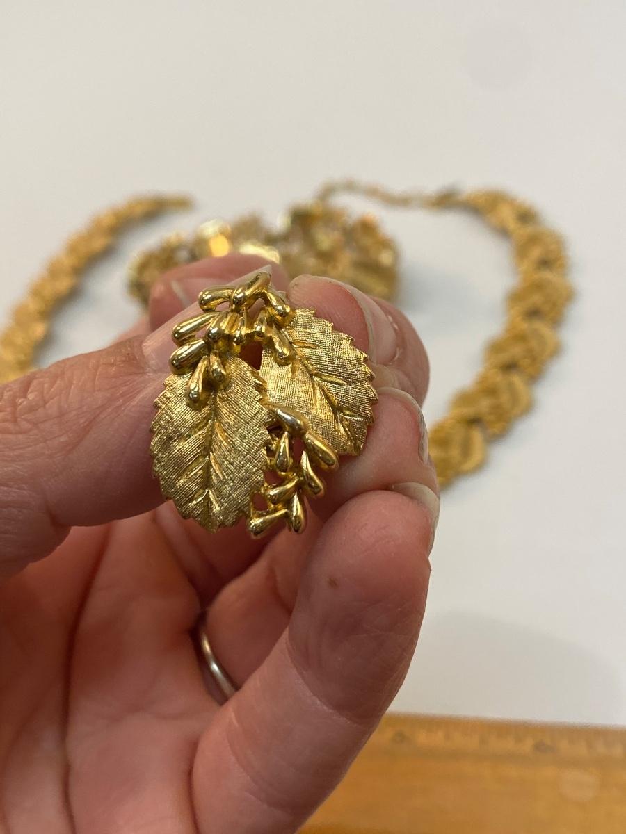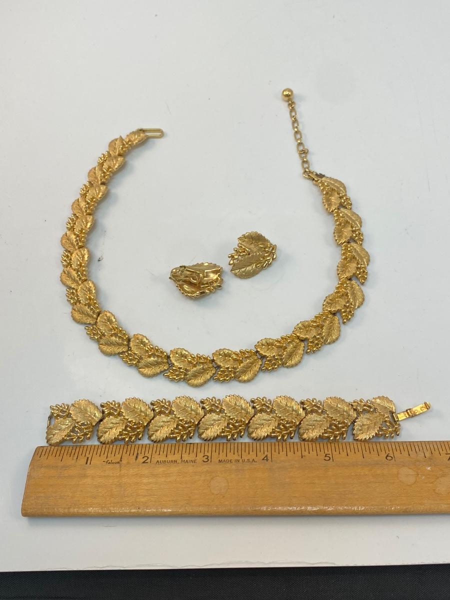 Vintage Crown Trifari 3 Piece Gold Tone Holly Leaf Jewelry Set. Comes with choker necklace, bracelet, and clip style earrings. Good vintage condition.