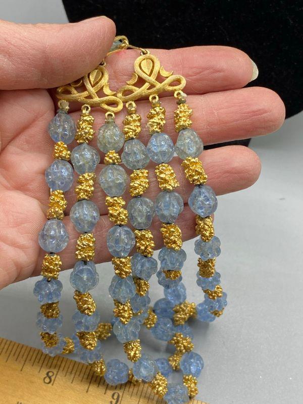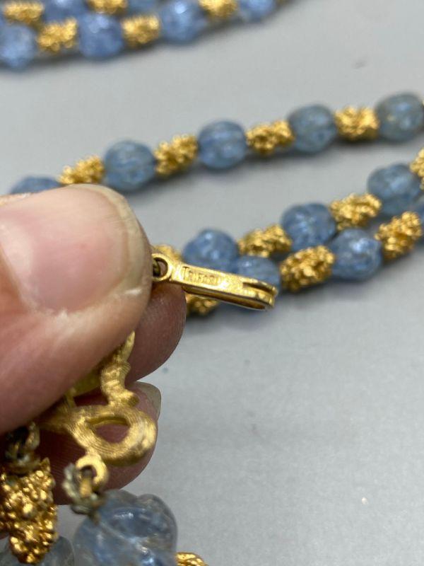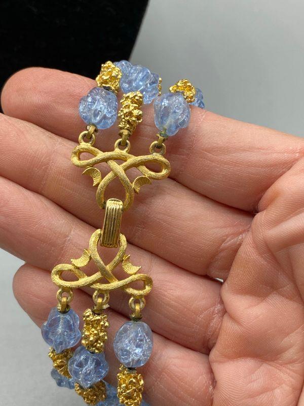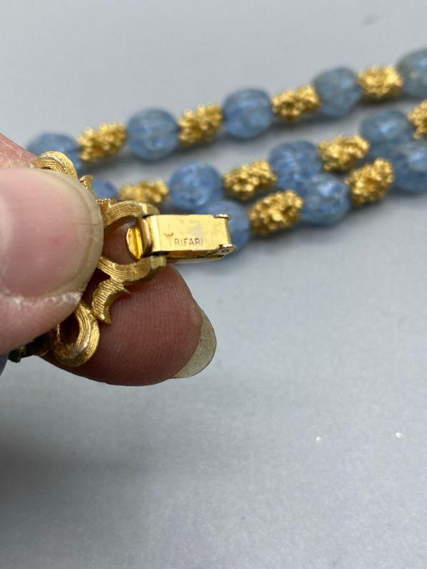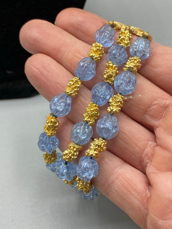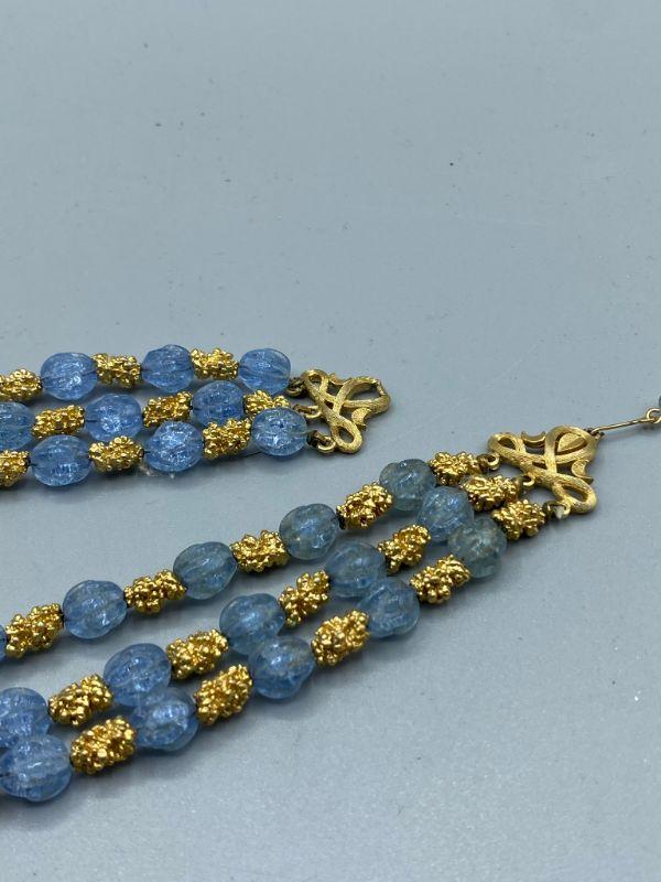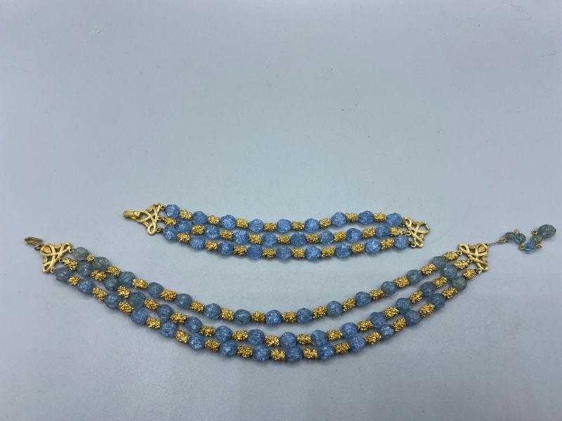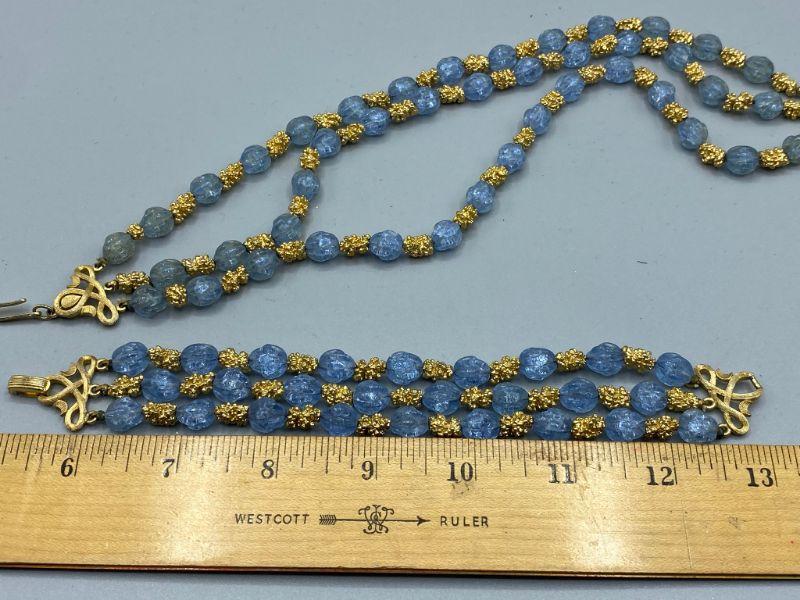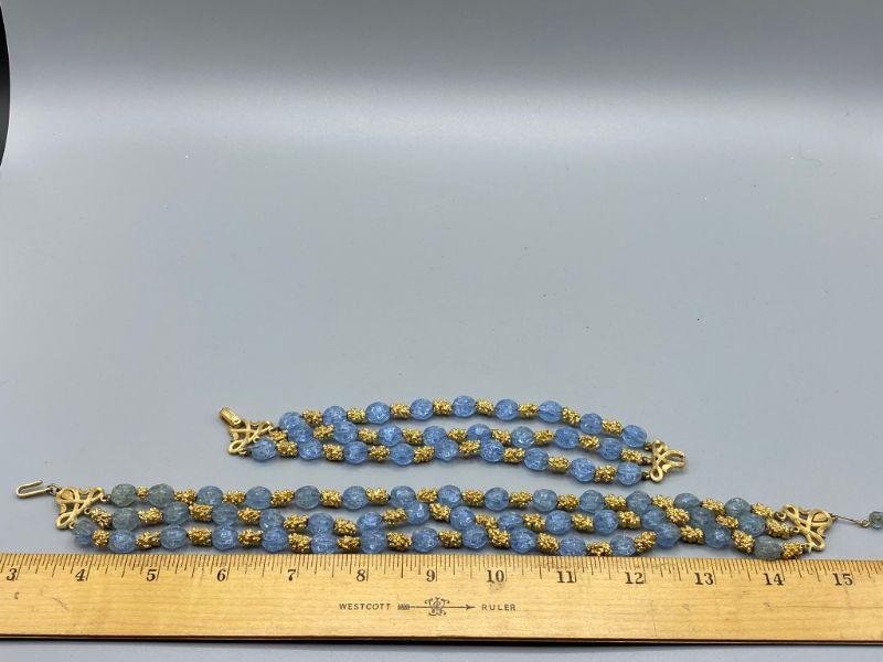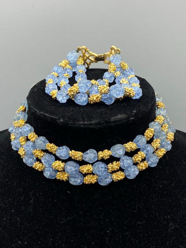 Vintage Crown Trifari set. Multistrand bracelet and choker. Icy pale blue and goldtone beads. Lots of texture to beads. Gols tone clasp. Great condition.
