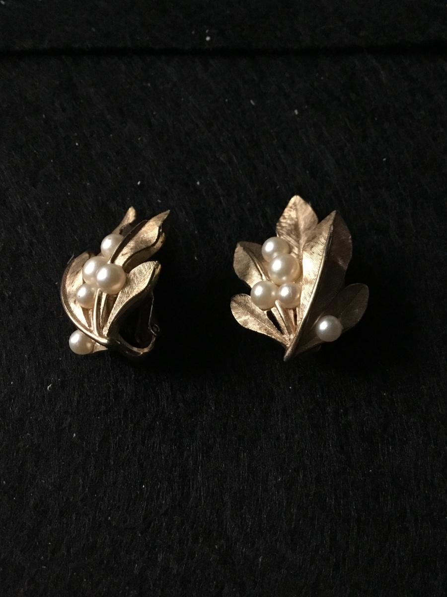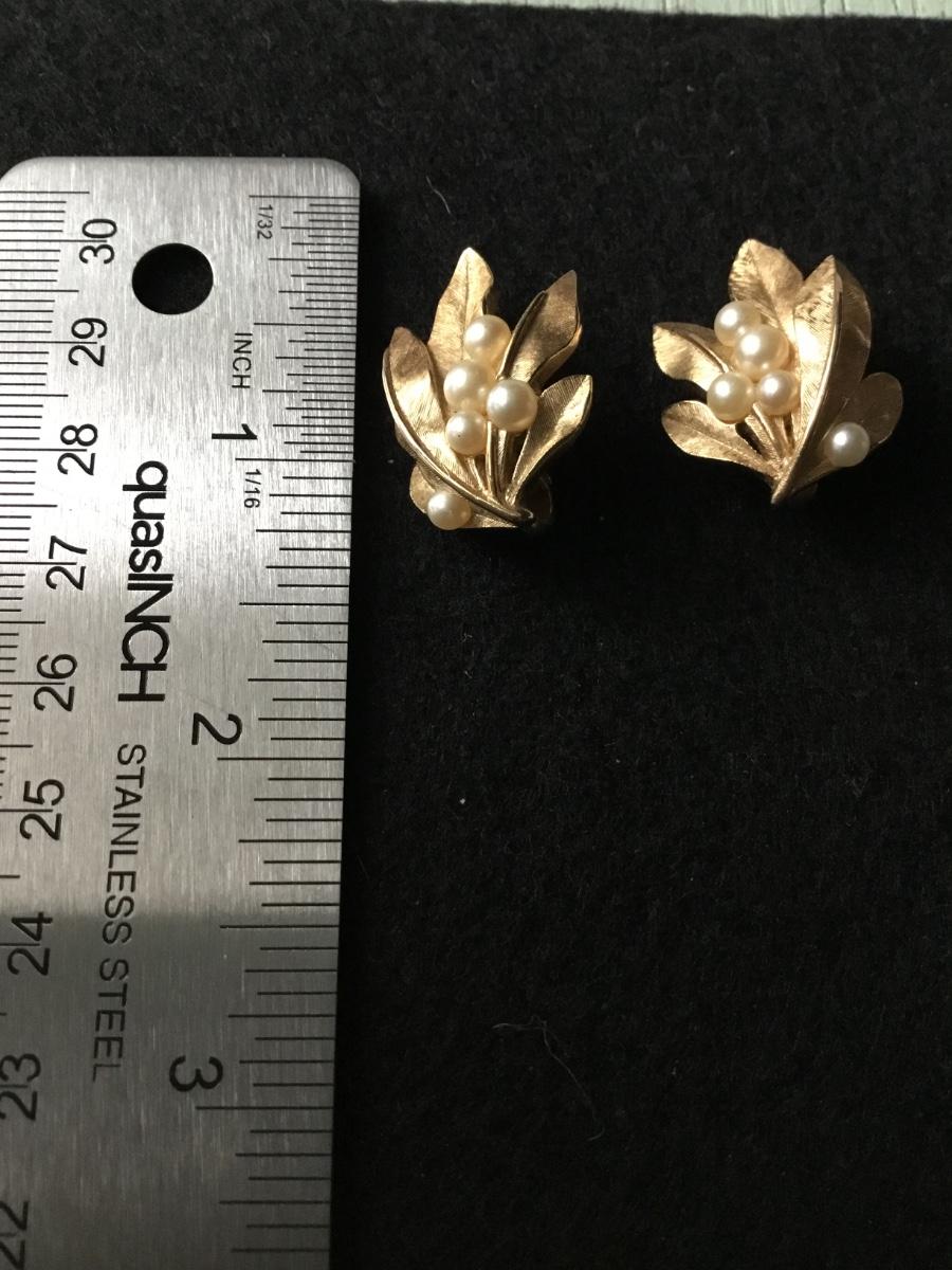 Vintage crown Trifari brushed gold tone leaf clip on earrings with faux pearls