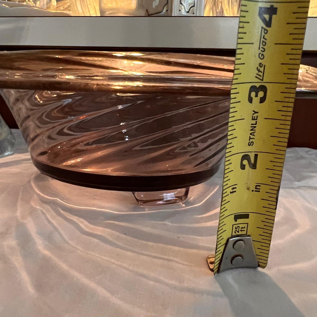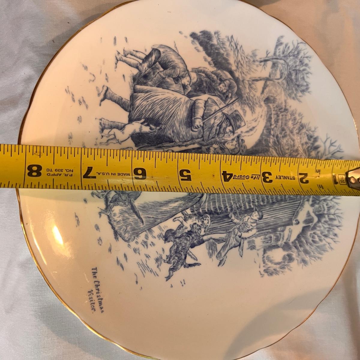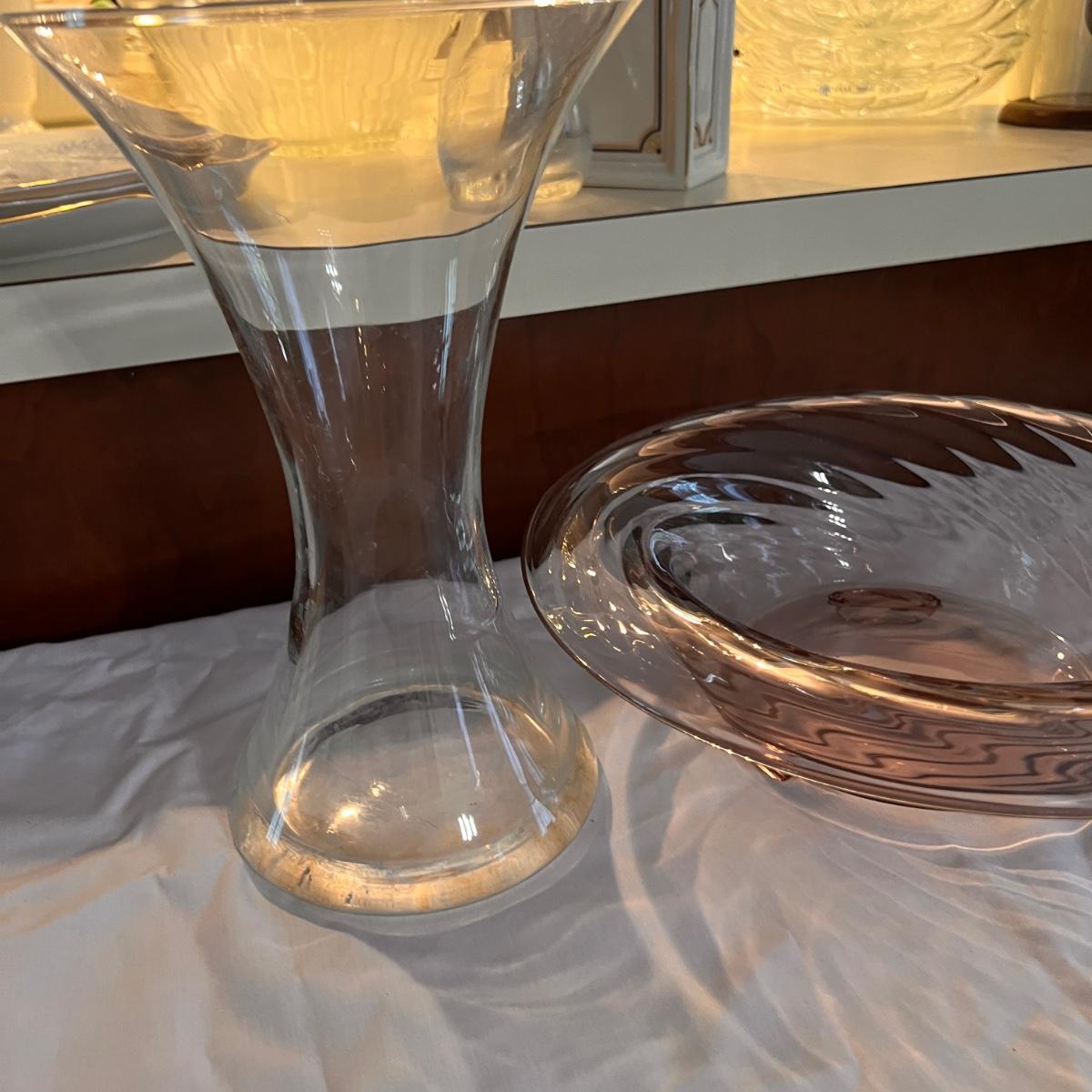 1920's Art Deco Fostoria Glass Orchid Spiral Optic Footed Bowl. Lenox clock, crystal vase and Christmas plate. 2 blue and white Christmas plates are Pickard and Tuscan fine bone China. Hourglass shaped vase.