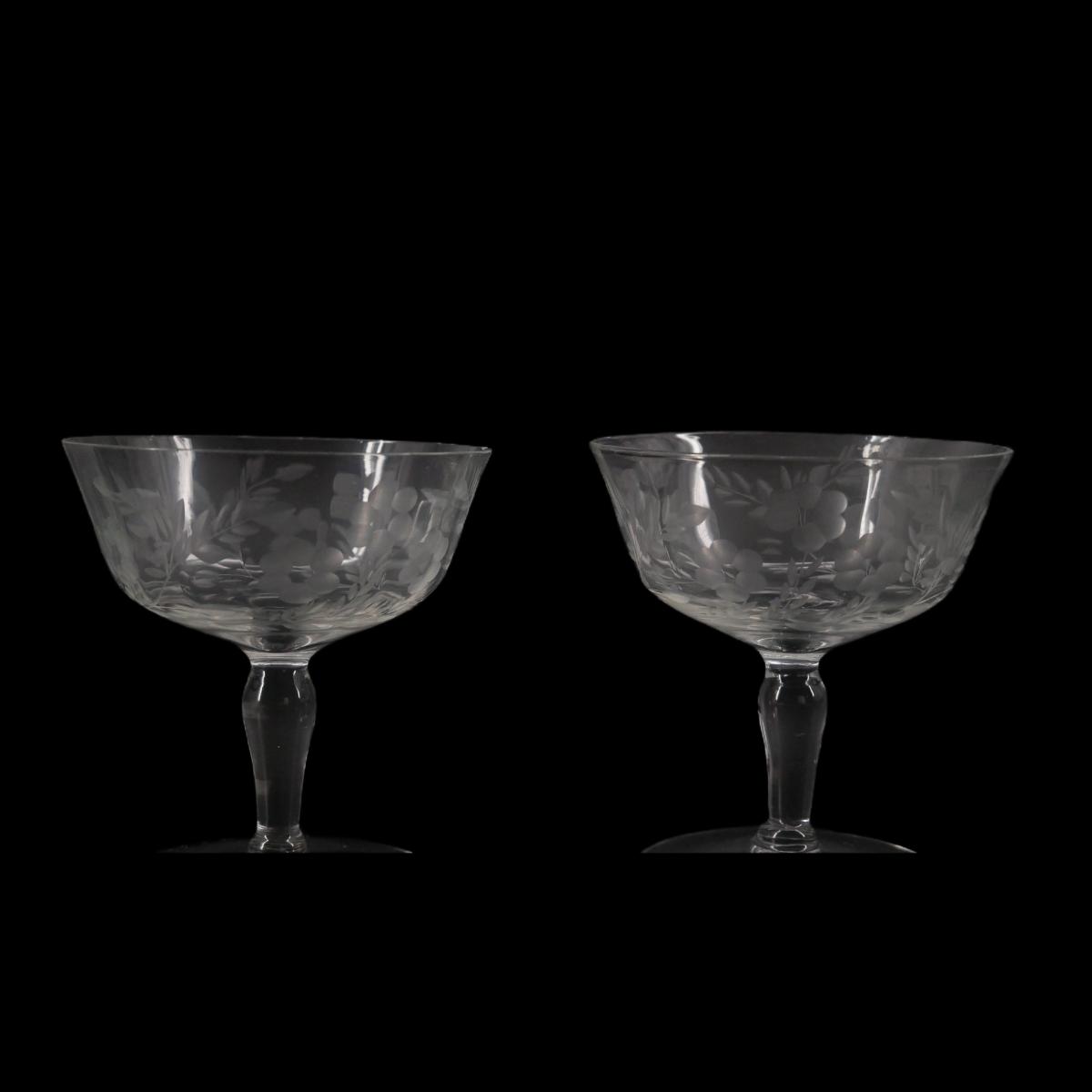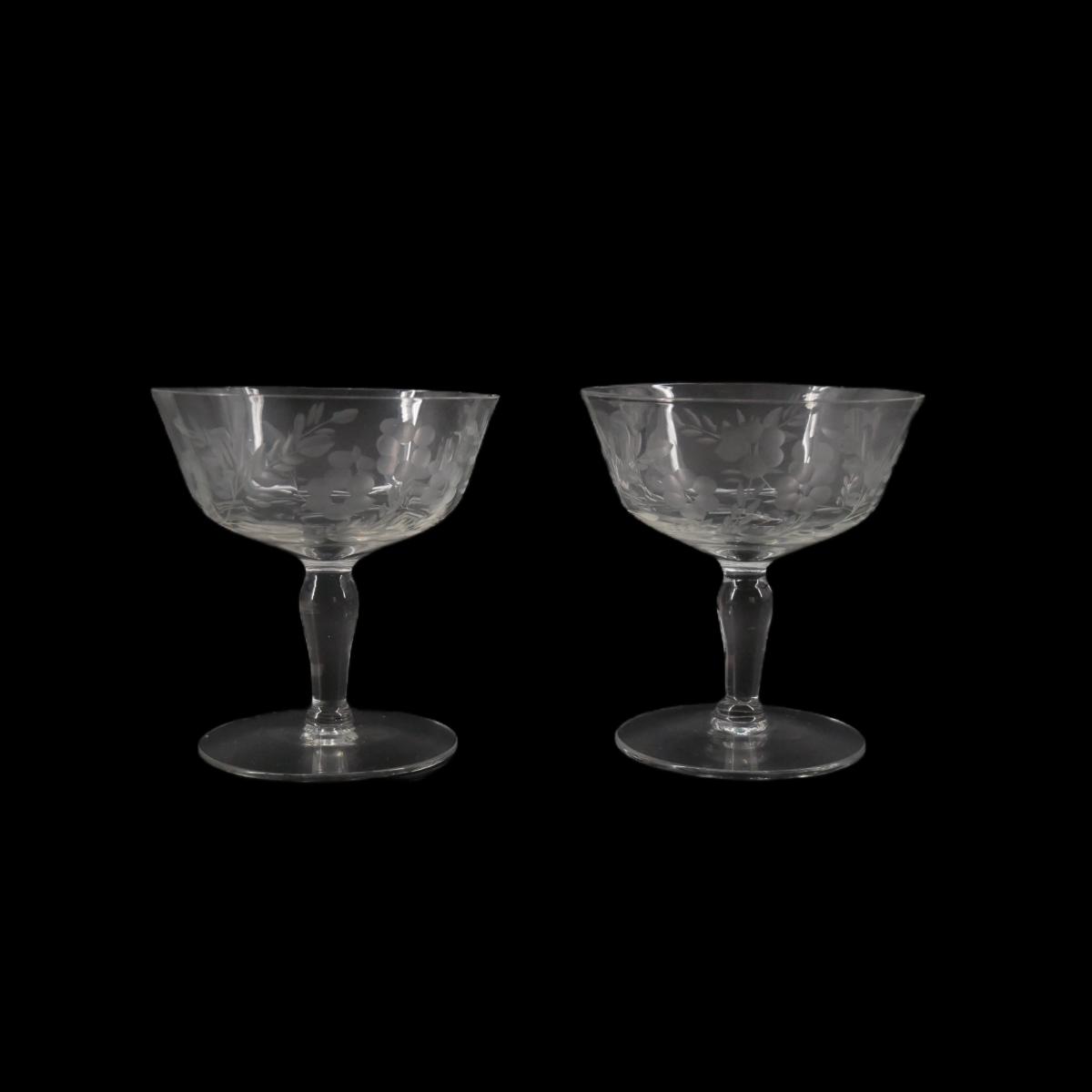 Vintage pair of etched floral designed crystal champagne/cocktail drinking glasses. Small chips on both rims (see photos). Good condition otherwise. Measures 3.75" across and 4" in height. Lot weighs 8 oz. (G34)