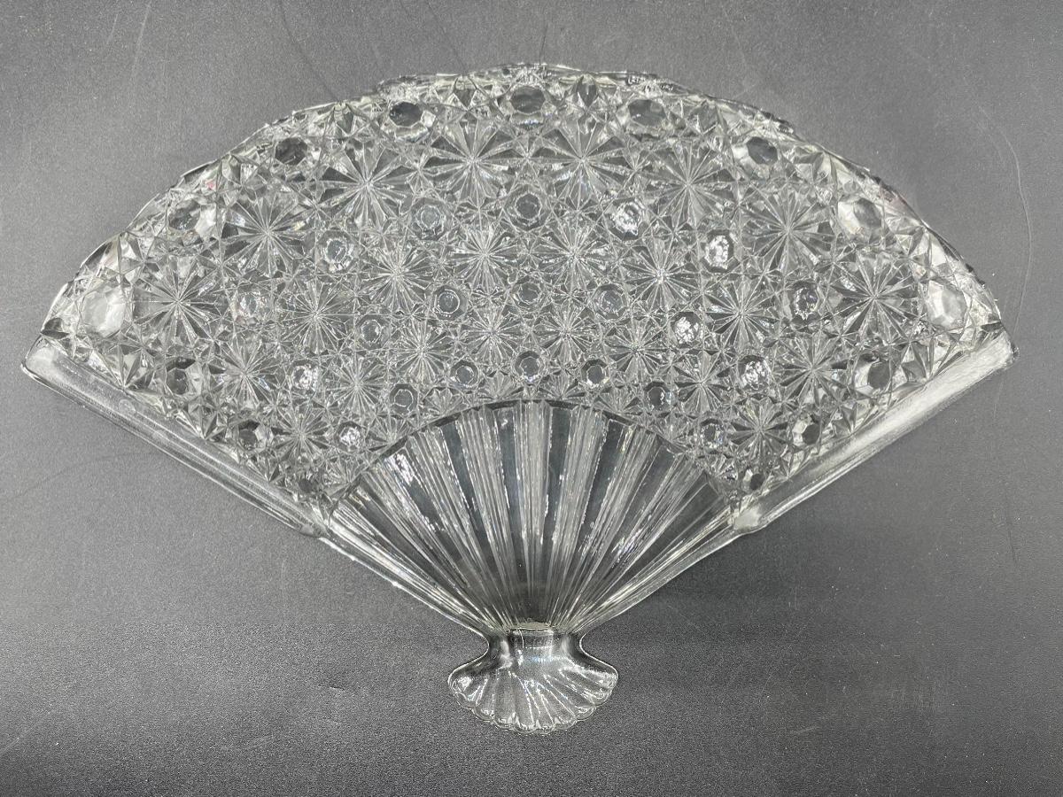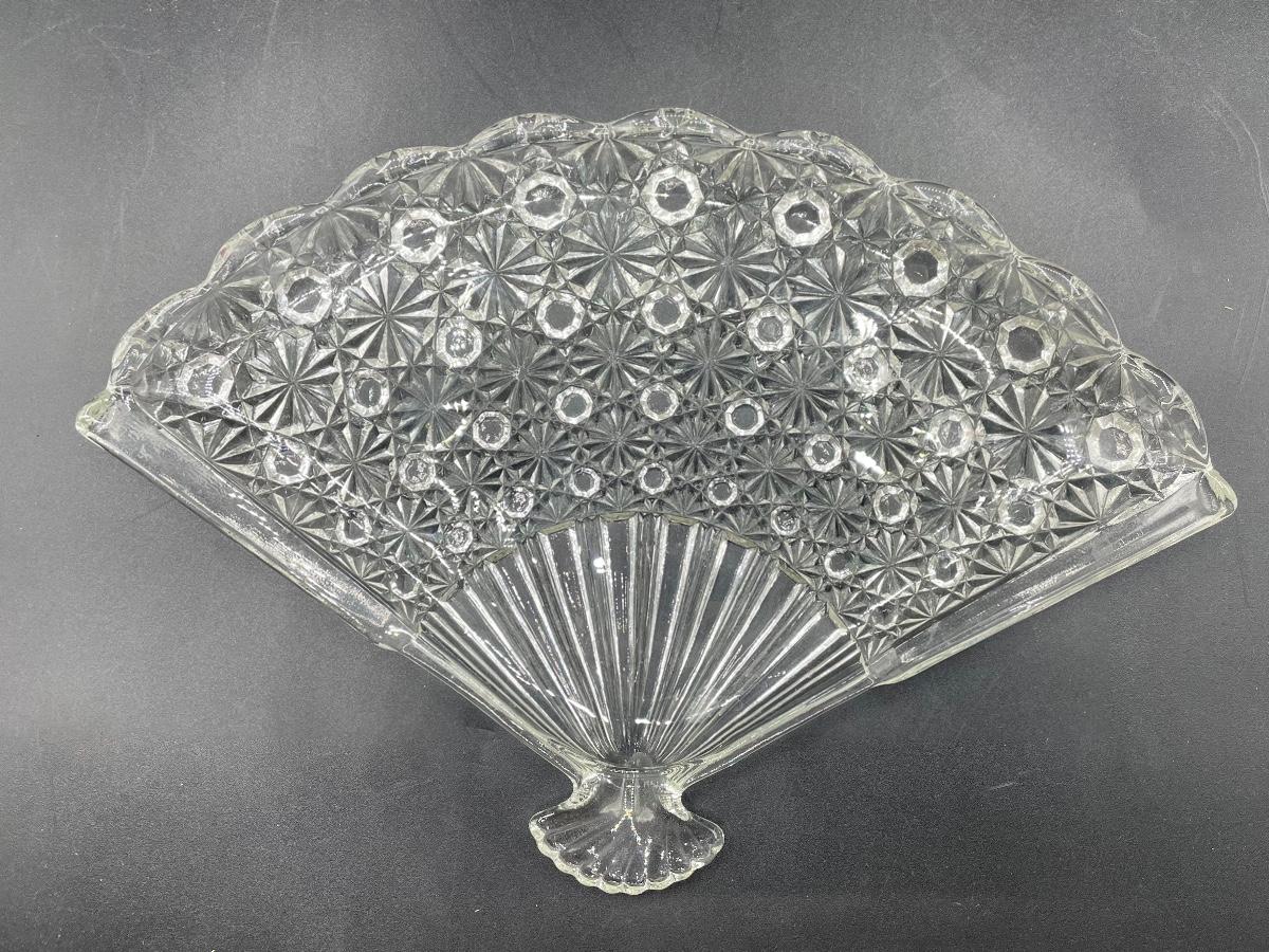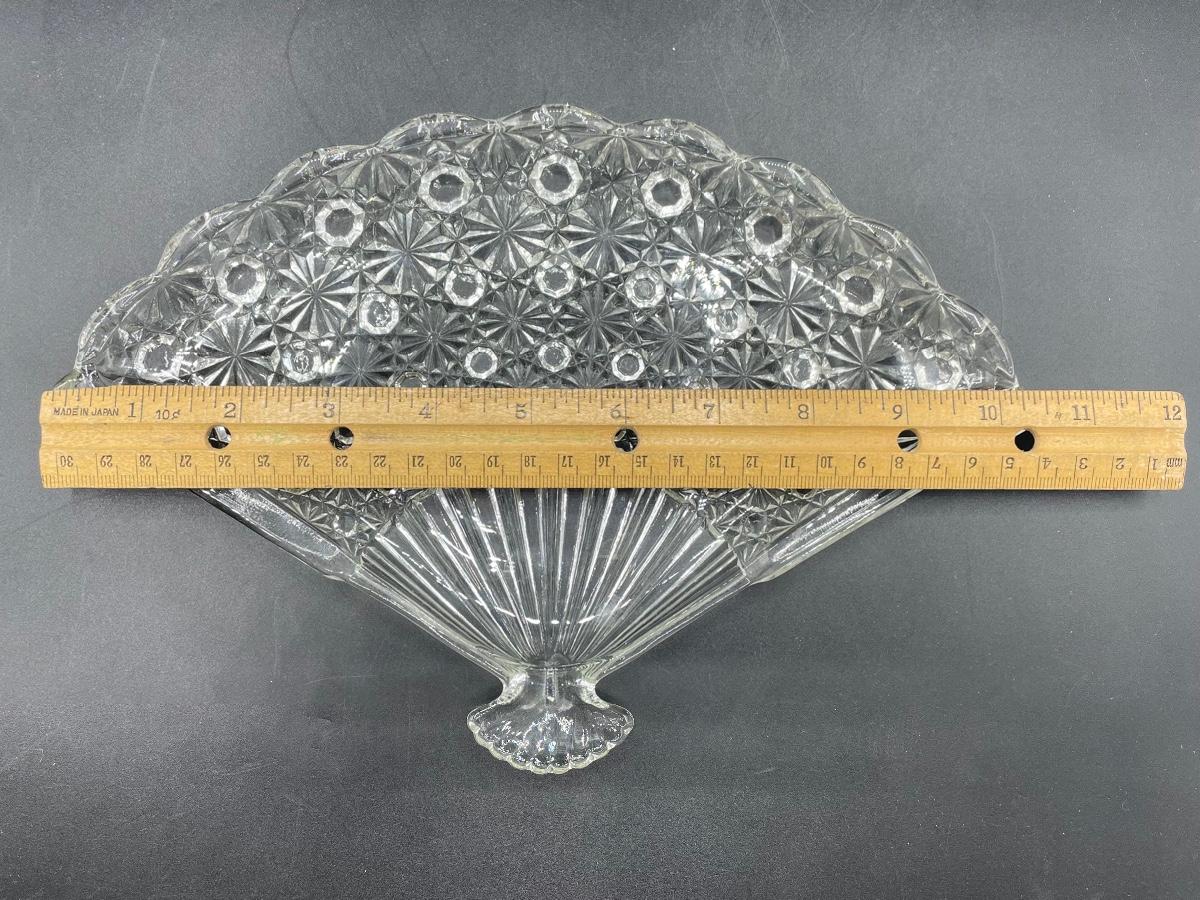 Vintage fan shaped daisy & button pattern depression glass dish. Great as a candy/dessert plate or a vanity trinket dish. Good condition, no chips. About 10" at the widest point.