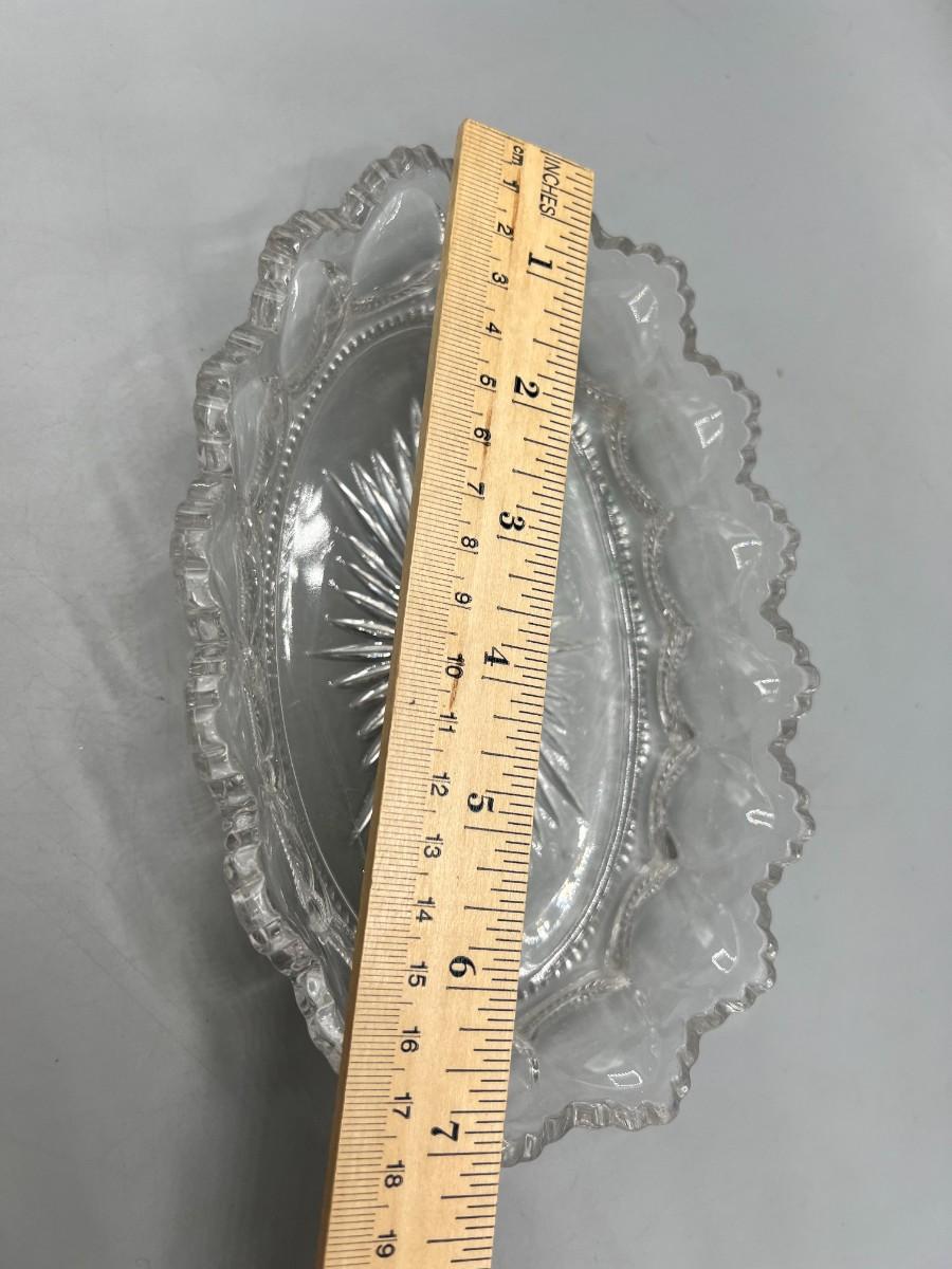 There is no significant cracks or chips to the glass dish and is in overall good collectible and displayable condition. Check pictures for more details and for sizing.