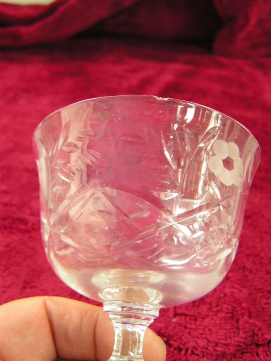 VintageCrystal stemmed wine goblet. Combination of pressed and cut. Maker & vintage unknown. About 5-3/4" tall. Chipped rim.