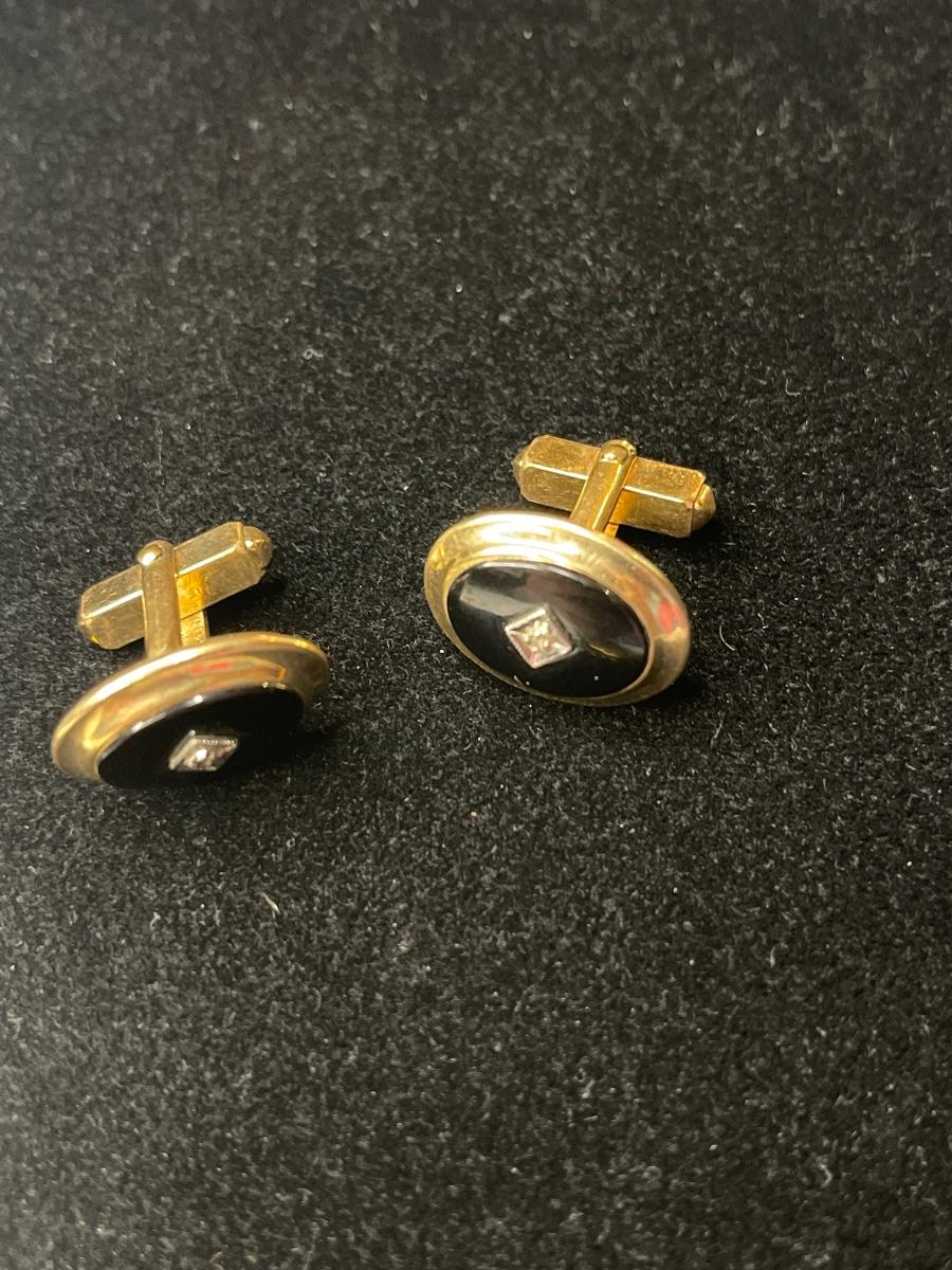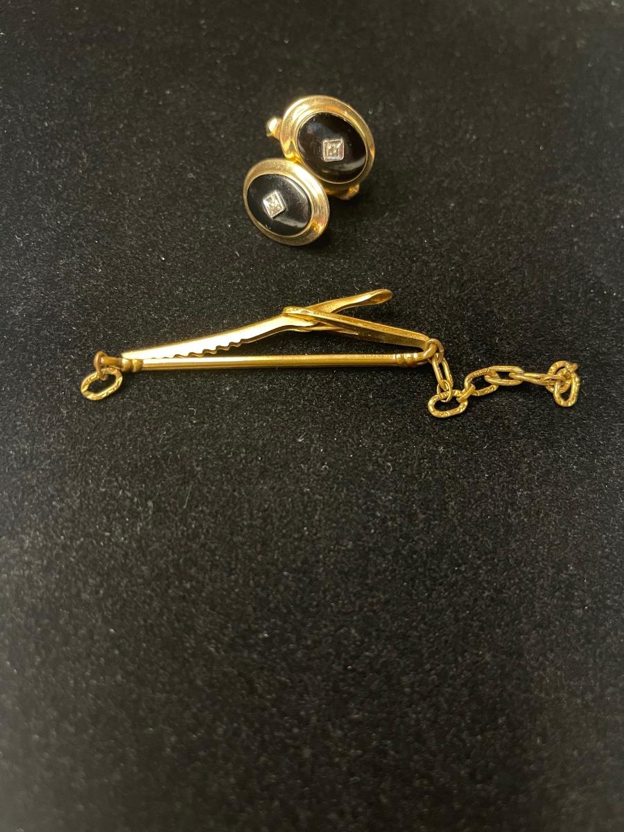 Vintage cufflinks 1950S Anson 1/20 12K GOLD FILLED ““ black with silver stone. And Hickok tie clip very nice set.
