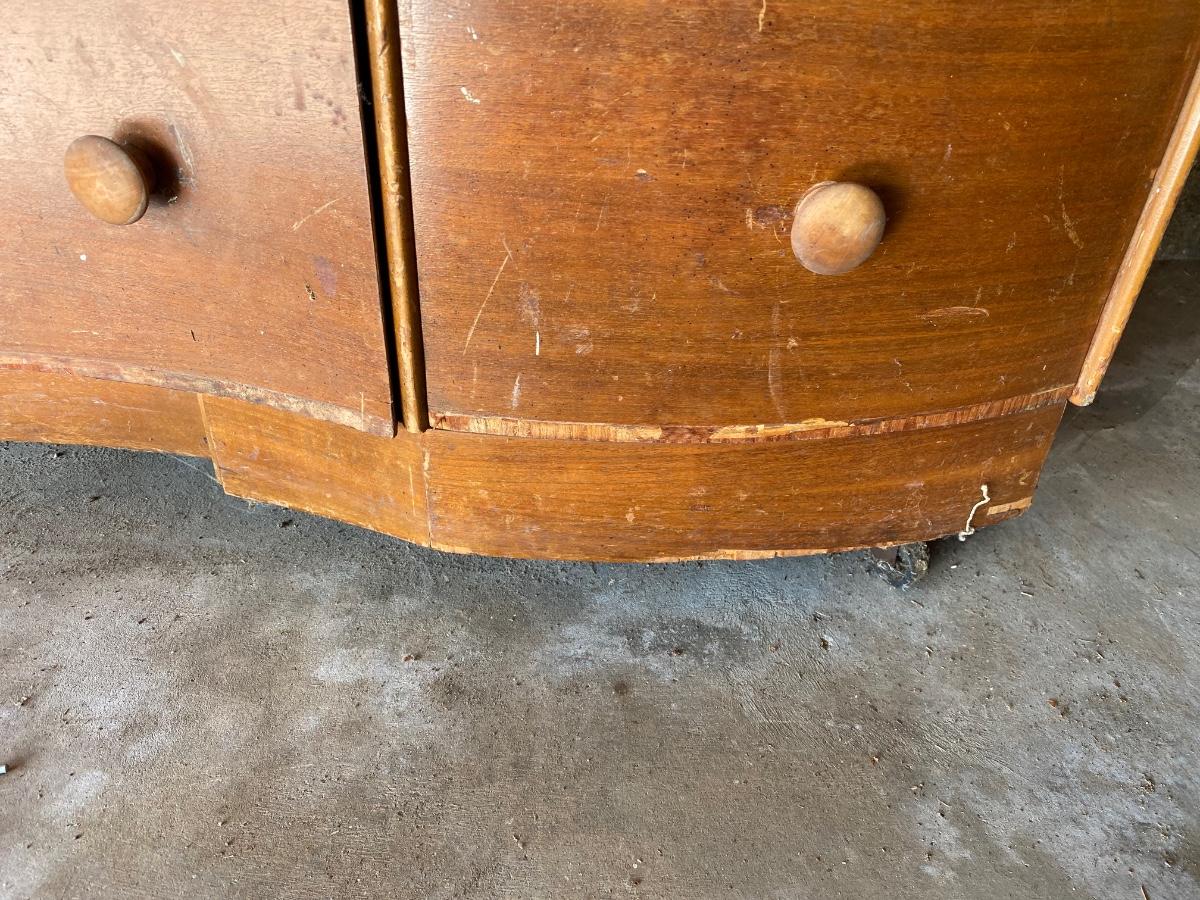 Vintage Curved Front Vanity Dressing Table. Currently used in garage, bench top not attached. Needs some TLC but not in too bad of condition. 8 drawers. See photos. About 4' length.