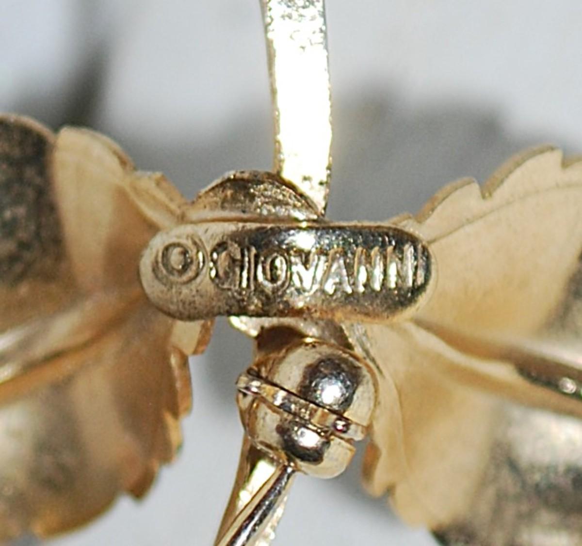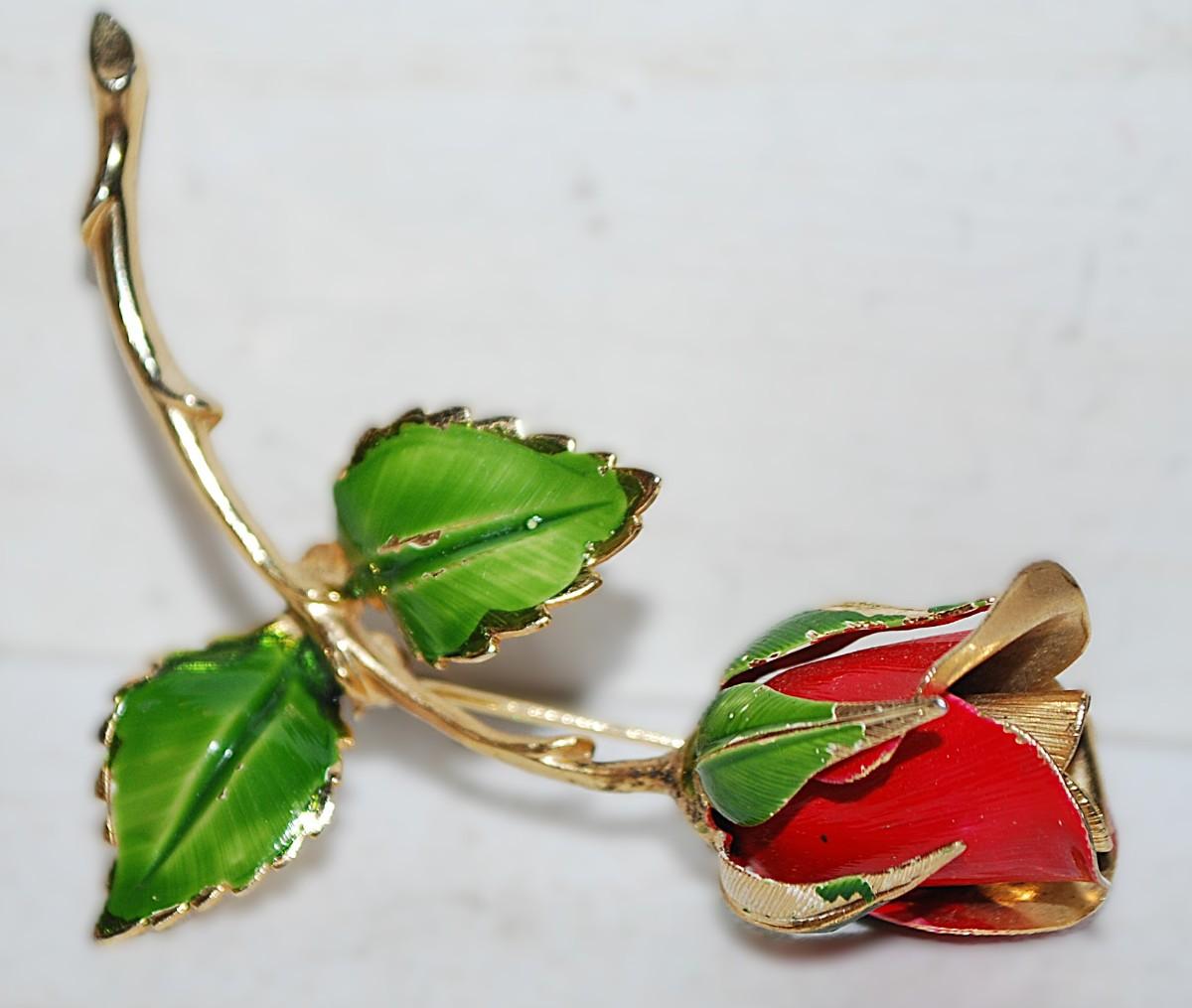 VINTAGE Curved Stem ROSE BROOCH (3" x 1½") -- Marked "Giovanni" -- with Green Leaves and Gold Tone Setting