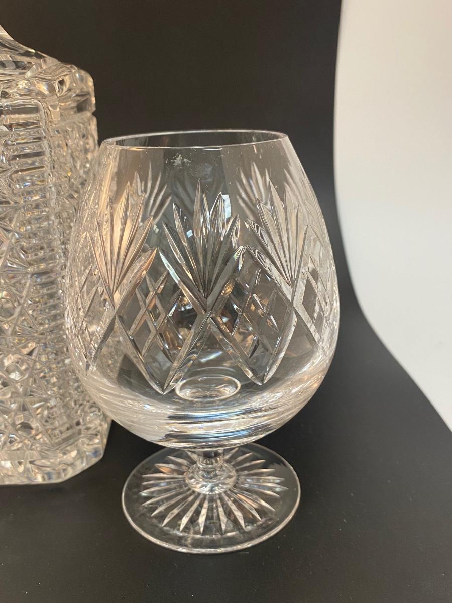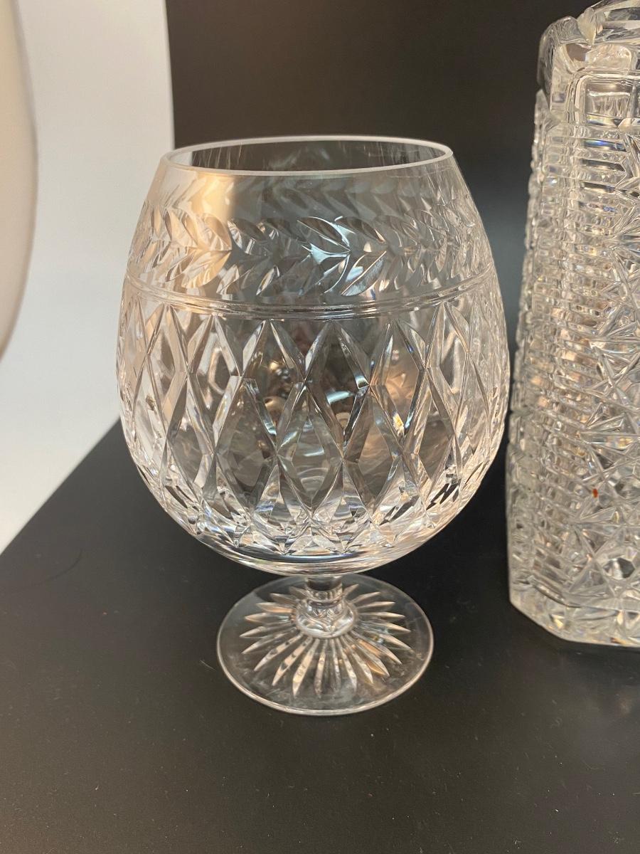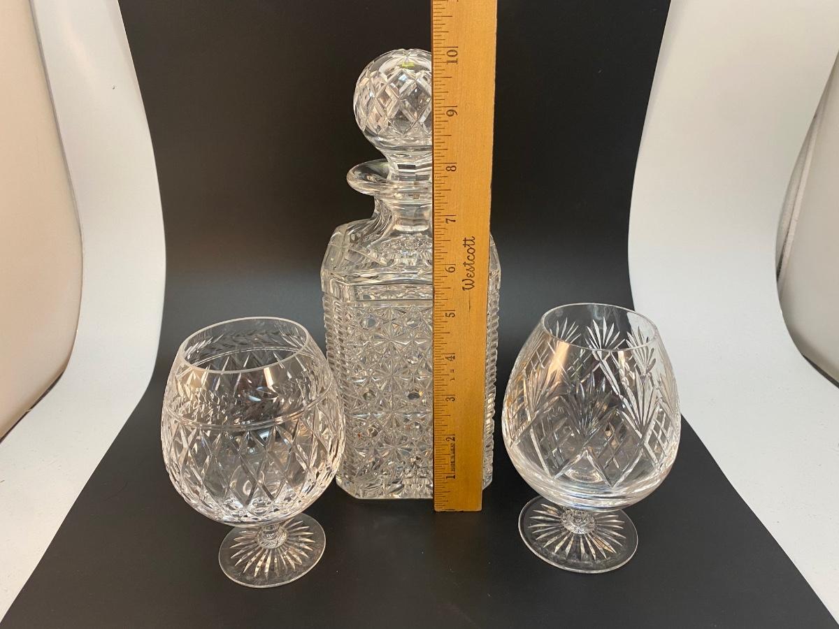 Vintage Cut Crystal Decanter with Two Brandy Snifters Barware Drink Glasses. Good condition no chips found. Decanter is thick heavy crystal while the glasses are thin and delicate. Glass patterns are different from each other.