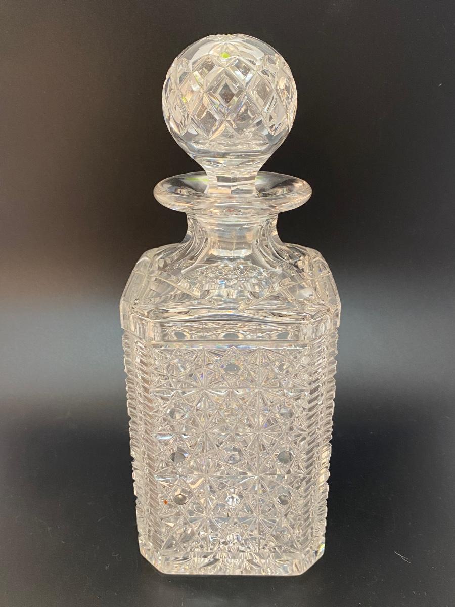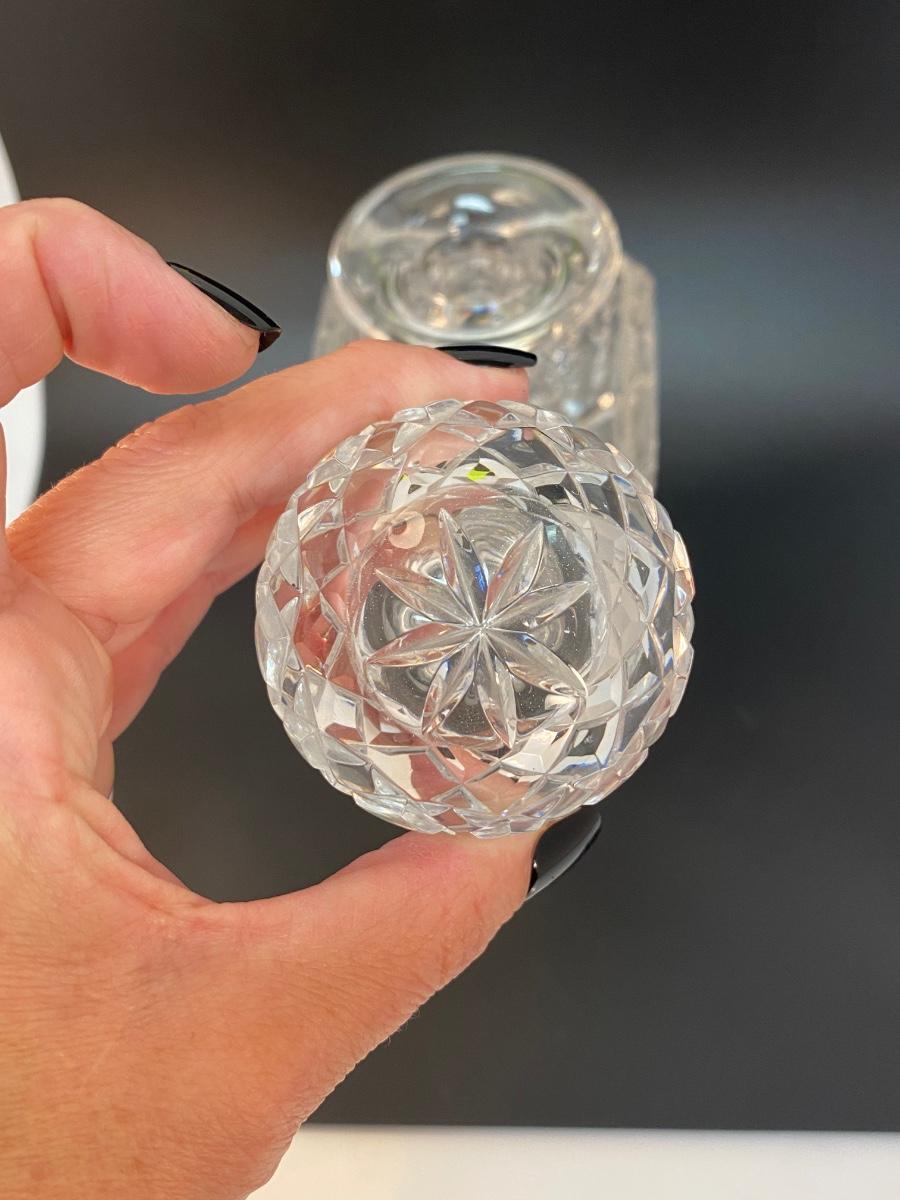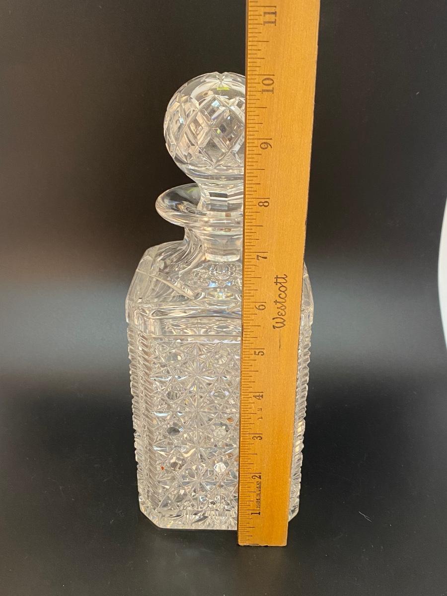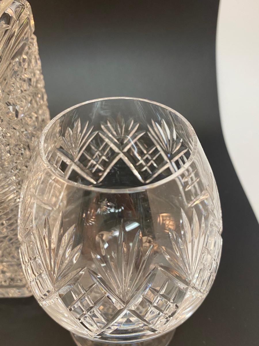 Vintage Cut Crystal Decanter with Two Brandy Snifters Barware Drink Glasses. Good condition no chips found. Decanter is thick heavy crystal while the glasses are thin and delicate. Glass patterns are different from each other.