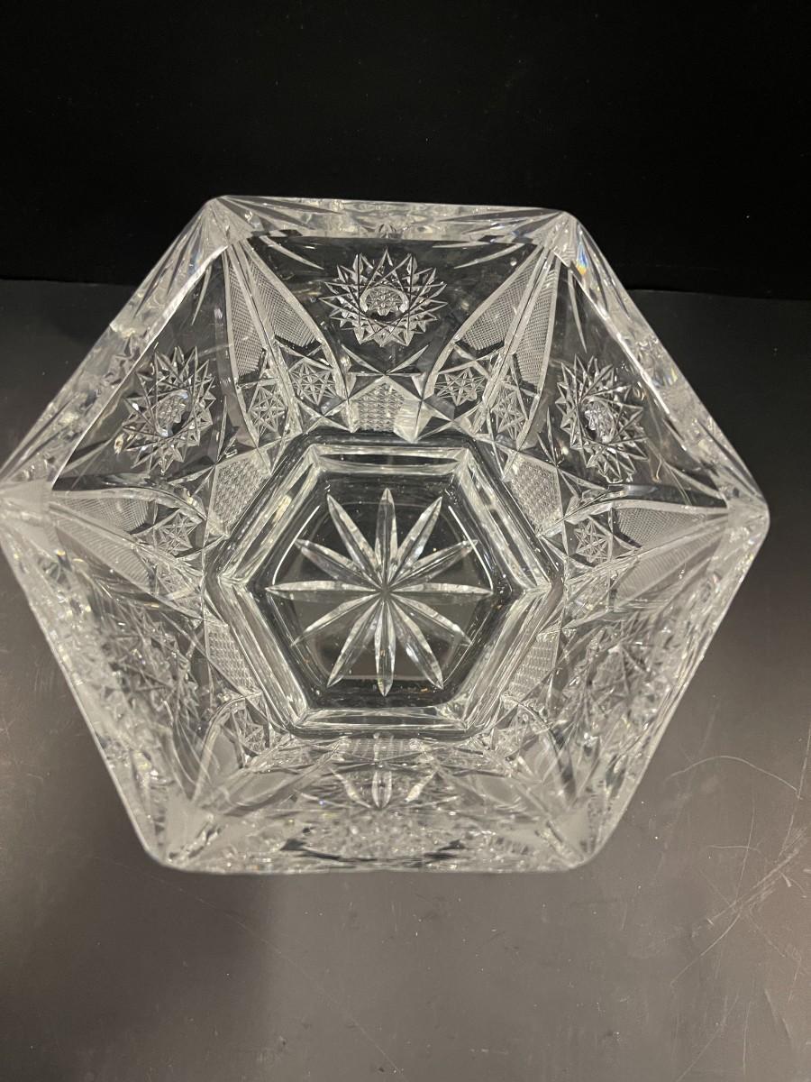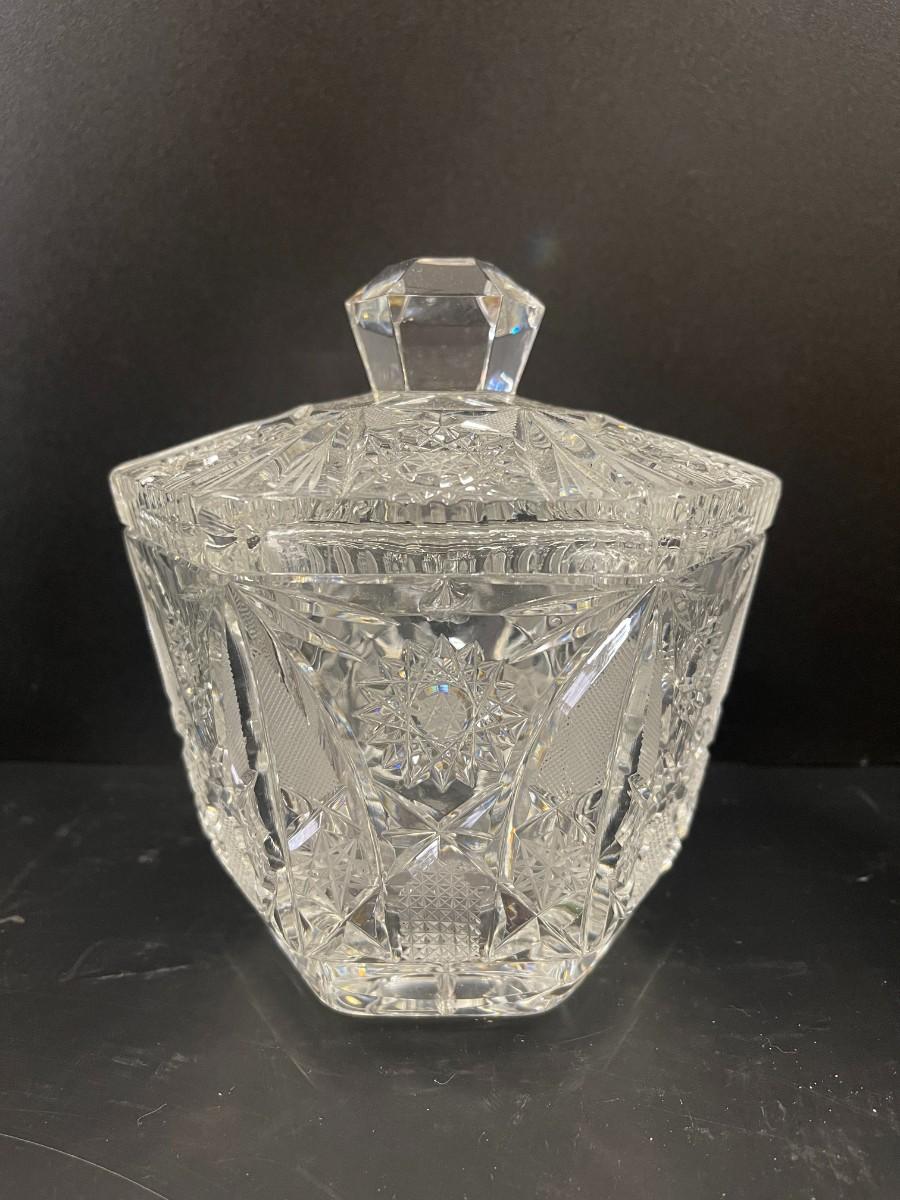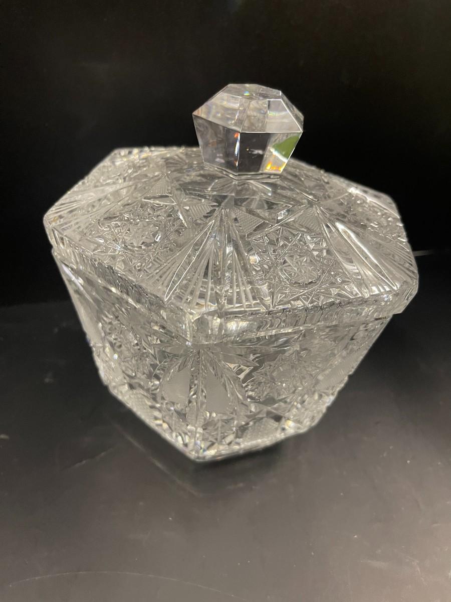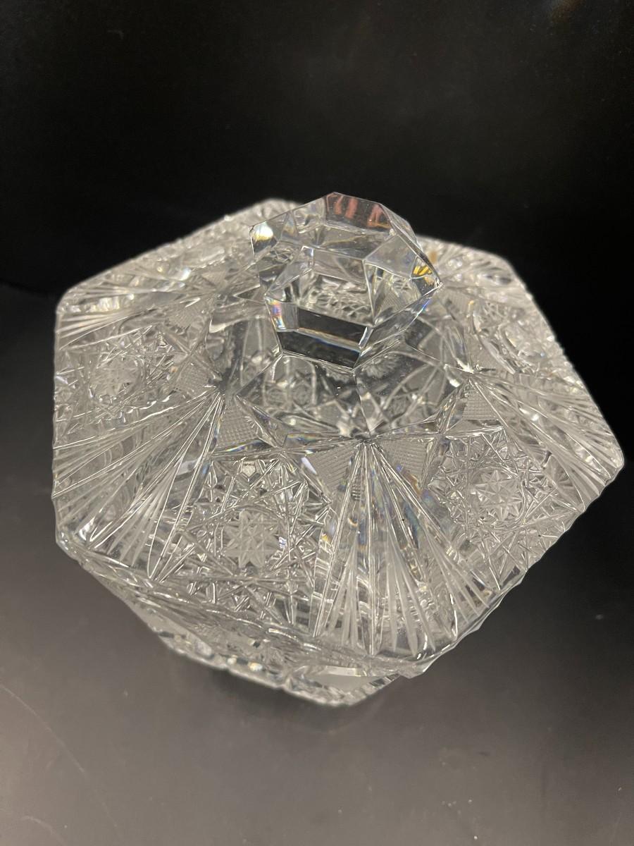 Stunning cut crystal glass jar with lid. Excellent condition. No chips, cracks or repairs. 6" x 6 1/2" high (to top of finial). #1175