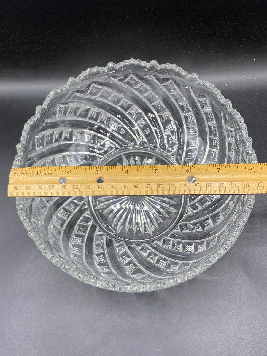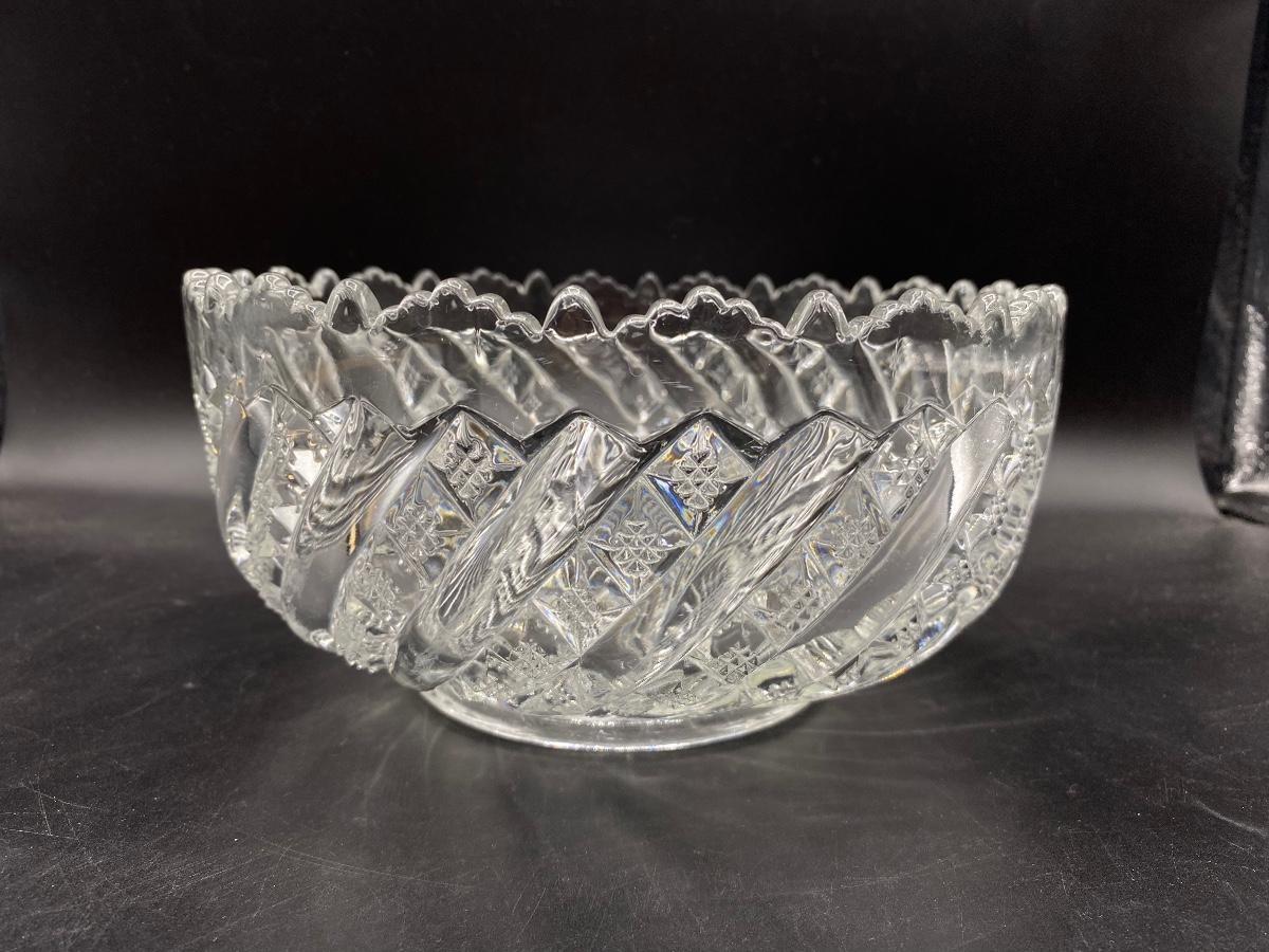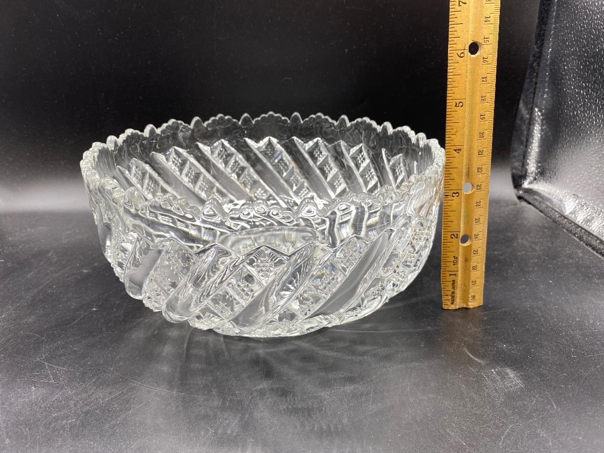 Vintage cut crystal glass serving bowl. Soft sawtooth edge with a swirled cut pattern. About 8" wide and 4" deep. In good condition.