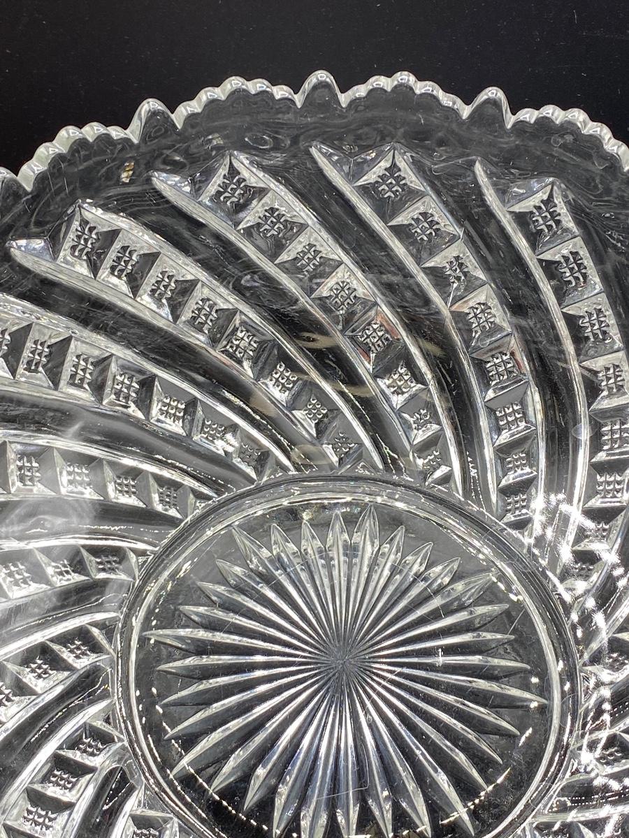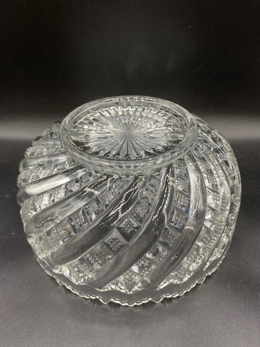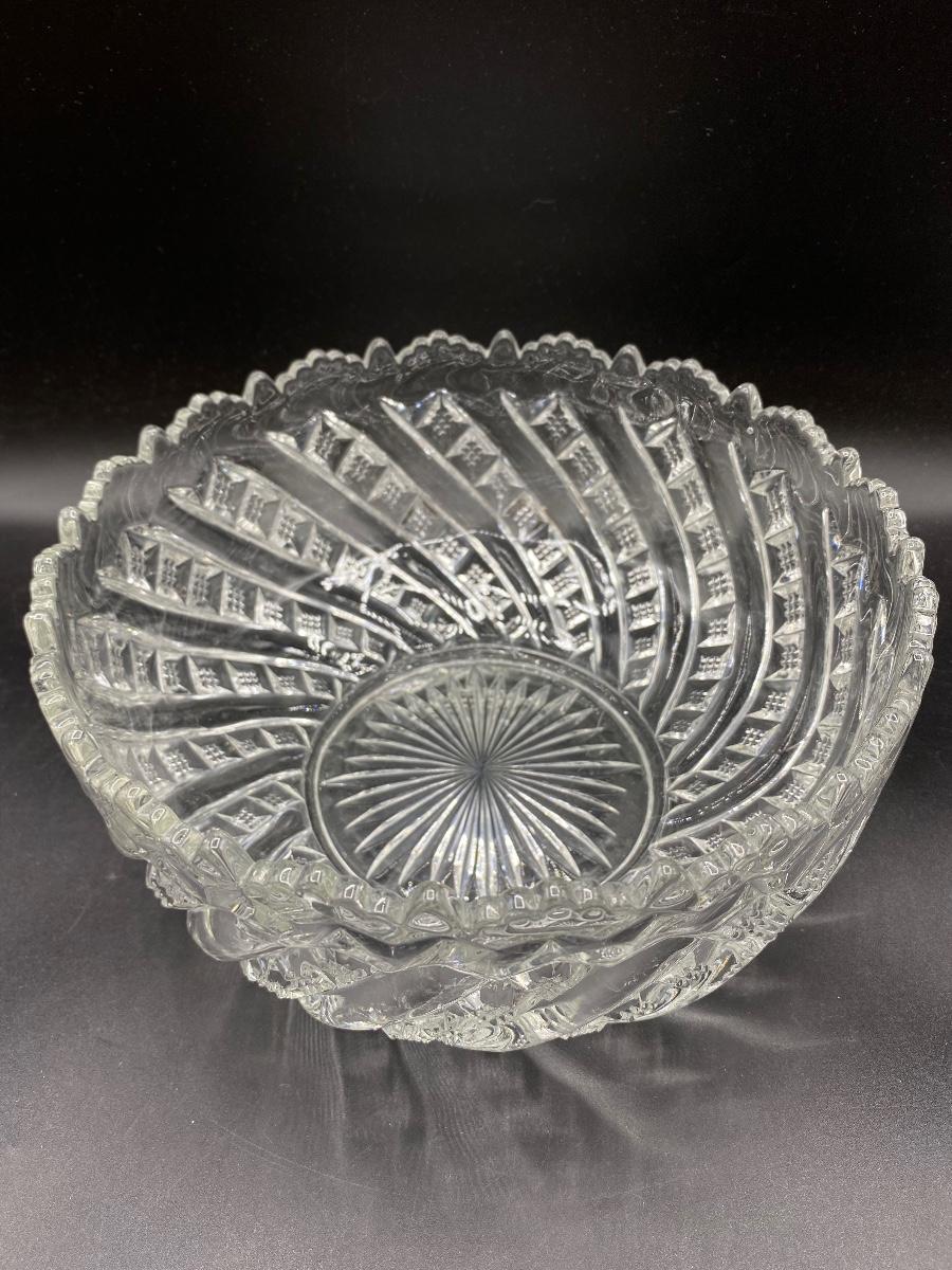 Vintage cut crystal glass serving bowl. Soft sawtooth edge with a swirled cut pattern. About 8" wide and 4" deep. In good condition.