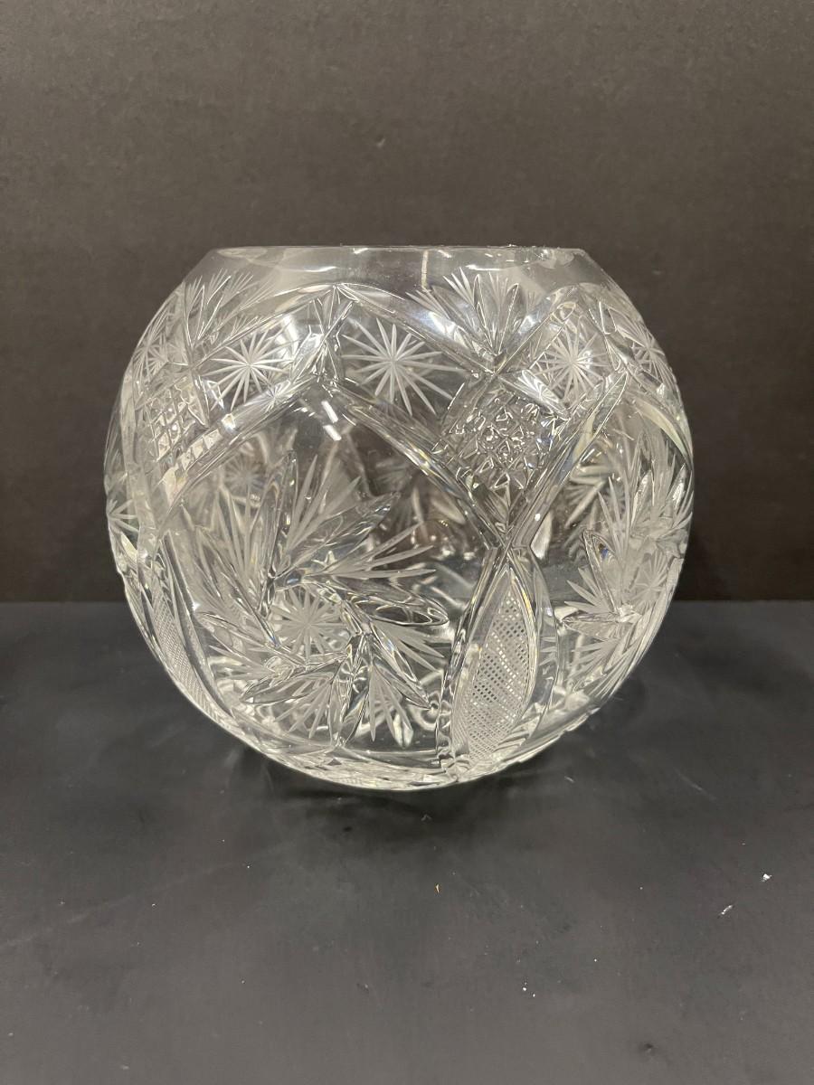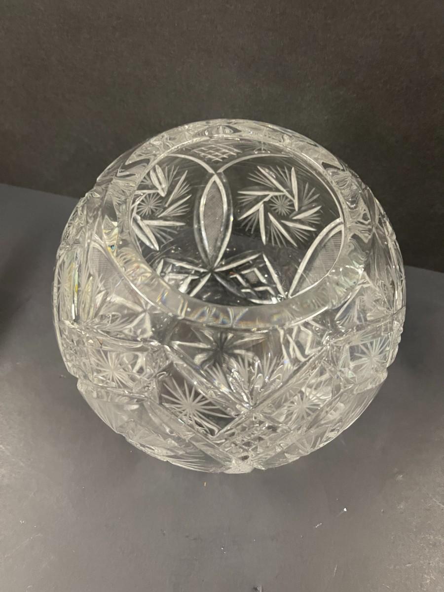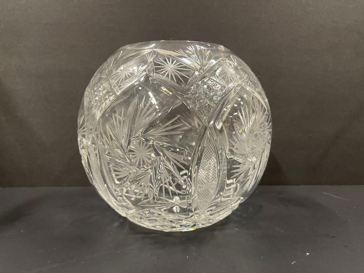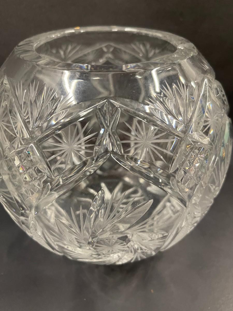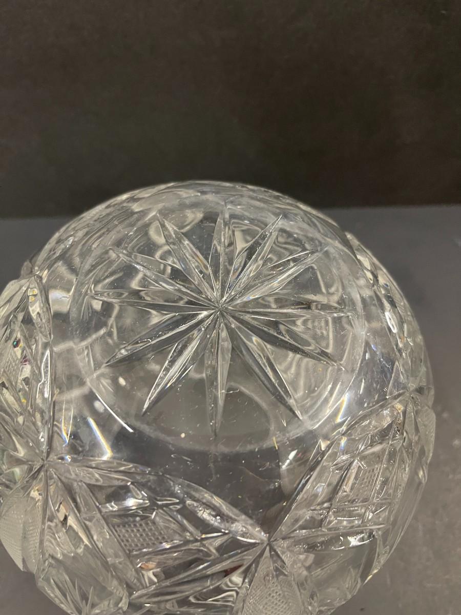 Vintage cut crystal rose bowl vase, pinwheel pattern. Very good condition with some minor scratches, specifically on the underside, consistent with age and use. 7" wide x 6" high.