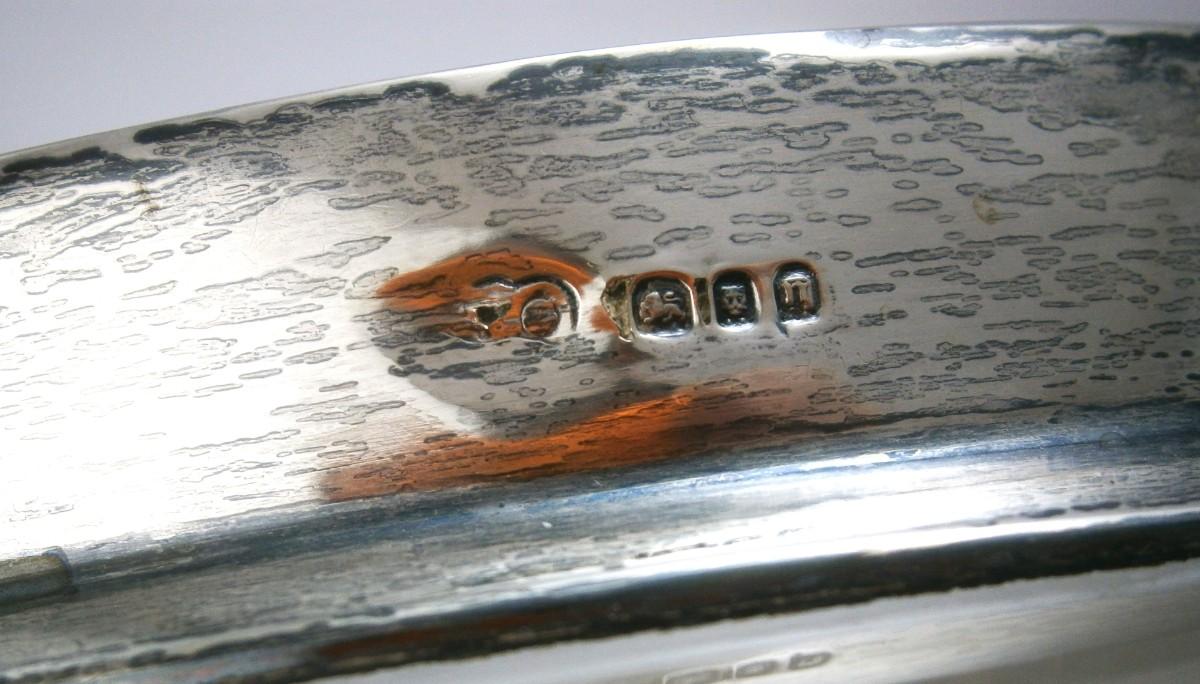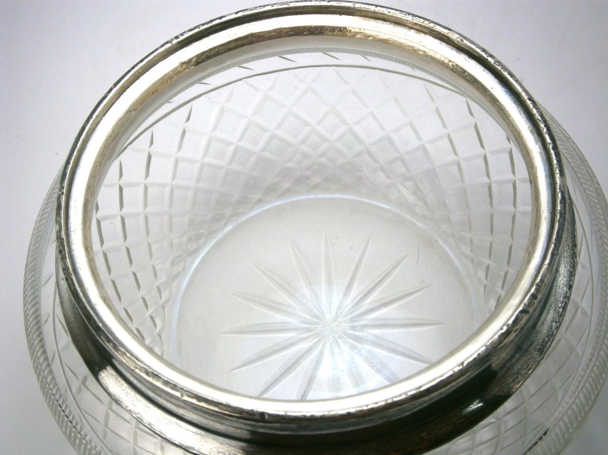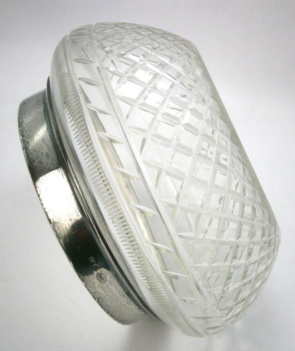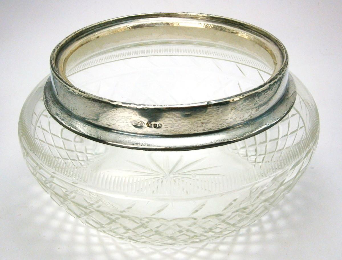 Vintage Cut Glass Bowl with Sterling Silver Rim made in England, London hallmarks, top rim is 5 1/4 in. diameter, overall diameter is approx. 7 in., 4 1/4 in. tall, appears that it may have originally taken a lid.