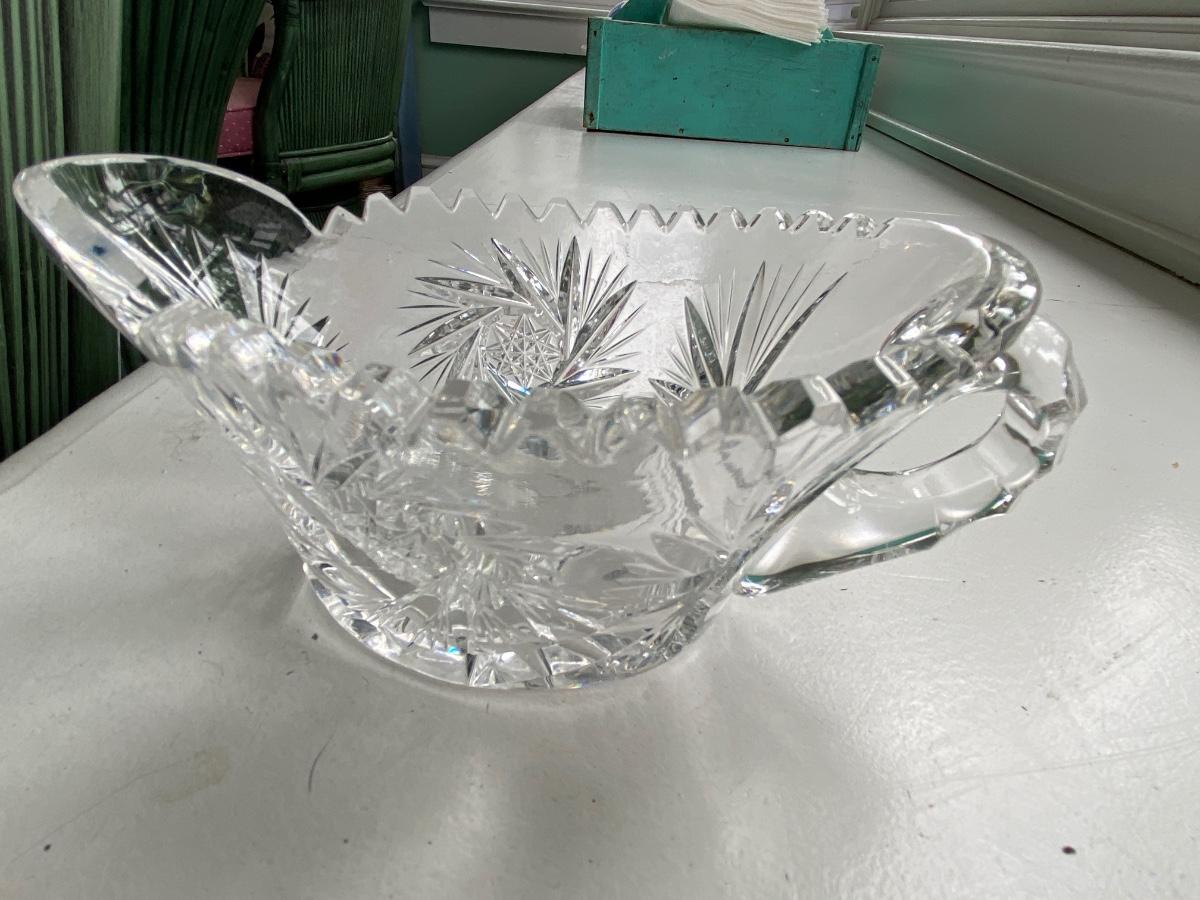 Stunning thick American Brilliant cut glass gravy boat from Squire Mansion. Sawtooth rim, wide lip.. The bowl is 3 inches tall, 7 inches long and 4 inches wide. Shows beautifully. Has no chips or cracks.