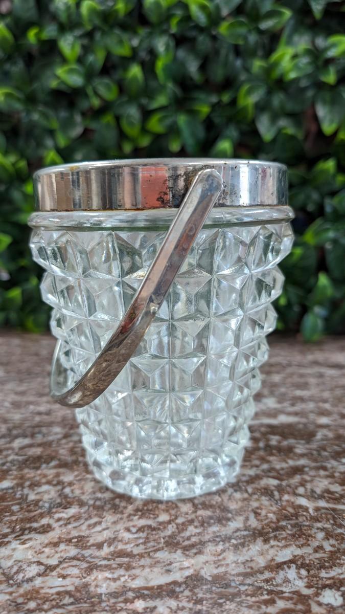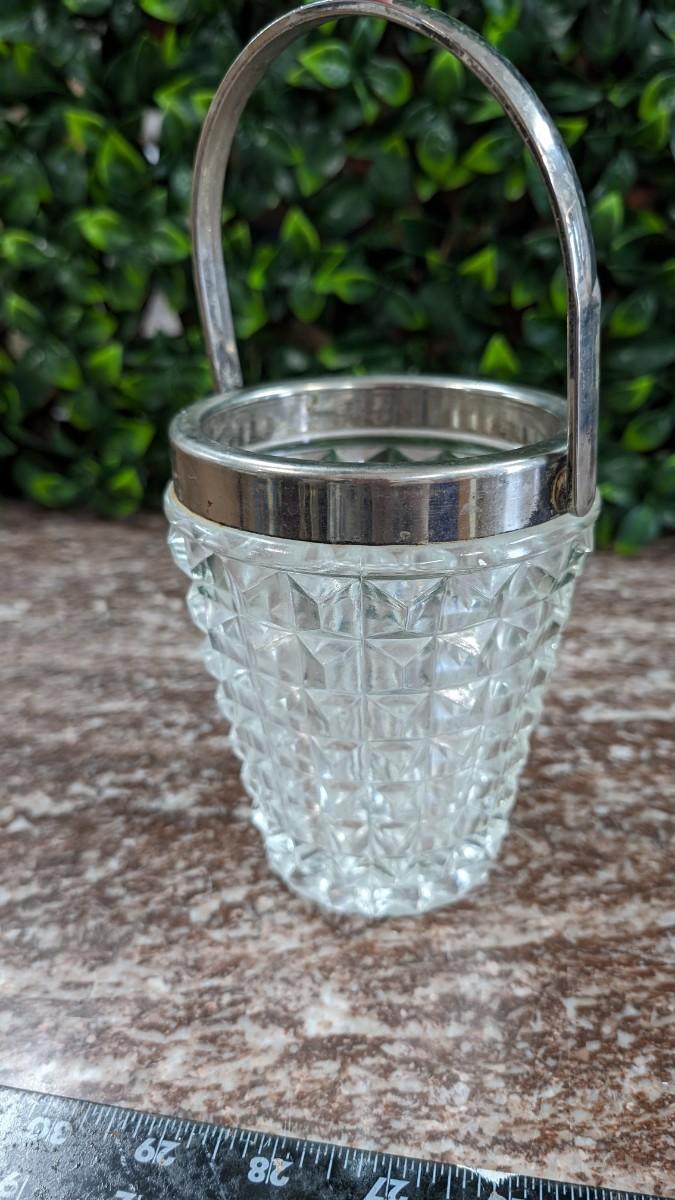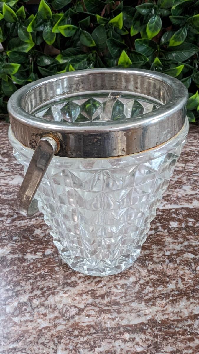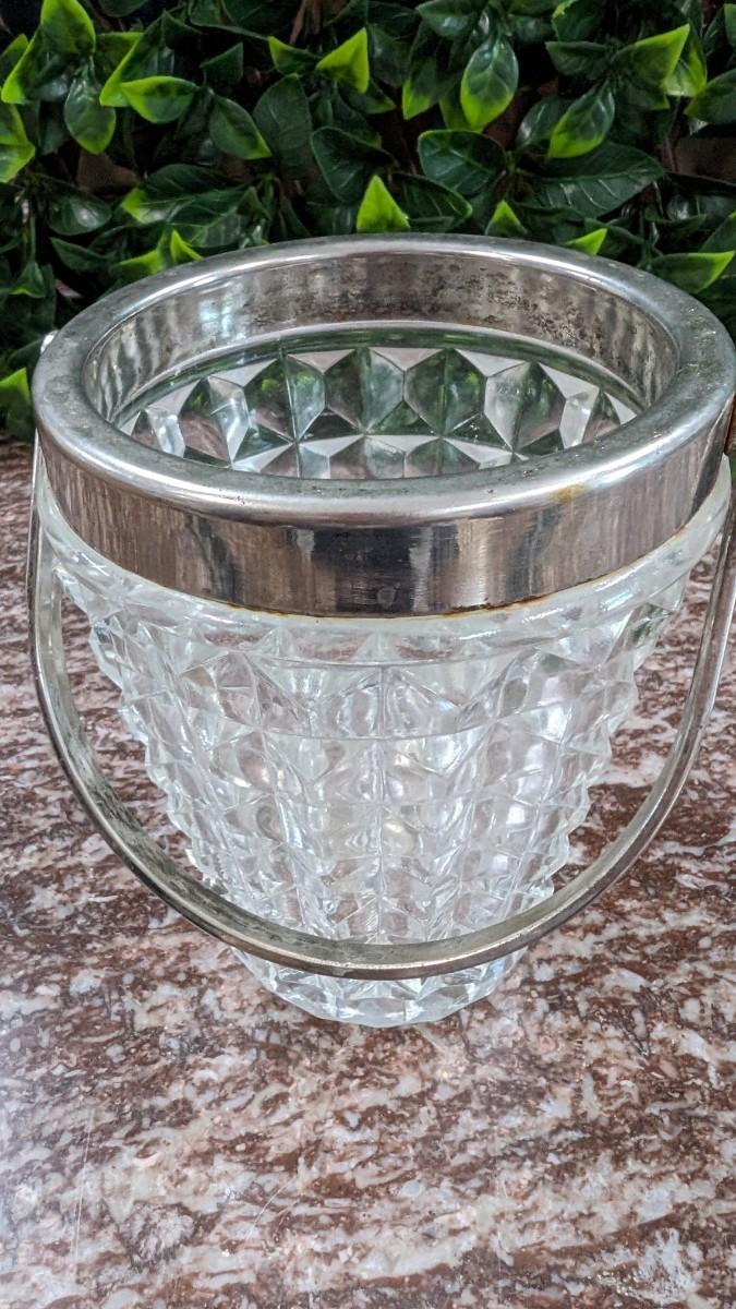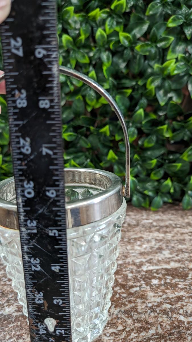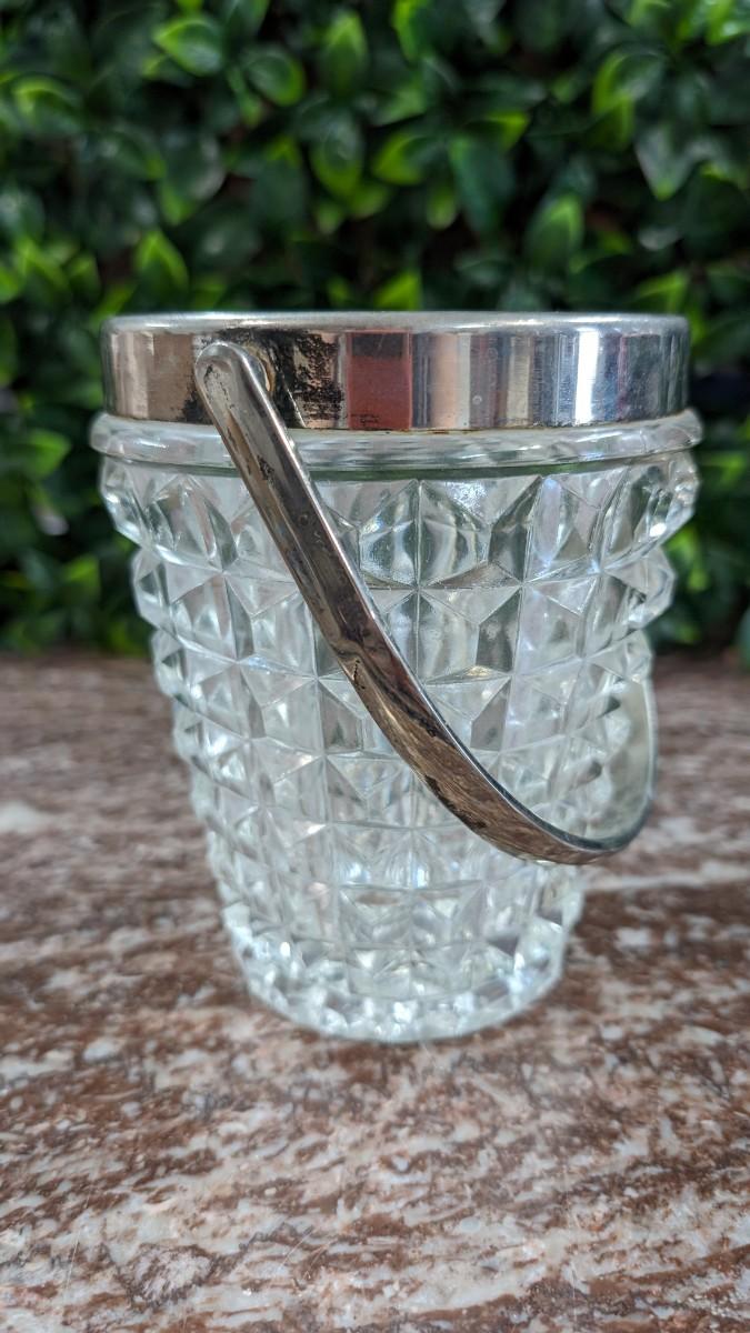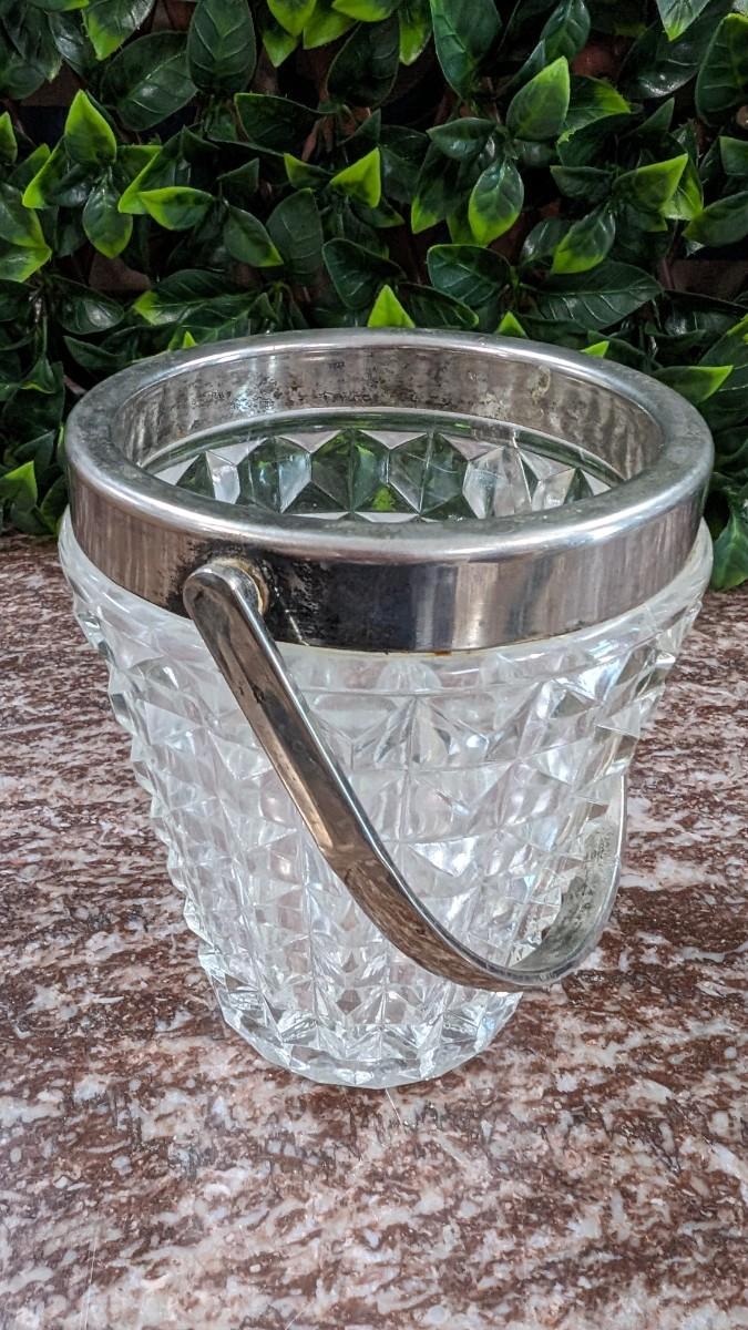 This is a Vintage Cut Glass Crystal Ice Bucket with Silverplate Rim and Handle