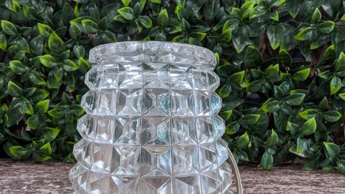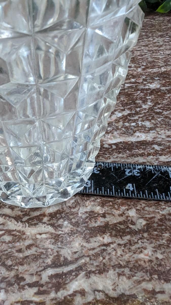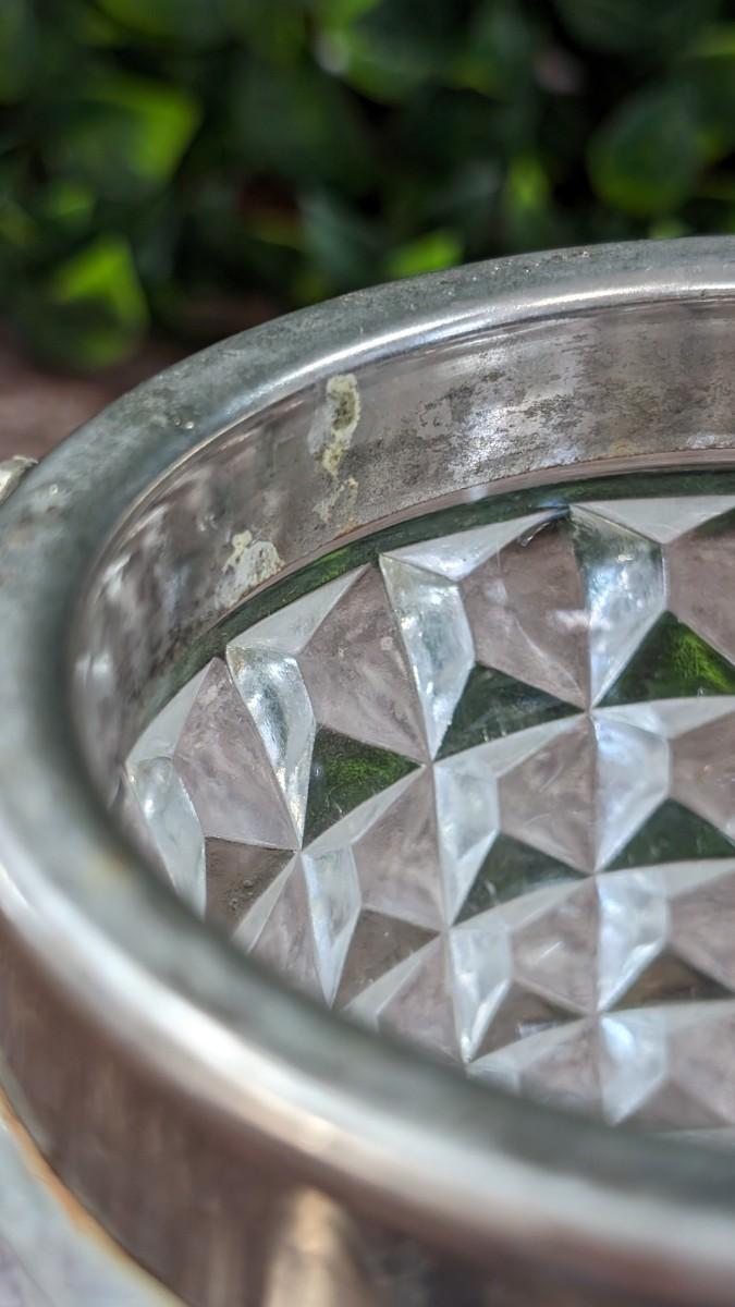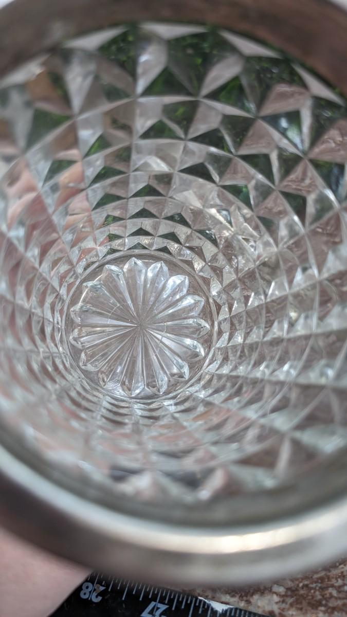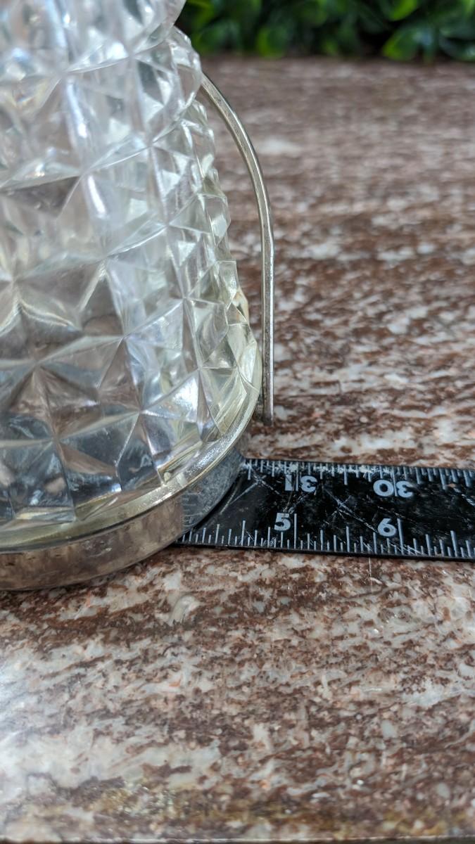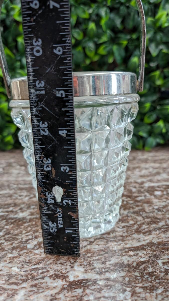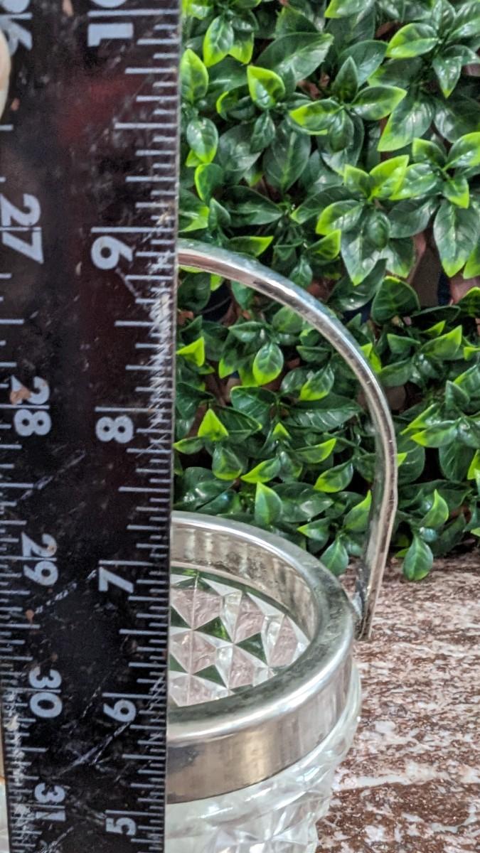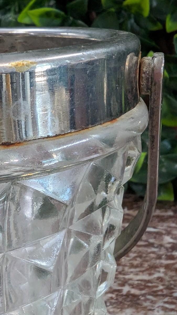 This is a Vintage Cut Glass Crystal Ice Bucket with Silverplate Rim and Handle