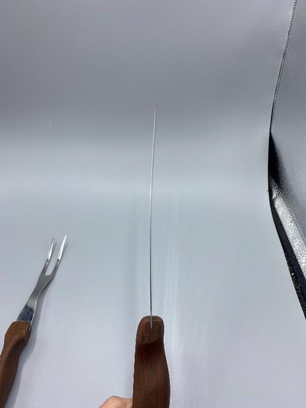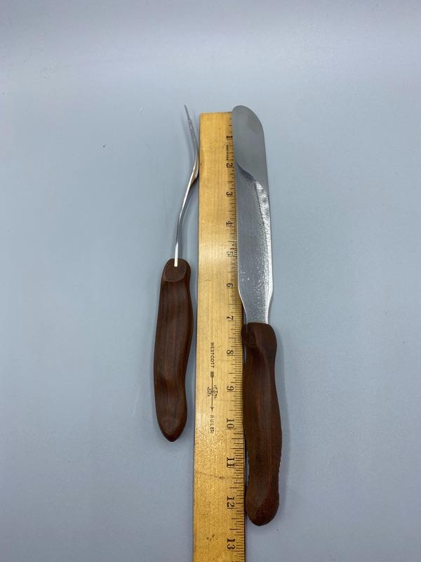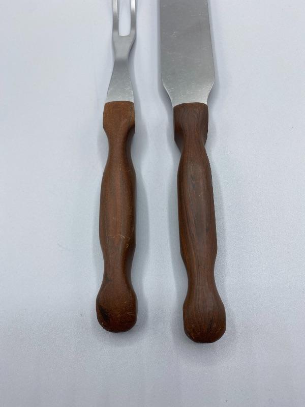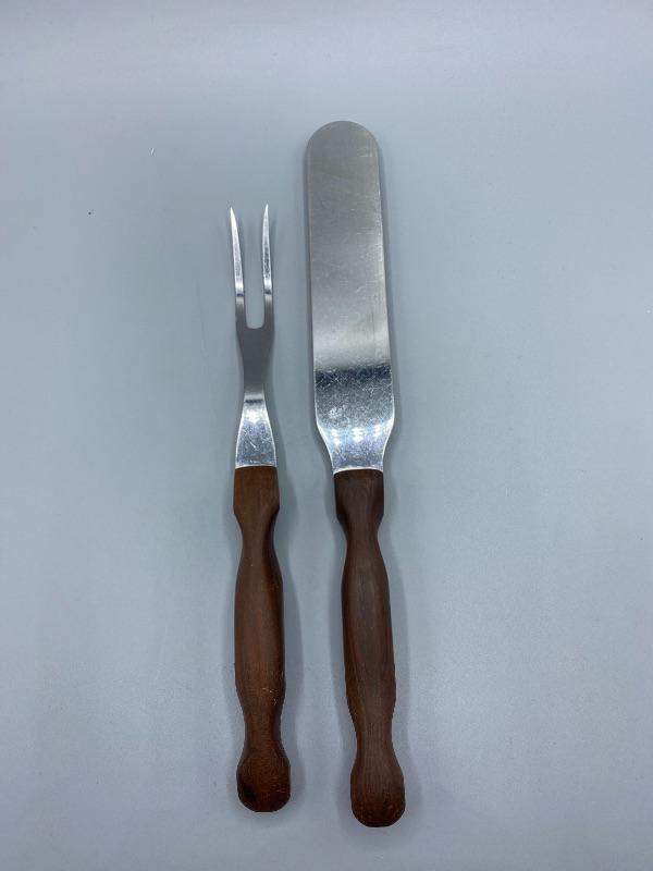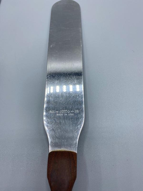 Pair of vintage CUTCO utensils. Matching wood grain styled handles. #28 is a spreader spatula, about 12.5" long. #26 is a 2 prong meat fork, about 10,5" long. Both are in good previously owned condition.