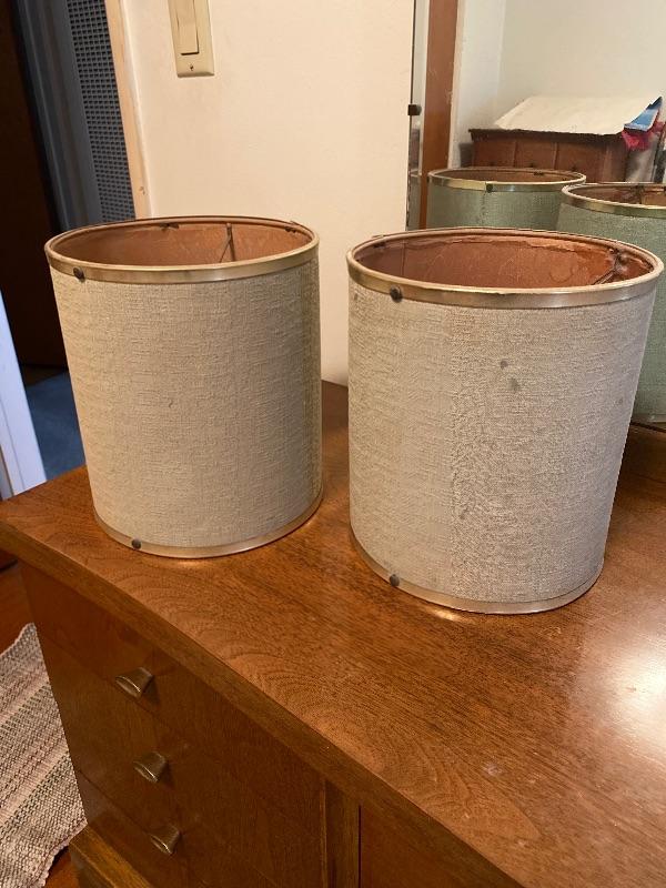 Vintage lamp shades. Kind of a grey green color with gold edges. Measure 9” tall and about 8” wide