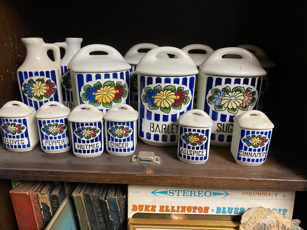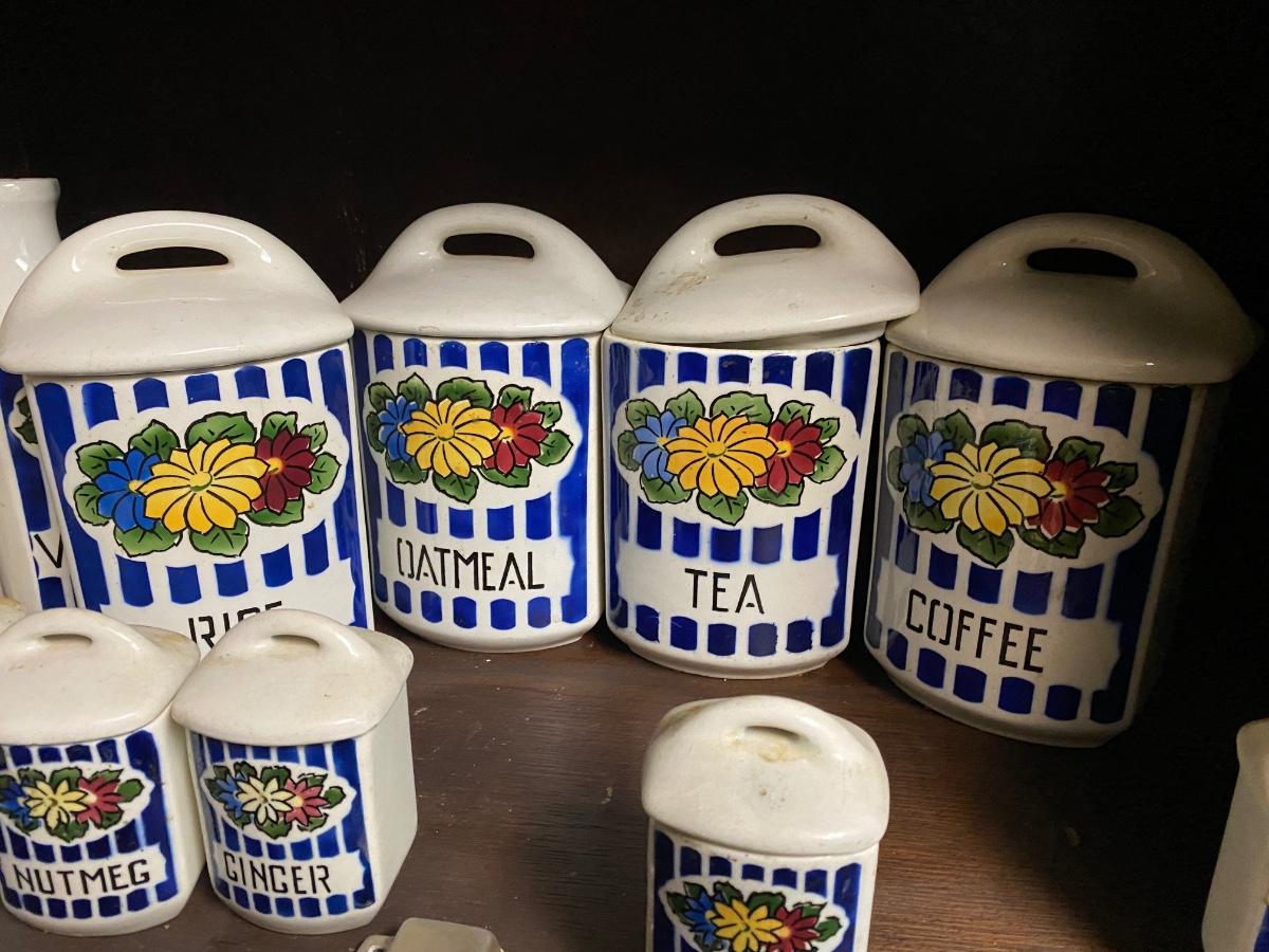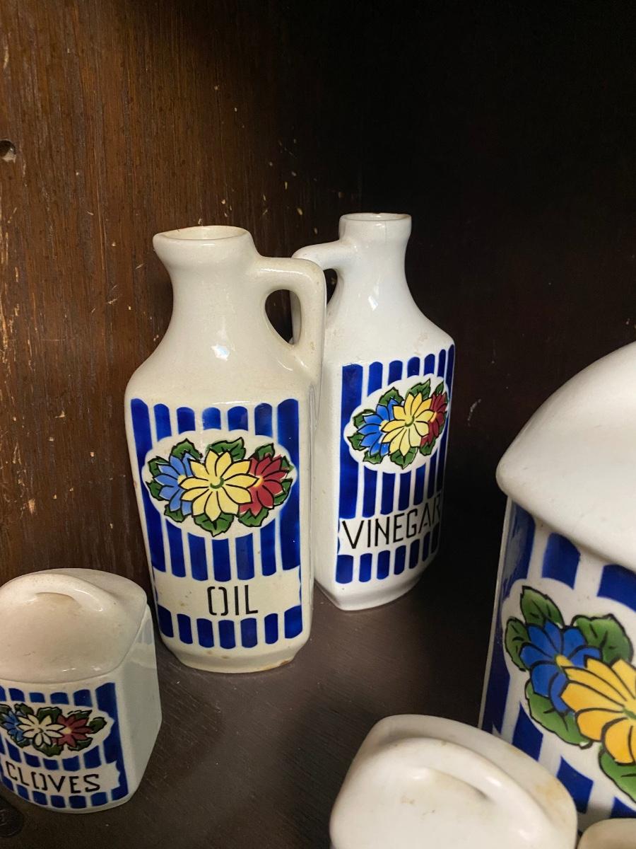 Vintage Czech cannister set, Flower and striped pattern. Has containers for spices, coffee, tea, flour , sugar and more along with oil and vinegar cruets. Needs a cleaning, but no signs of damage.