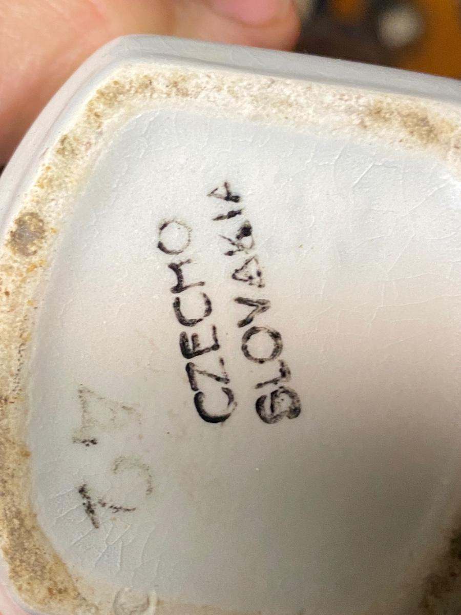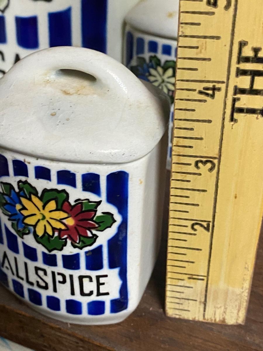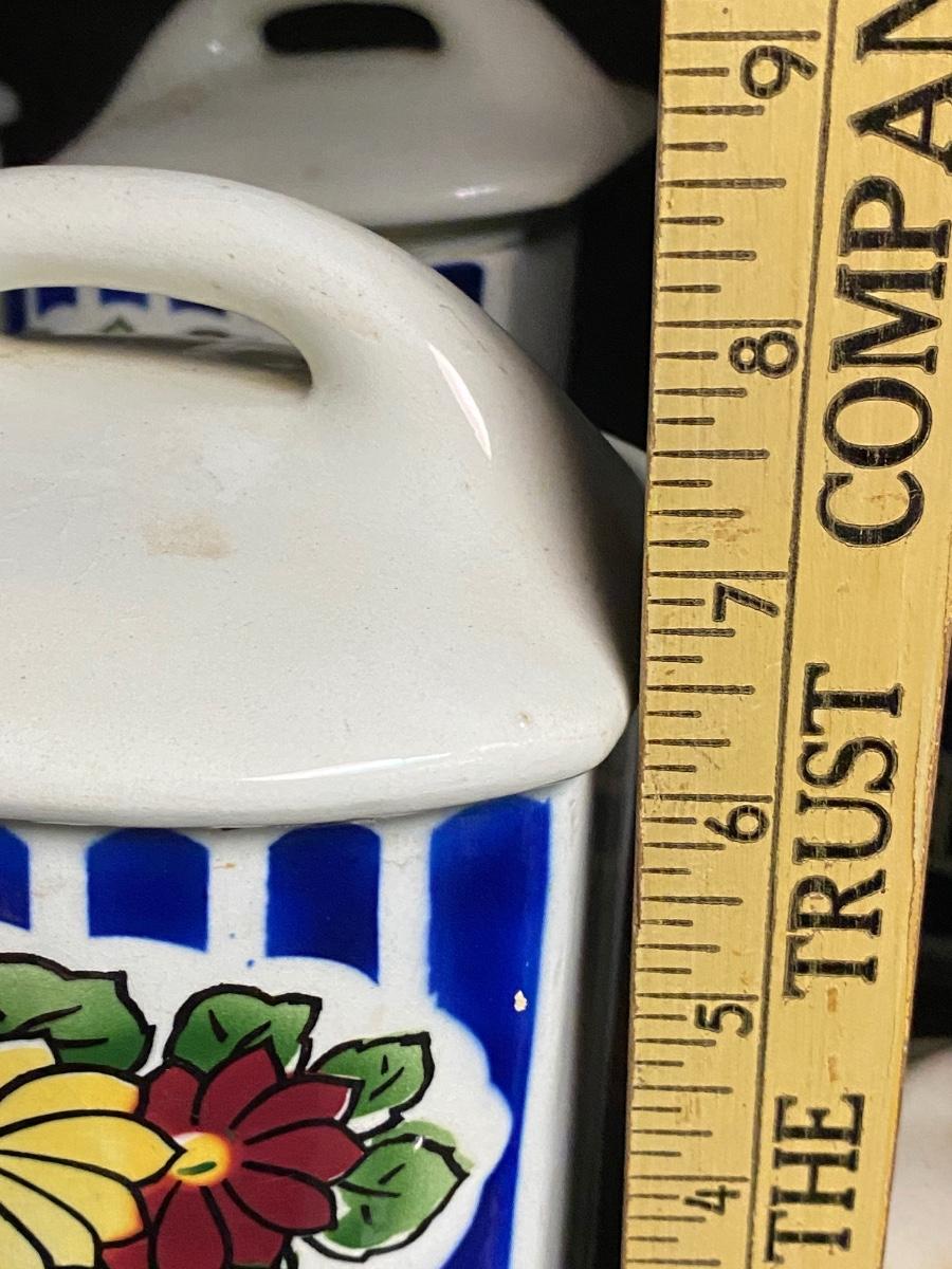 Vintage Czech cannister set, Flower and striped pattern. Has containers for spices, coffee, tea, flour , sugar and more along with oil and vinegar cruets. Needs a cleaning, but no signs of damage.