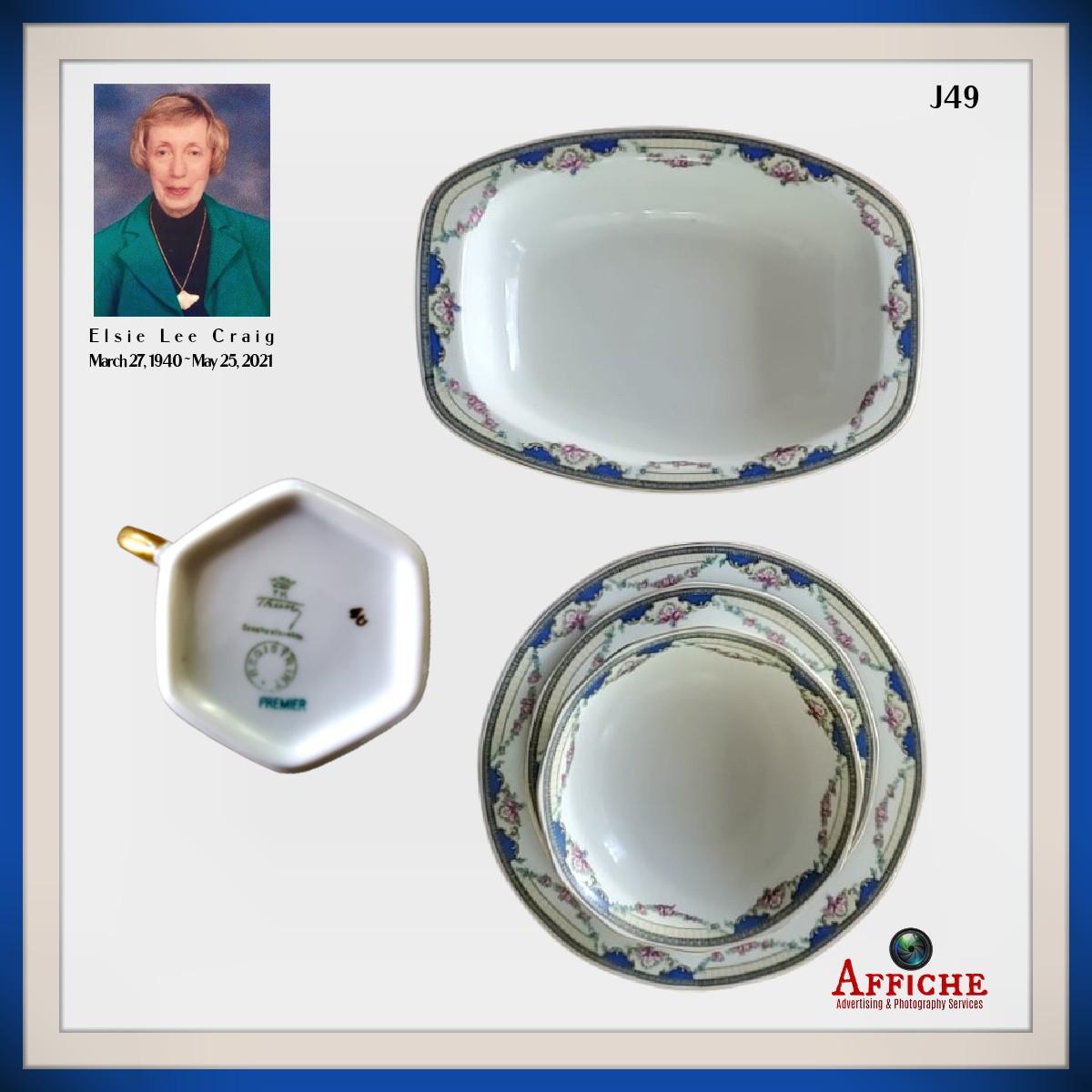 12 Dinner Plates, 12 Salad Plates, 12 Desert Plates, 12 Large Bowls, 12 Small Bowls, 12 Saucers, 11 Cups