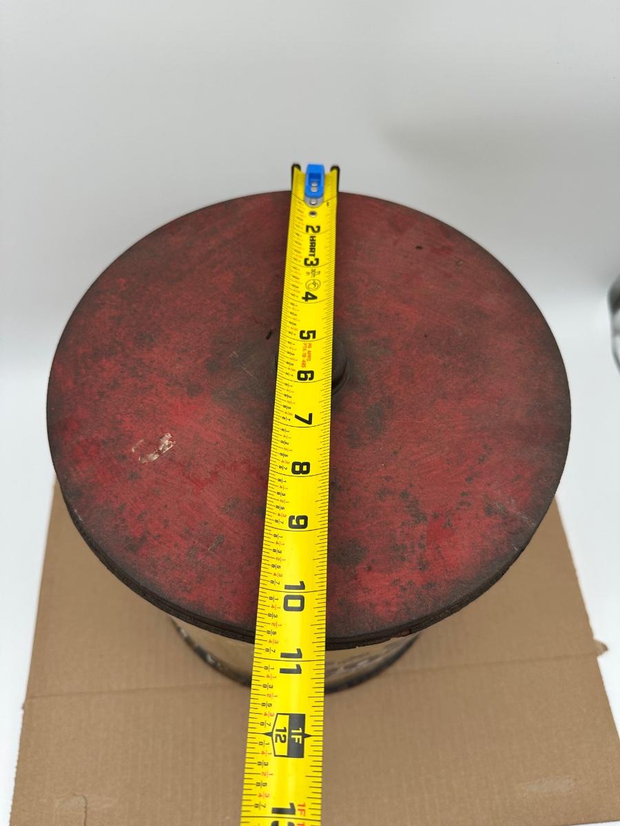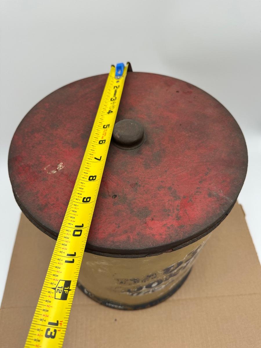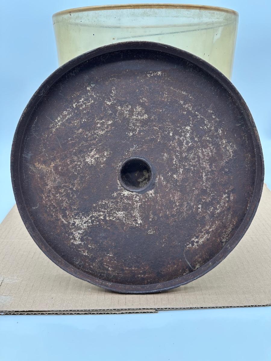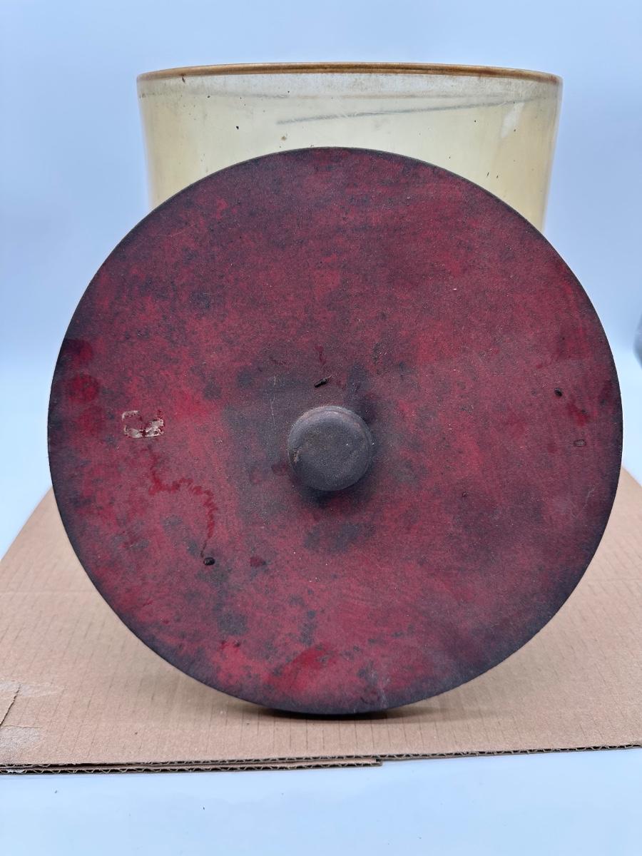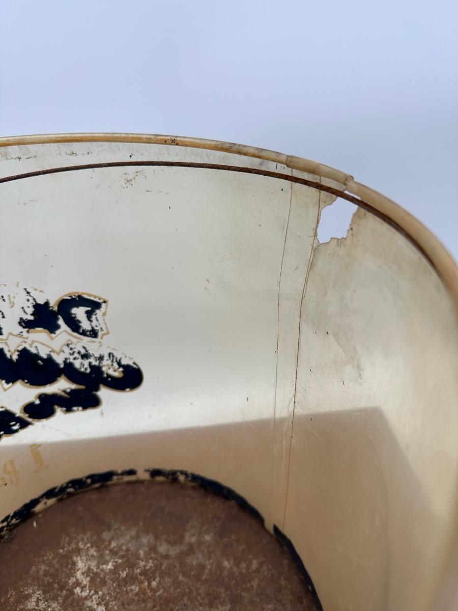 As-found condition. Heavy surface scratching, clouding, paint loss, and discoloration. Crack and chip at rim (see photos). Bottom shows corrosion from age/use. Lid has surface rust and wear. Still a strong display piece despite flaws.