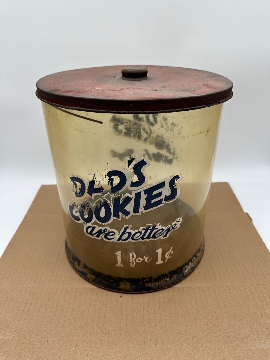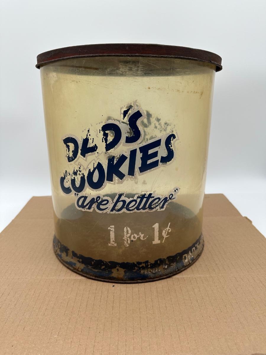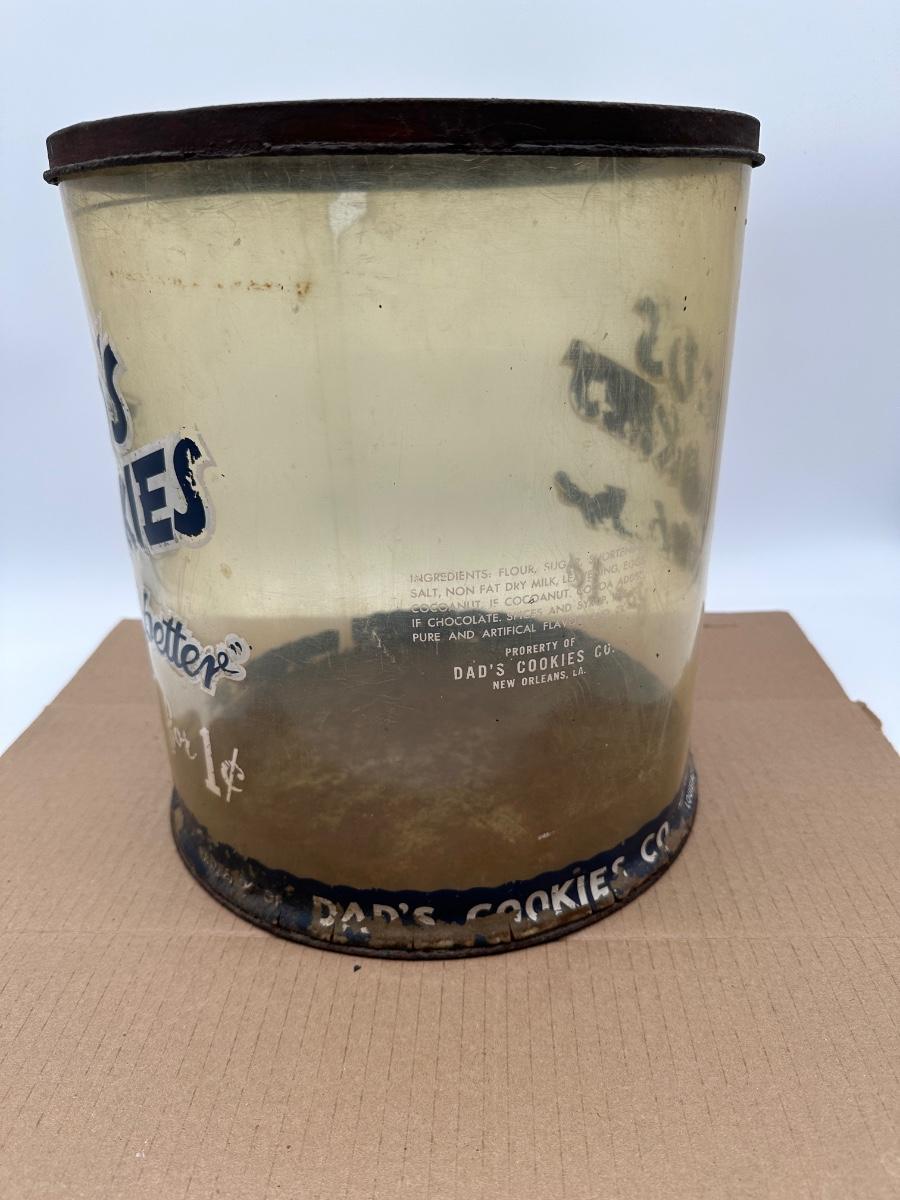 Original vintage Dad’s Cookies store display plastic cookie jar featuring the slogan “Dad’s Cookies are better – 1 for 1¢”. Made of translucent molded plastic with original metal lid. Marked “Property of Dad’s Cookies Co., New Orleans, LA” with ingredient text on the reverse.