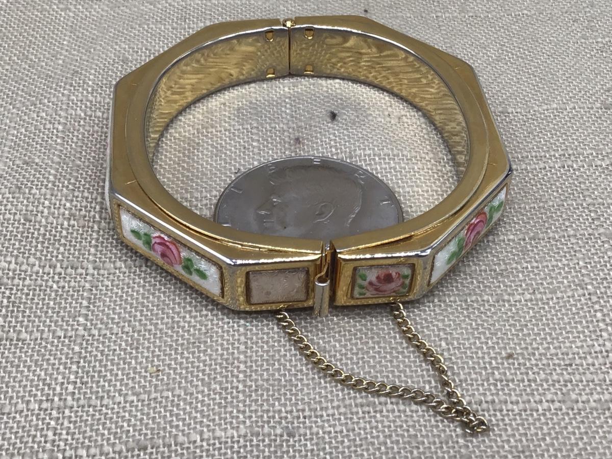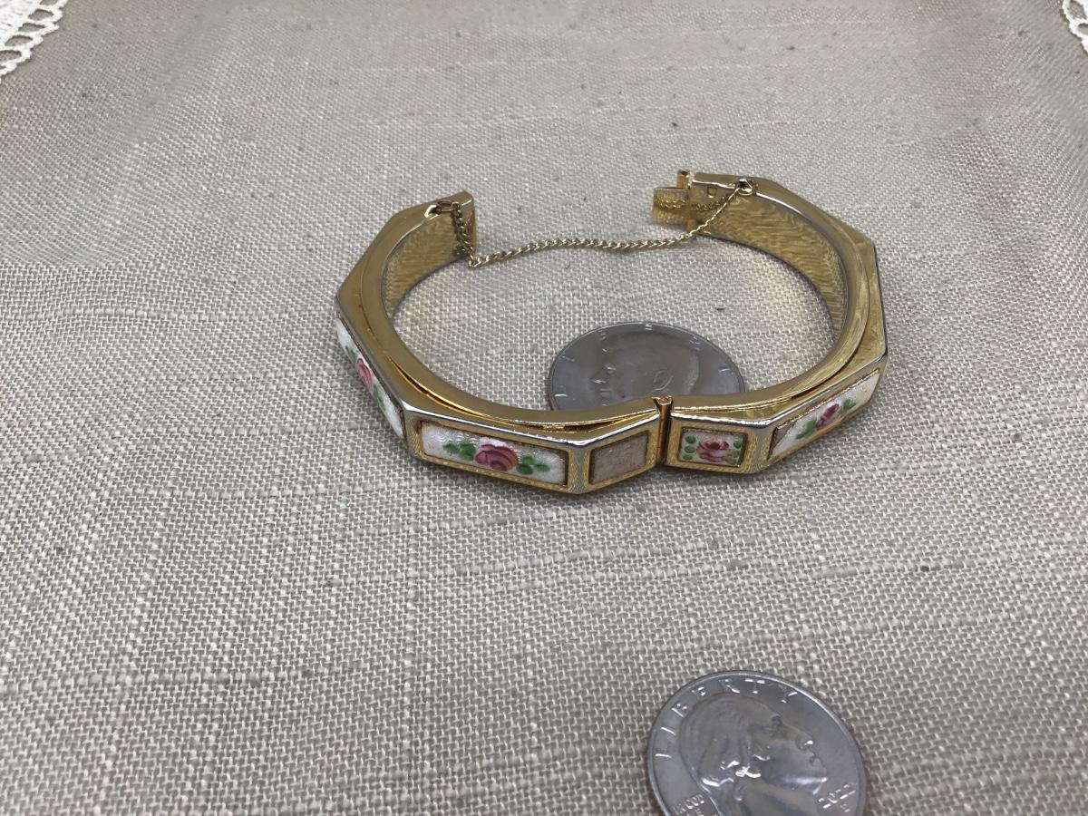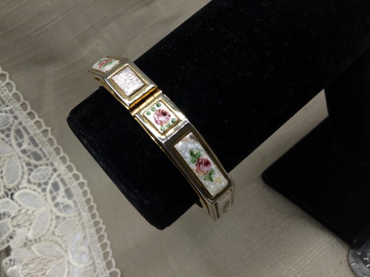 VINTAGE DAINTY PINK ROSE ENAMEL GUILLOCHE HINGE CUFF BRACELET