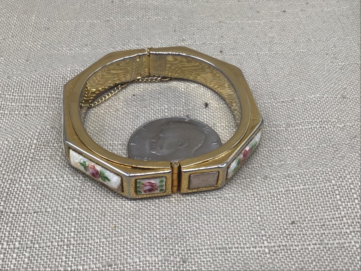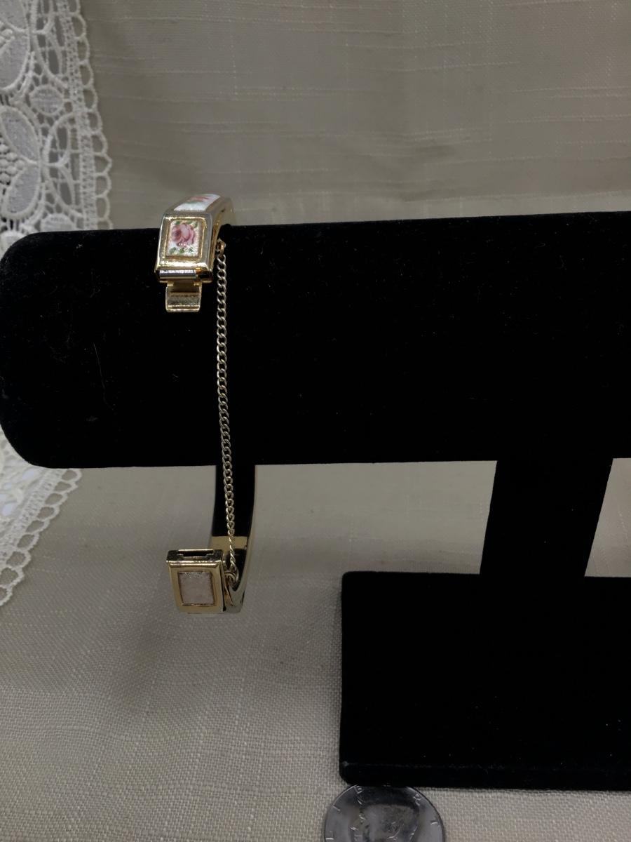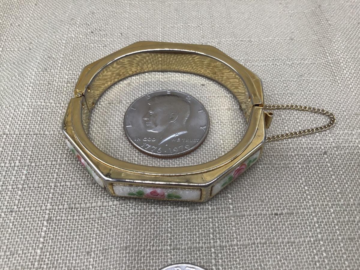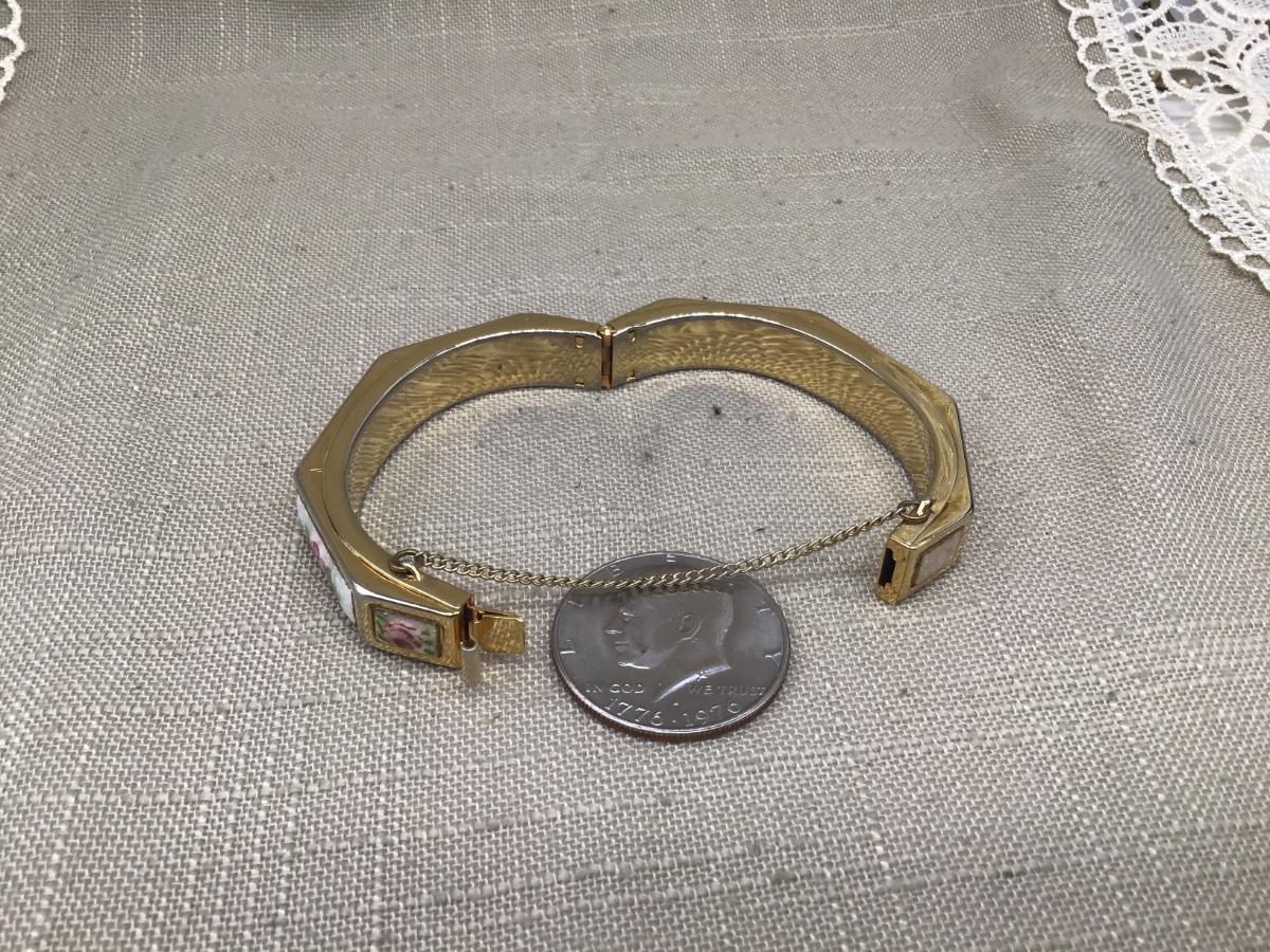 VINTAGE DAINTY PINK ROSE ENAMEL GUILLOCHE HINGE CUFF BRACELET