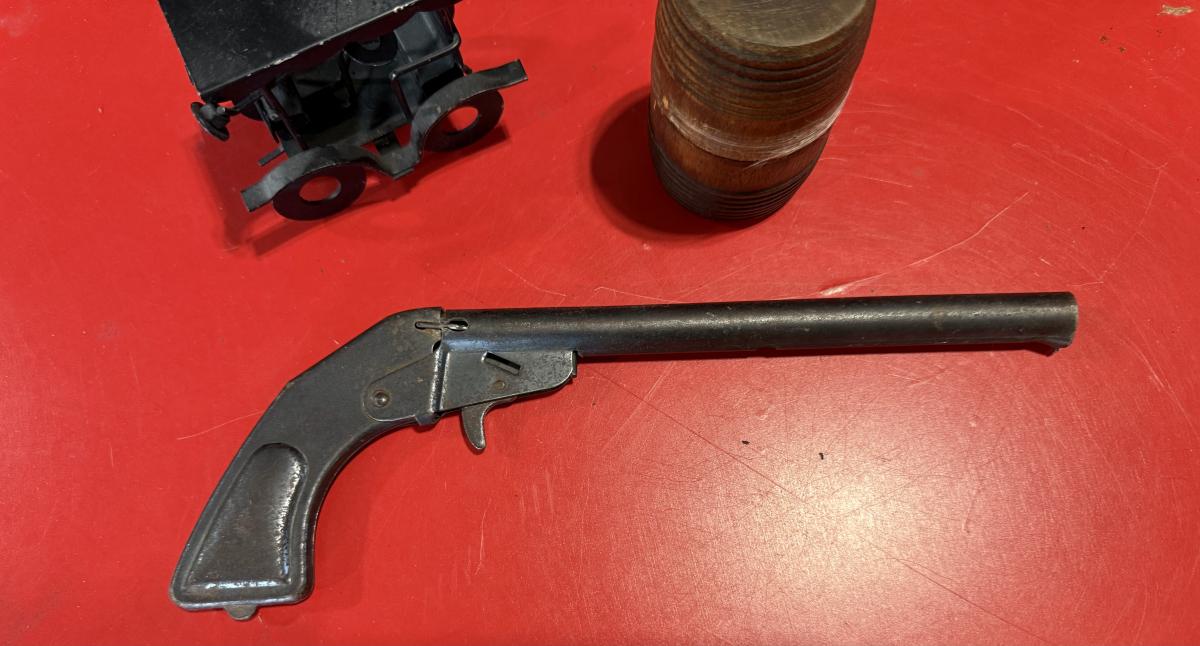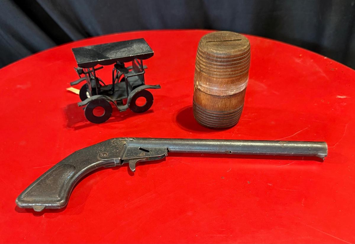 Vintage Daisy Pop Gun, Metal car buggy, Vintage early 1900’s Wooden coin bank