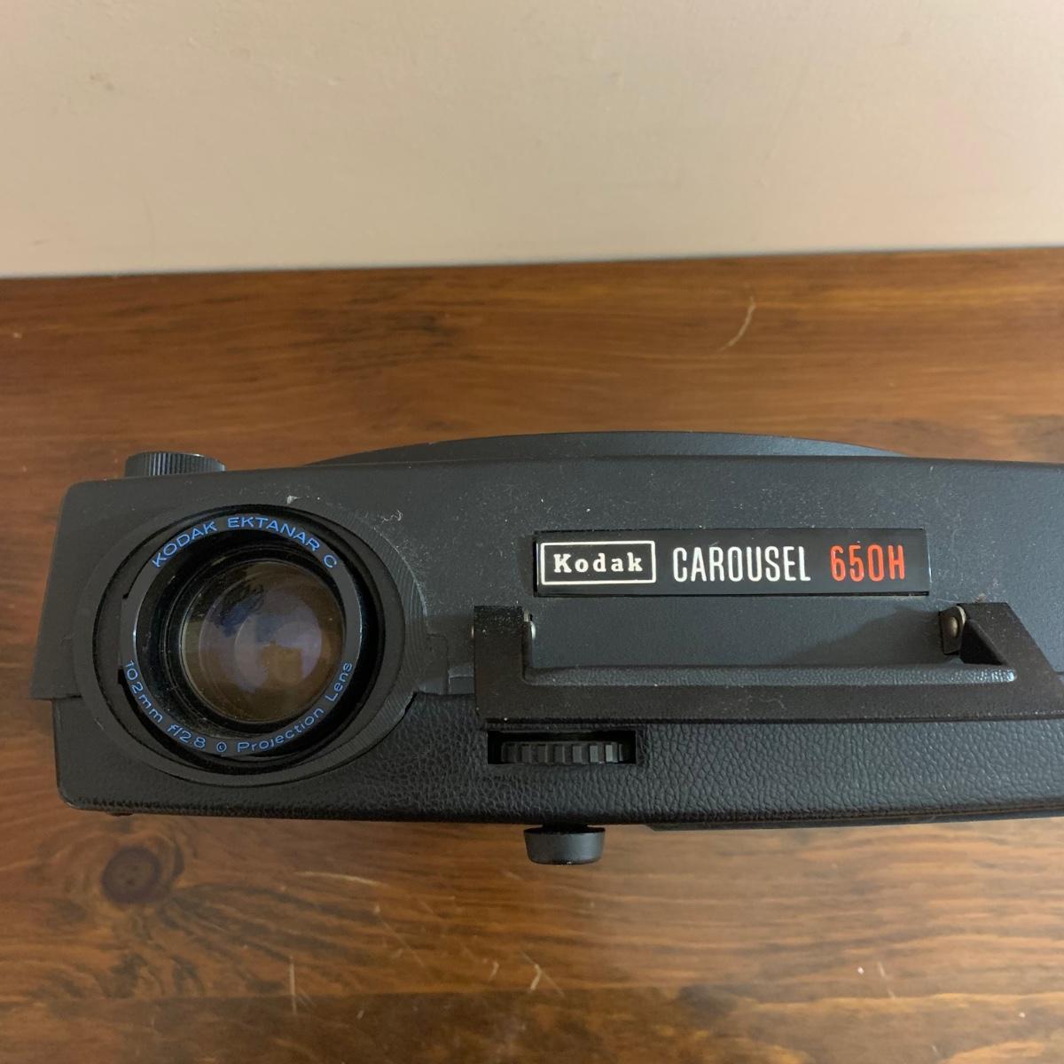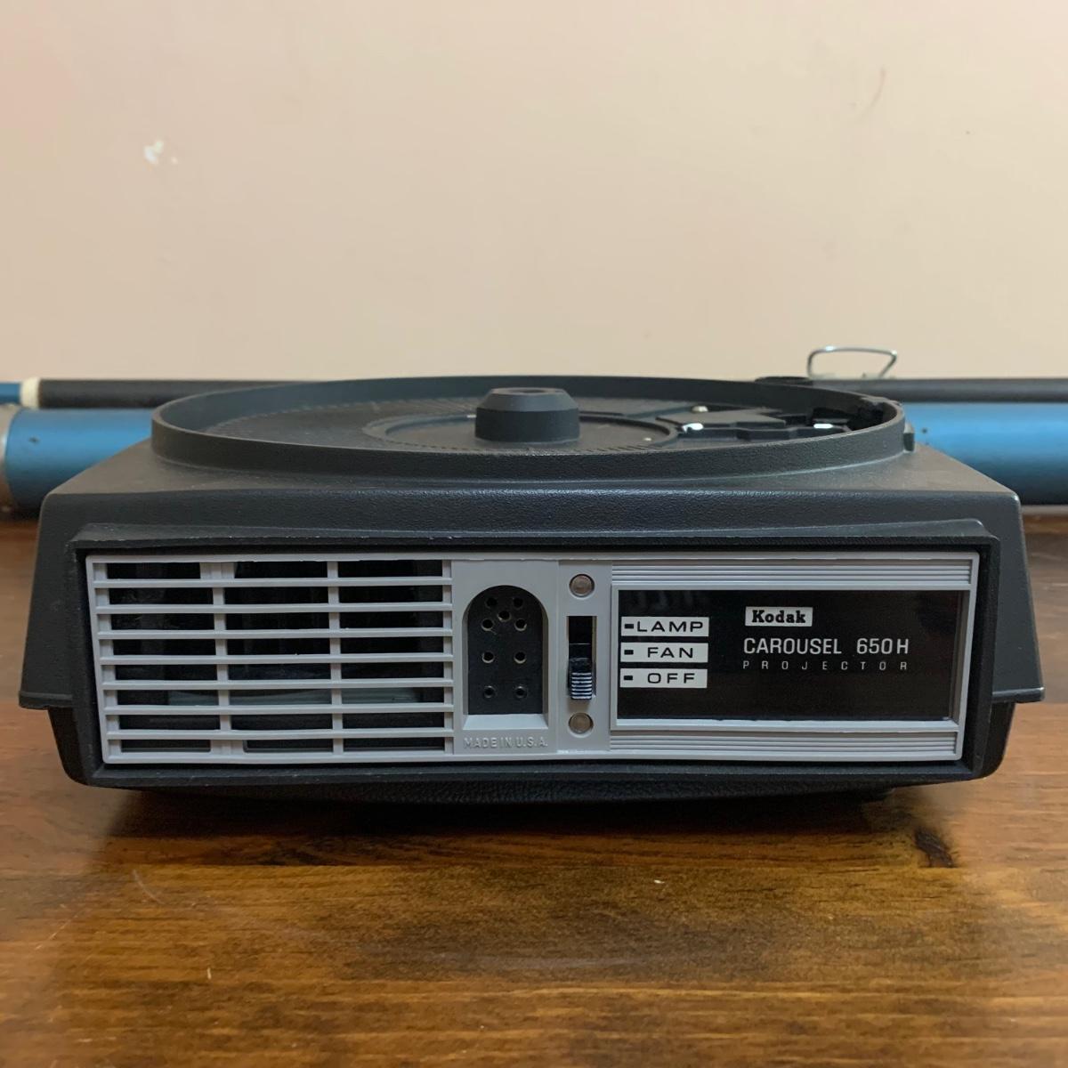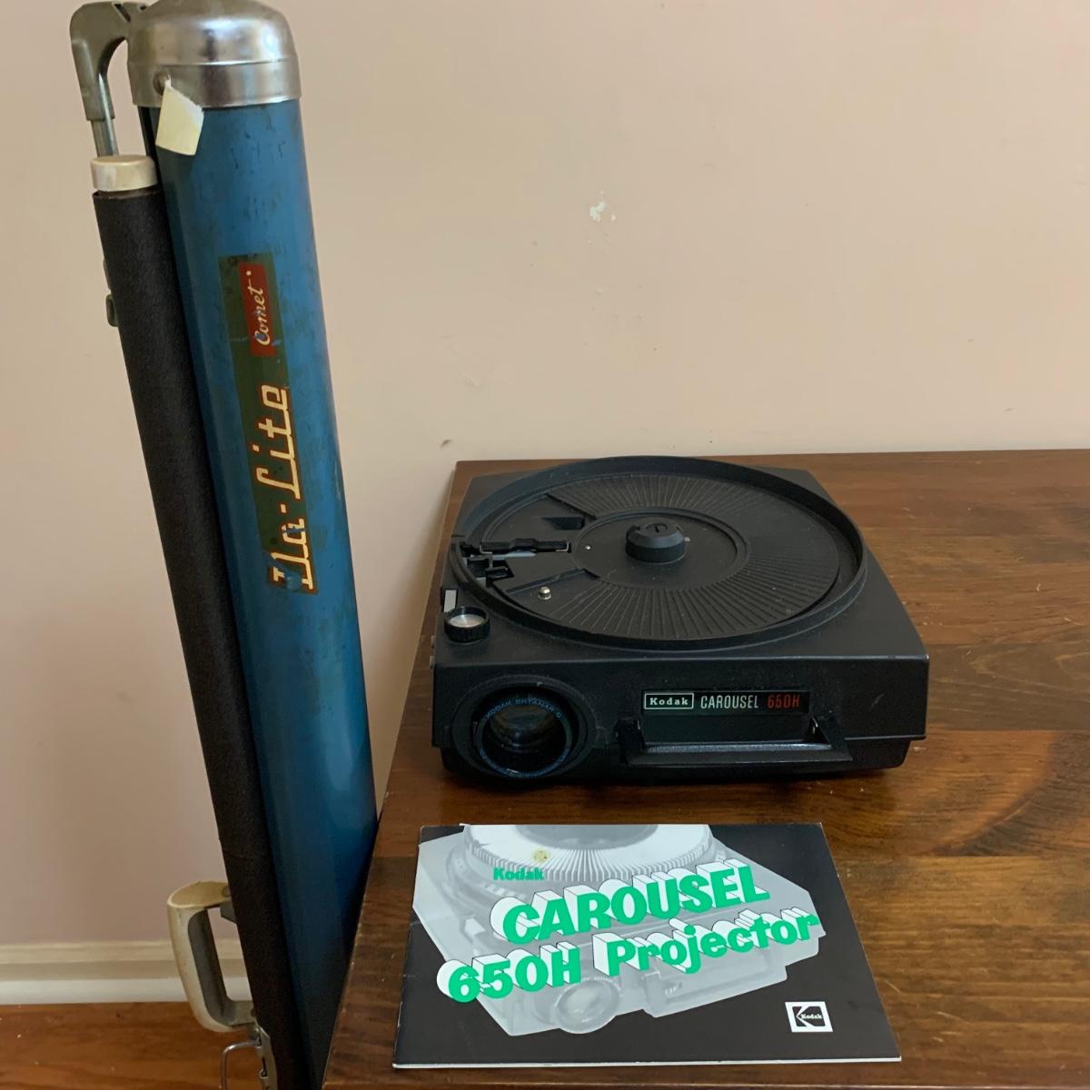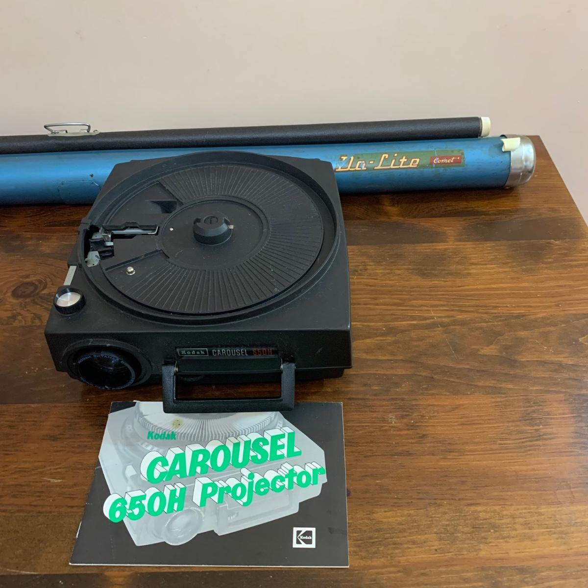 This exciting lot includes a Da-Lite Comet manual protector screen on tripod and Kodak Carousel 650H Projector. Projector screen has some yellowing from time, but collapses easily and is otherwise in good condition. It is missing one foot pad, however this does not cause any balance issues. Kodak Projector powers on and appears to be in good condition. It has a little storage compartment for the electrical wire and a foldable handle for easy transport.