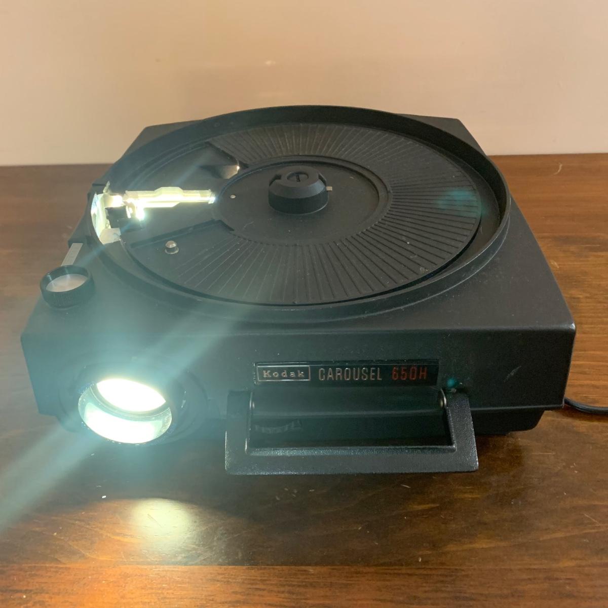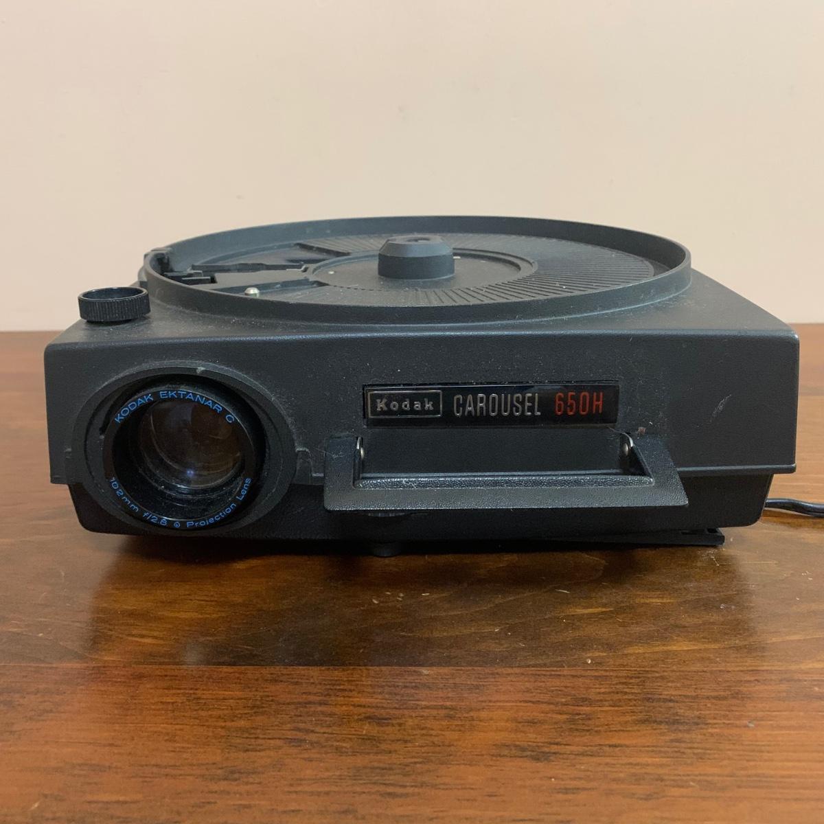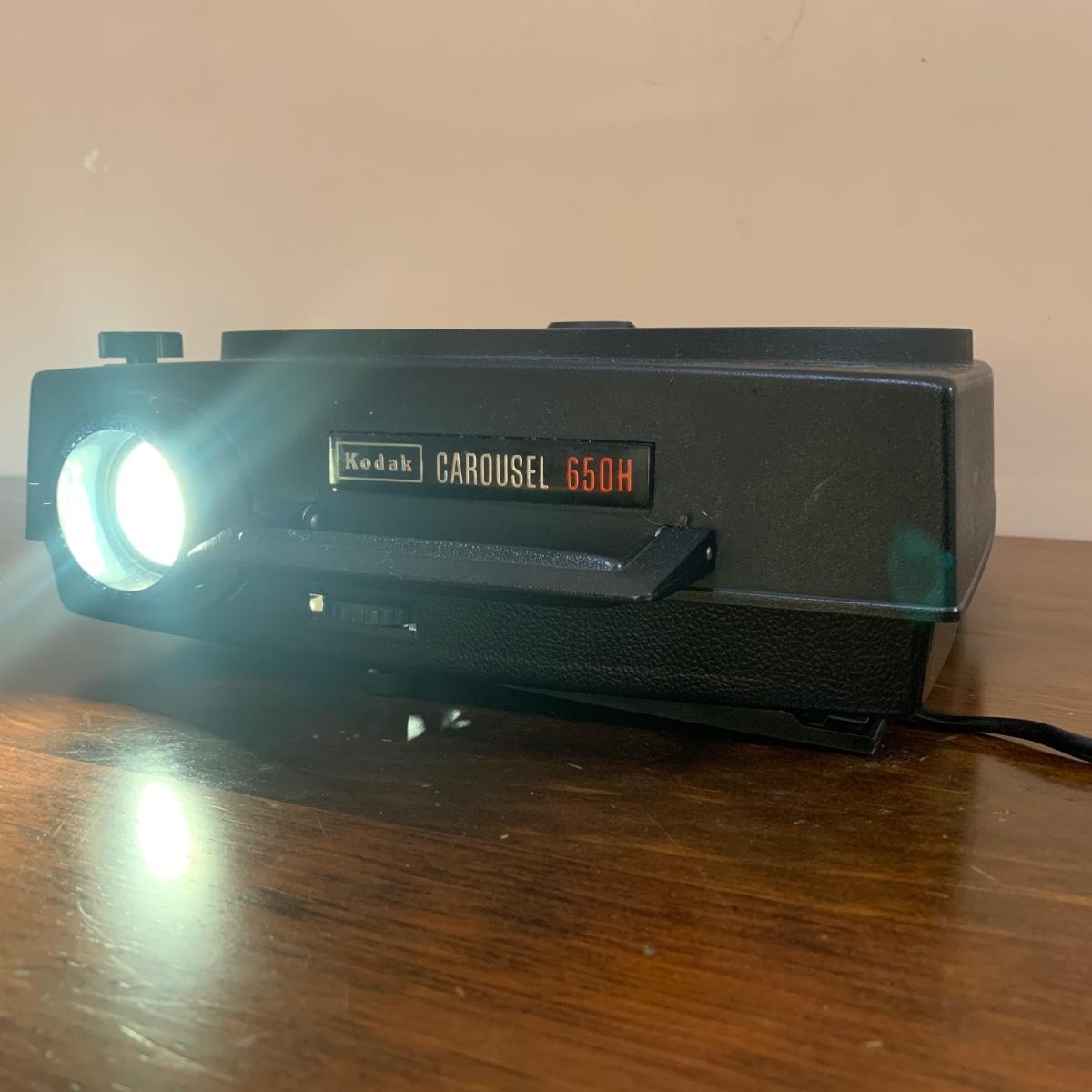 This exciting lot includes a Da-Lite Comet manual protector screen on tripod and Kodak Carousel 650H Projector. Projector screen has some yellowing from time, but collapses easily and is otherwise in good condition. It is missing one foot pad, however this does not cause any balance issues. Kodak Projector powers on and appears to be in good condition. It has a little storage compartment for the electrical wire and a foldable handle for easy transport.