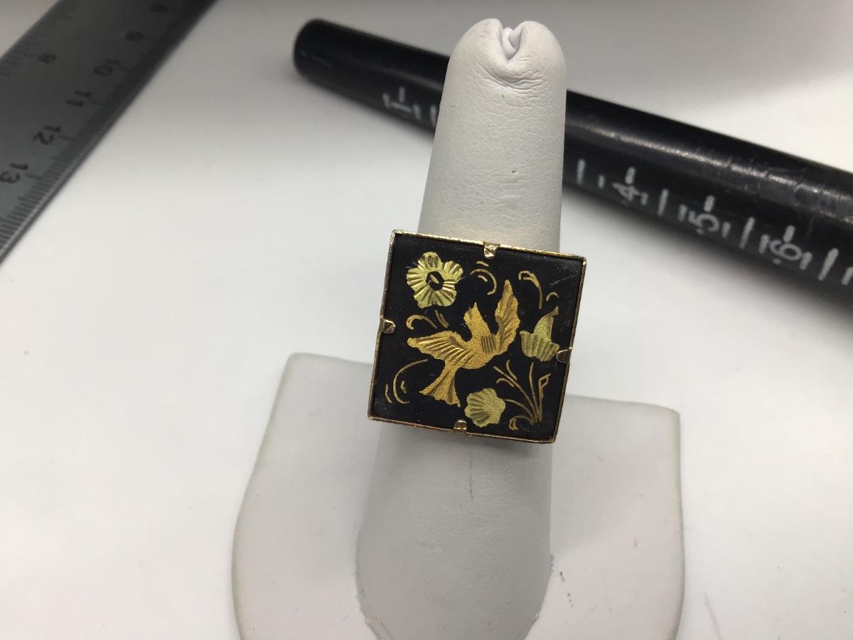 Vintage Damascene Cocktail Statement Ring Adjustable Gold Tone Costume Jewelry
