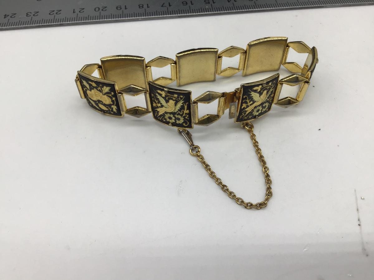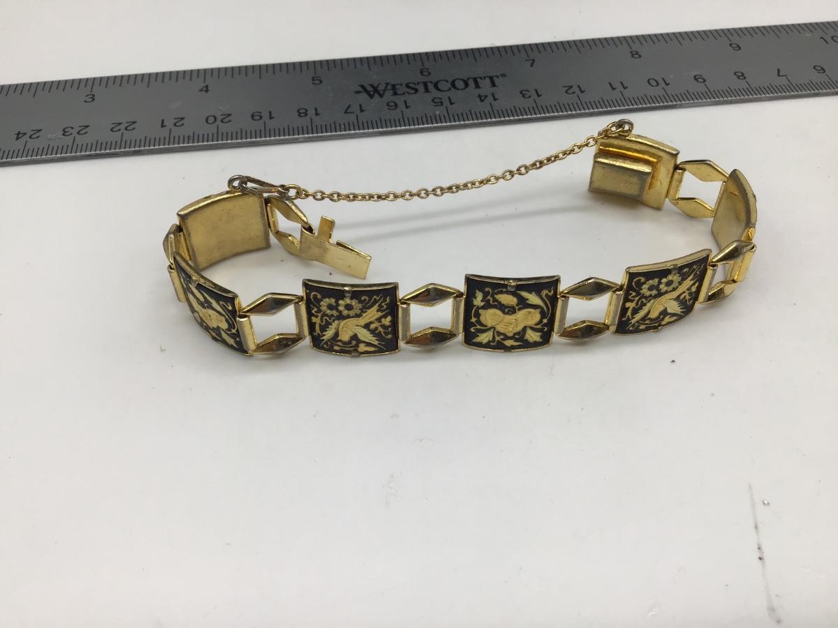 Vintage Damascene Etched Black Gold Plate Bird Flower Floral Link Bracelet