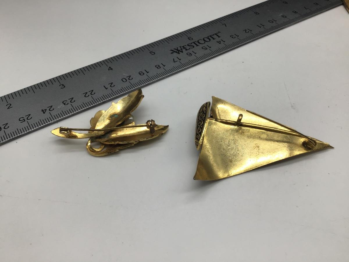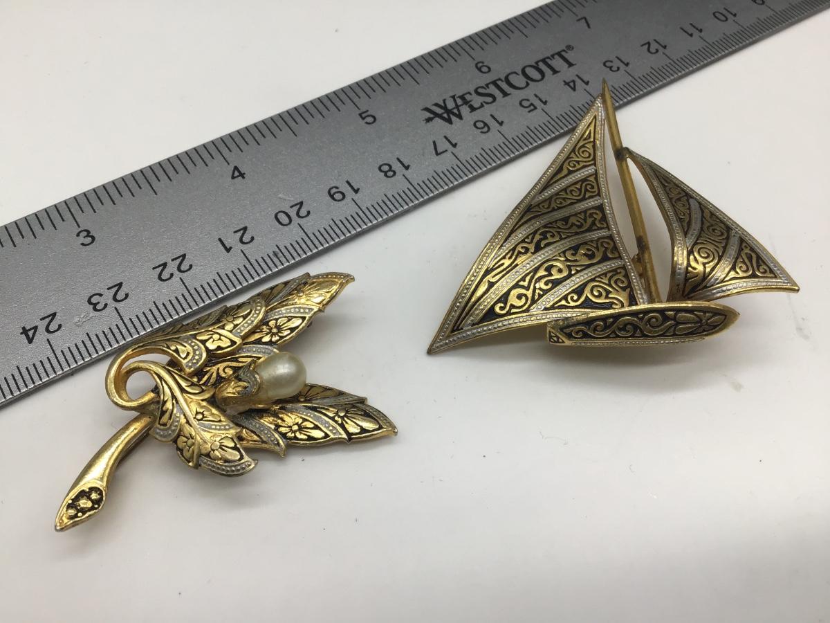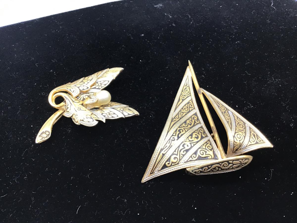 Vintage Damascene Spanish Brooch And Pearl Brooch