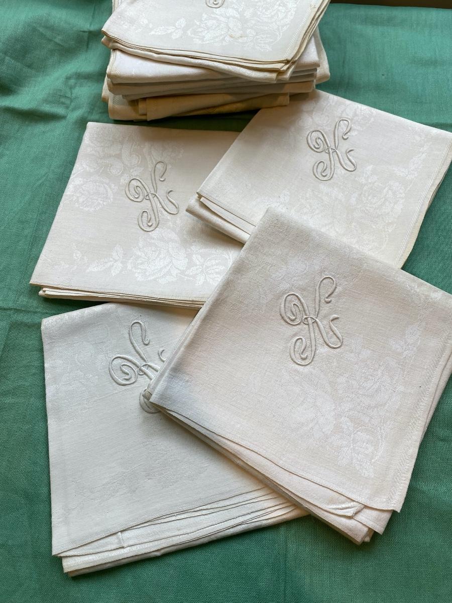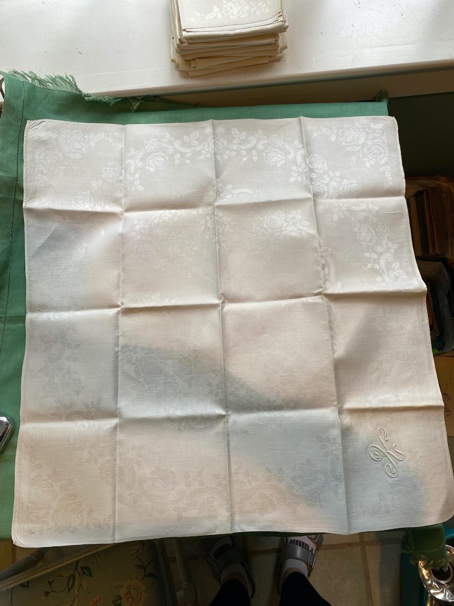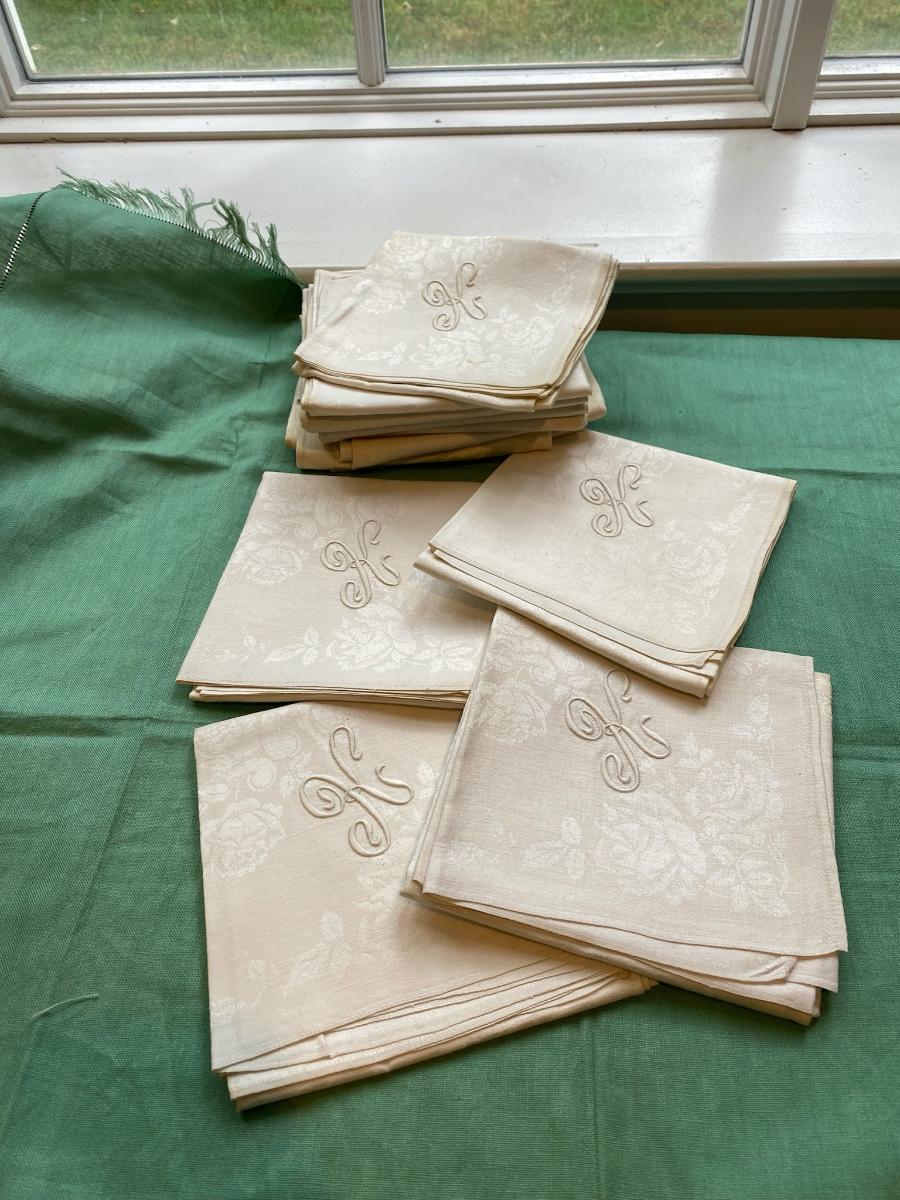 This Set of 12 damask dinner napkins are from the home of Dr. Paul Francis Kerr, Beautiful rose motif with the monogram K. Own a piece of history from a renoun mineral geologist. 25" X 27" Some yellowing on corners and minimal show of use.